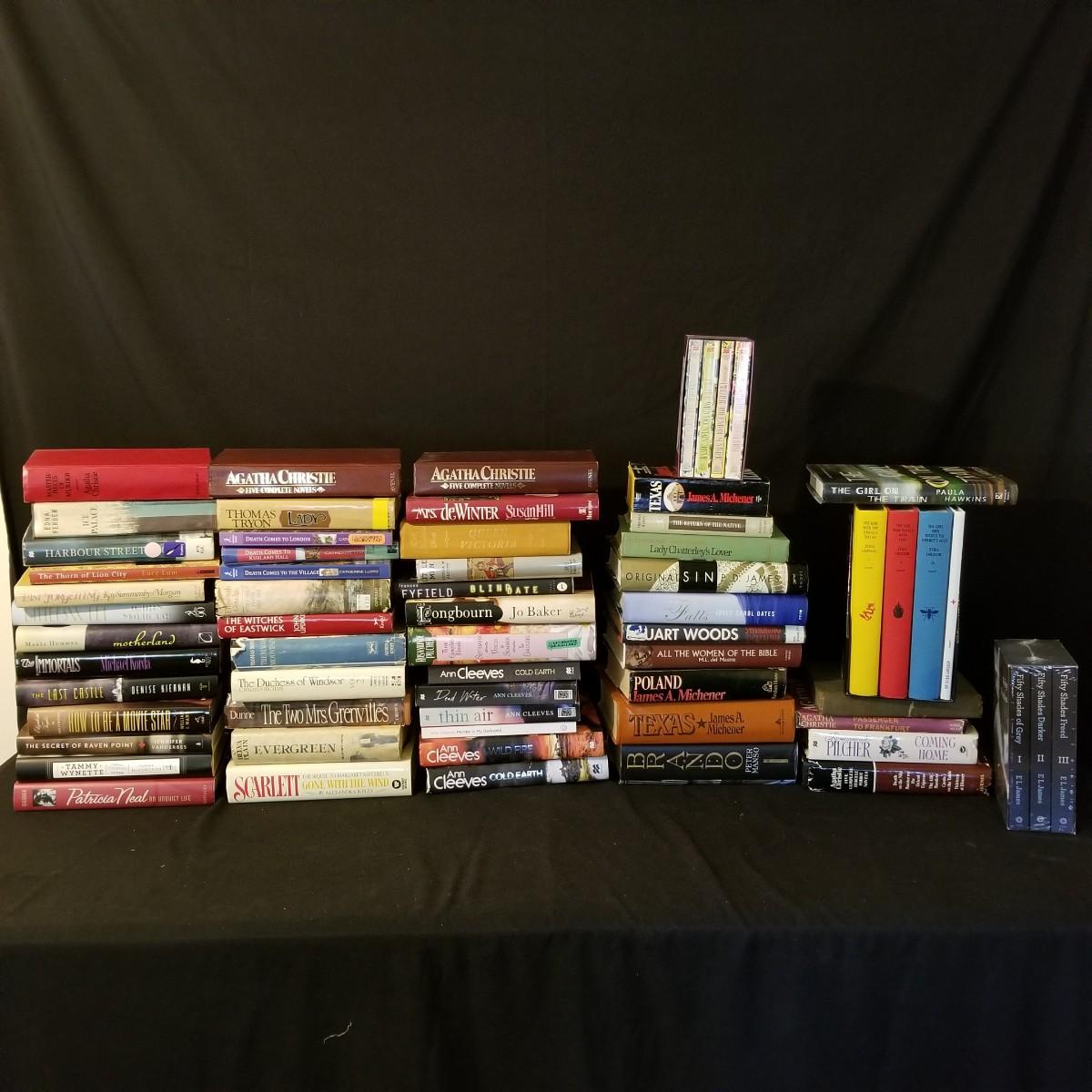 A collection of fifty plus fiction novels and sets, a majorityare hardback, butnthere are a few paperbackin the lot. Some of the authors include: James Michenet, Rosamund Pilcher, Ann Cleeves, and many more. See photos for full inventory. Local pickup only.
