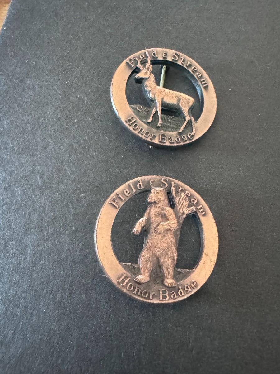 Field & Stream Honor Badges, one featuring a deer and the other a bear.