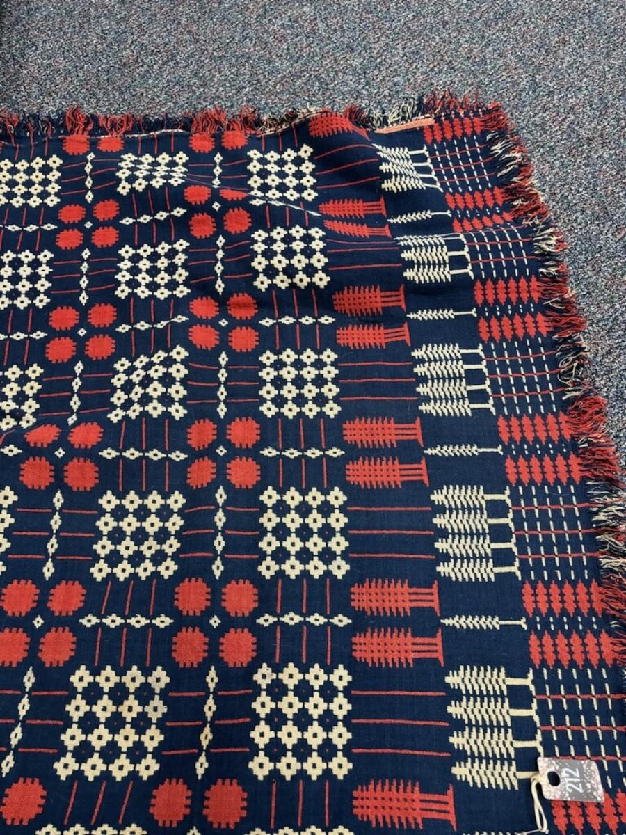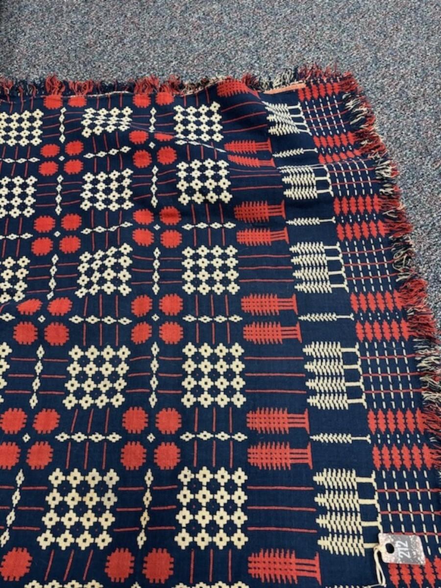 Beautiful piece of 19th Century antique loom woven jacquard. The colors reflect a rich old palette of deep indigo blue and salmon. Excellent condition. Retailing at $732.00