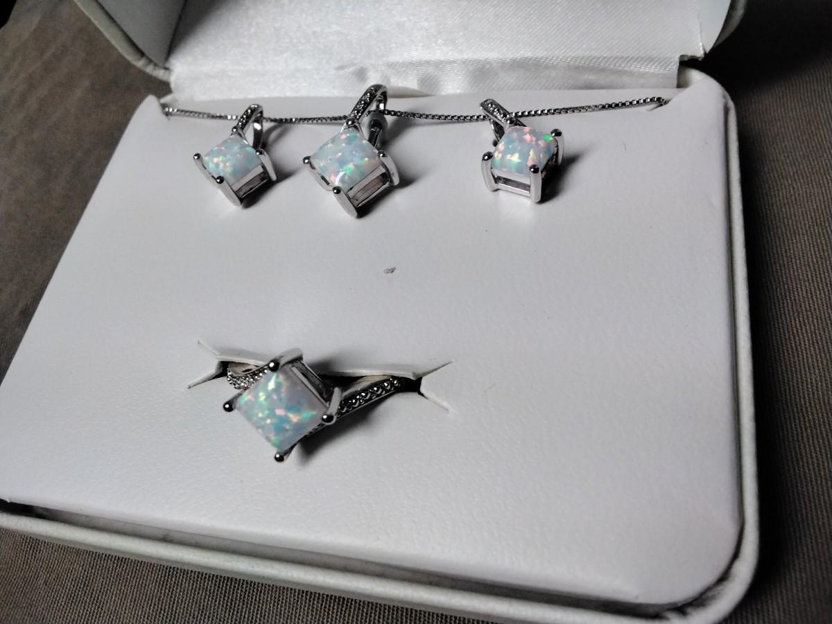 This set is brand new still in original packing box from the factory circa 1950s warehouse purchase. All sterling silver solid heavy cast findings with a sterling silver box chain measuring 18 inches long. The ring is size 7 and can be resized. The opals have TONS of fire and are 7mm squares on the ring and pendant and 6mm on the earrings. I got two sets and kept one! (I used mine for the photos out of the box) These are soooo nice, you will be very pleased, don't let it get away!!