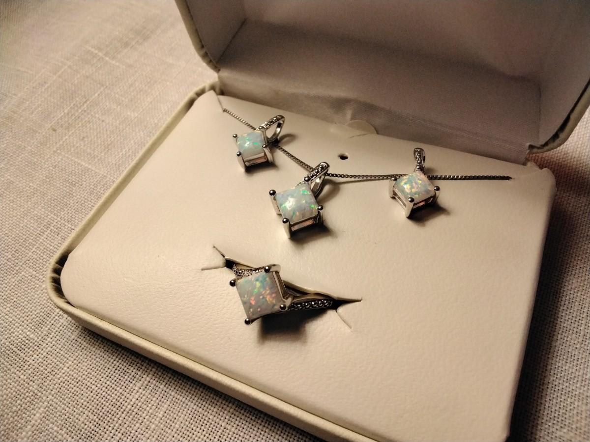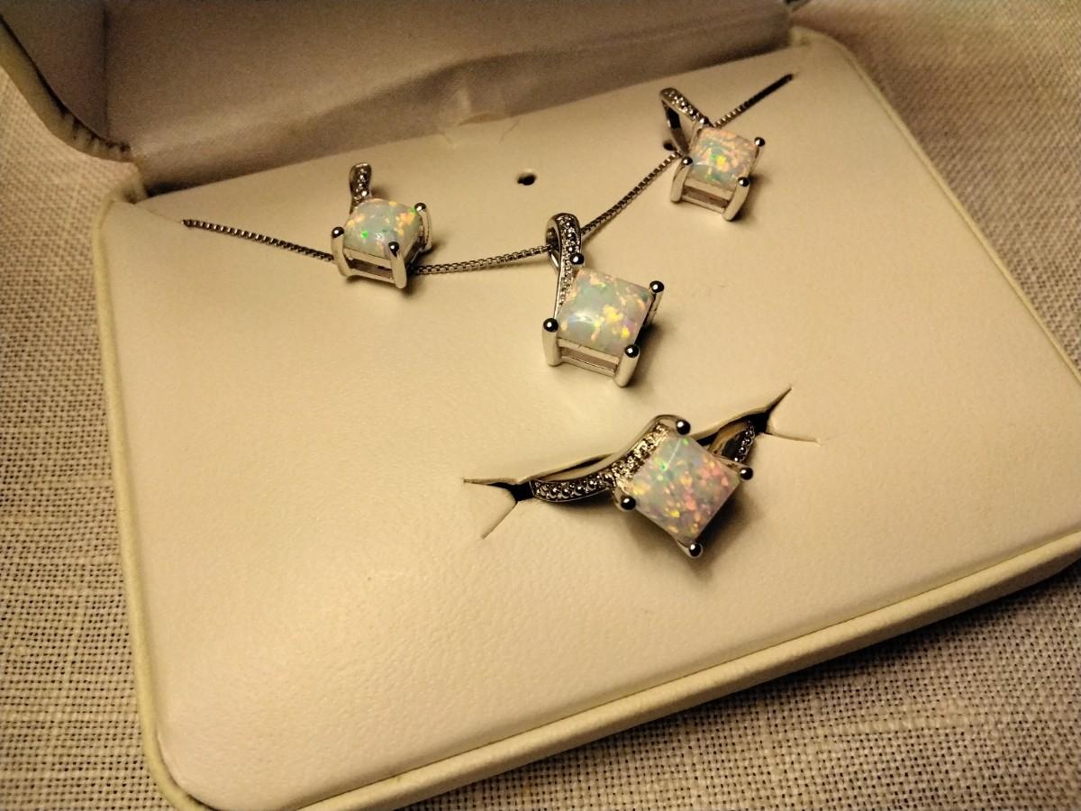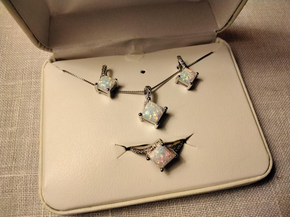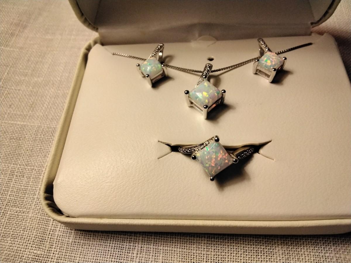 This set is brand new still in original packing box from the factory circa 1950s warehouse purchase. All sterling silver solid heavy cast findings with a sterling silver box chain measuring 18 inches long. The ring is size 7 and can be resized. The opals have TONS of fire and are 7mm squares on the ring and pendant and 6mm on the earrings. I got two sets and kept one! These are soooo nice, you will be very pleased, don't let it get away!!