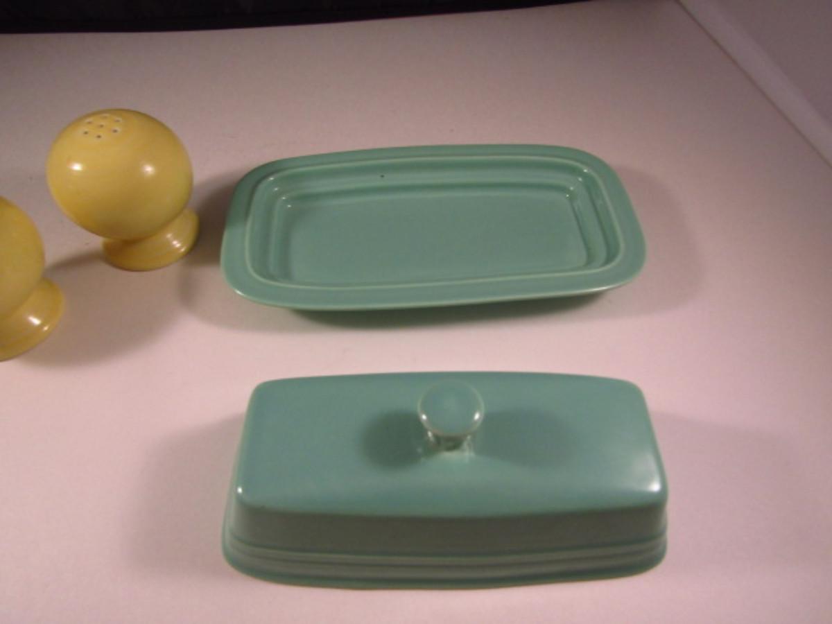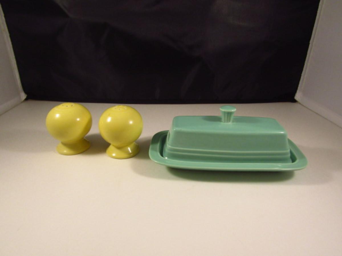 Fiesta Salt and Pepper Shakers and Butter Dish. In used condition.