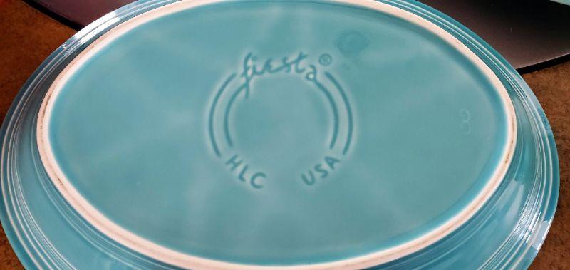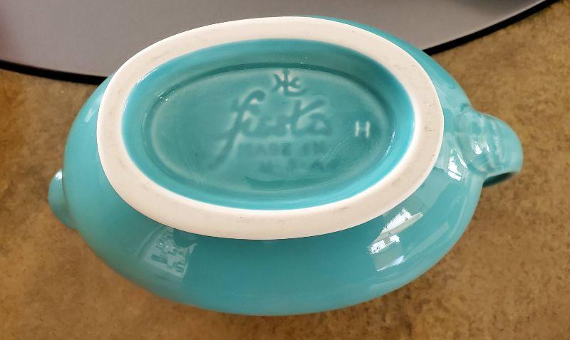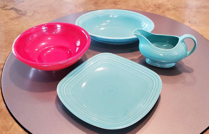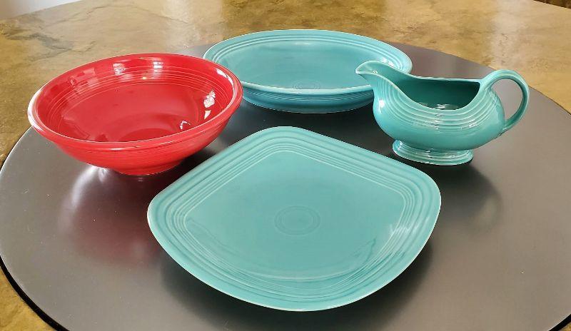 Fiesta Ware Lot 2 (includes: one small square turquoise serving platter, one medium oval turquoise serving dish, one medium red serving bowl, one turquoise gravy boat)