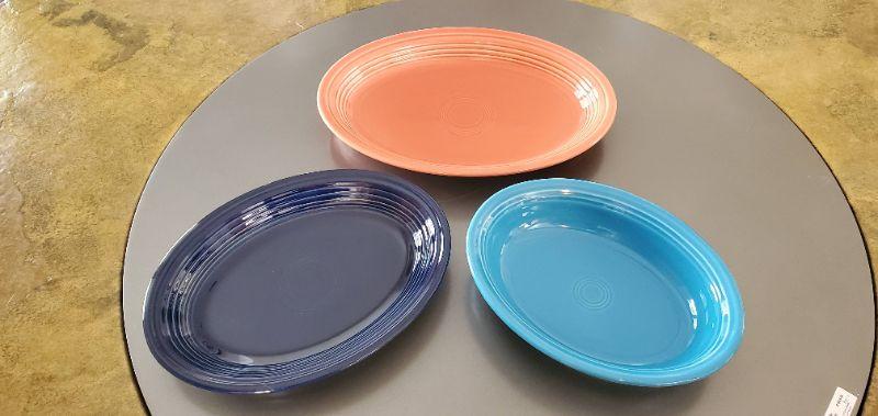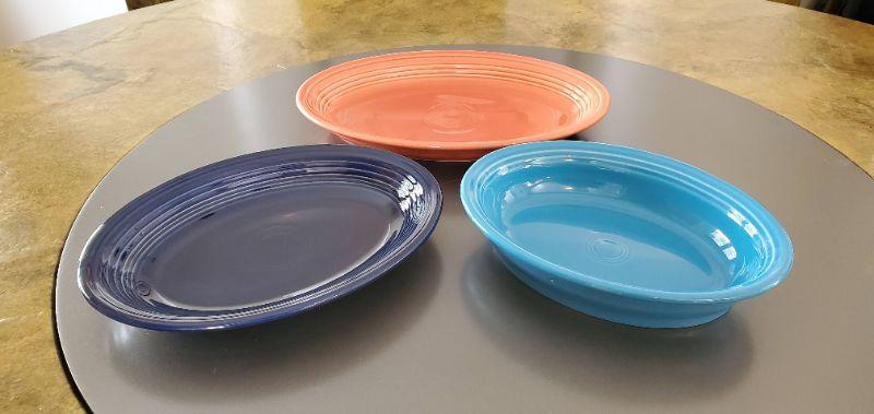 Fiesta Ware Lot 4 (includes: one large earth red oval serving platter, one medium cobalt serving platter, one medium light blue oval serving dish)