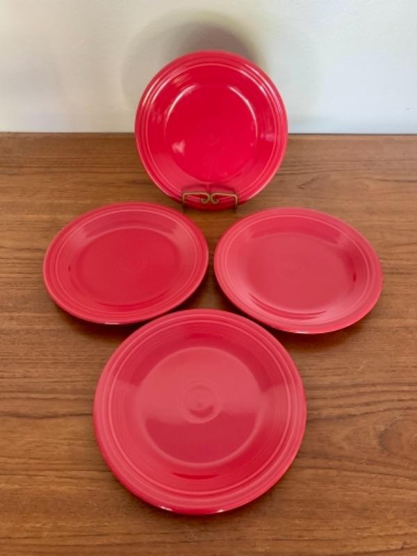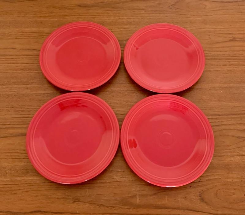 Set of 4, Homer Laughlin Fiesta Ware dinner plates in Scarlet. Light utensil marks, no chips, cracks or repairs notes.