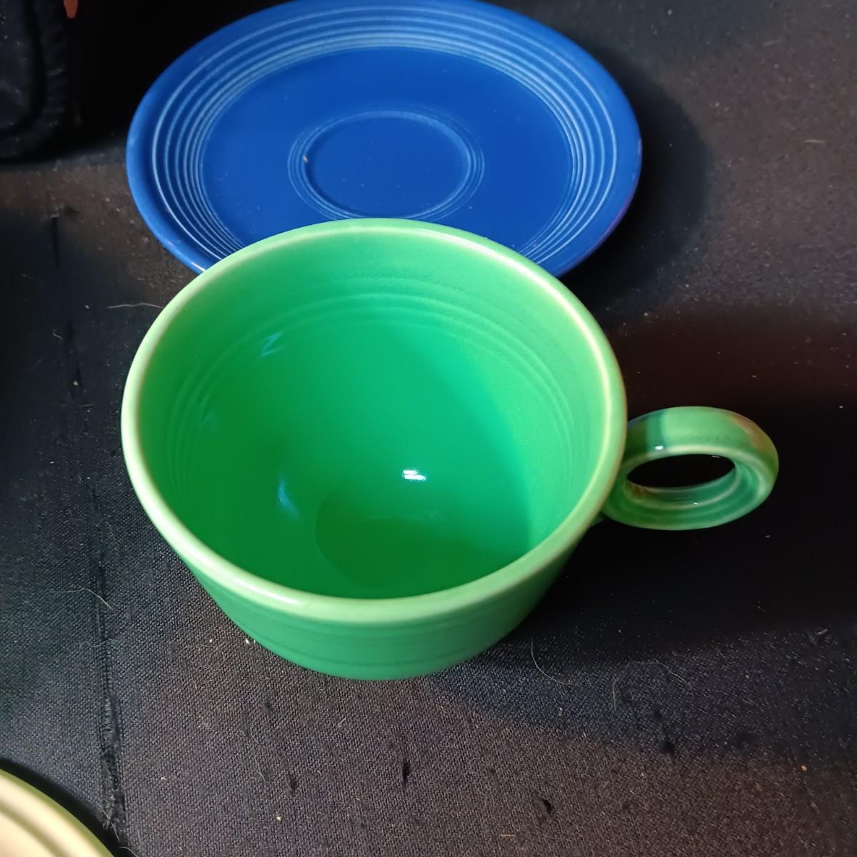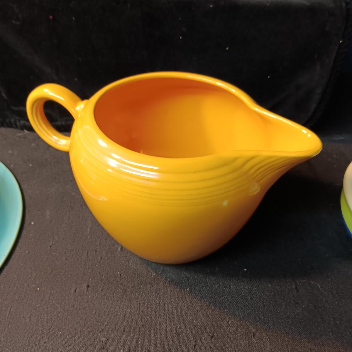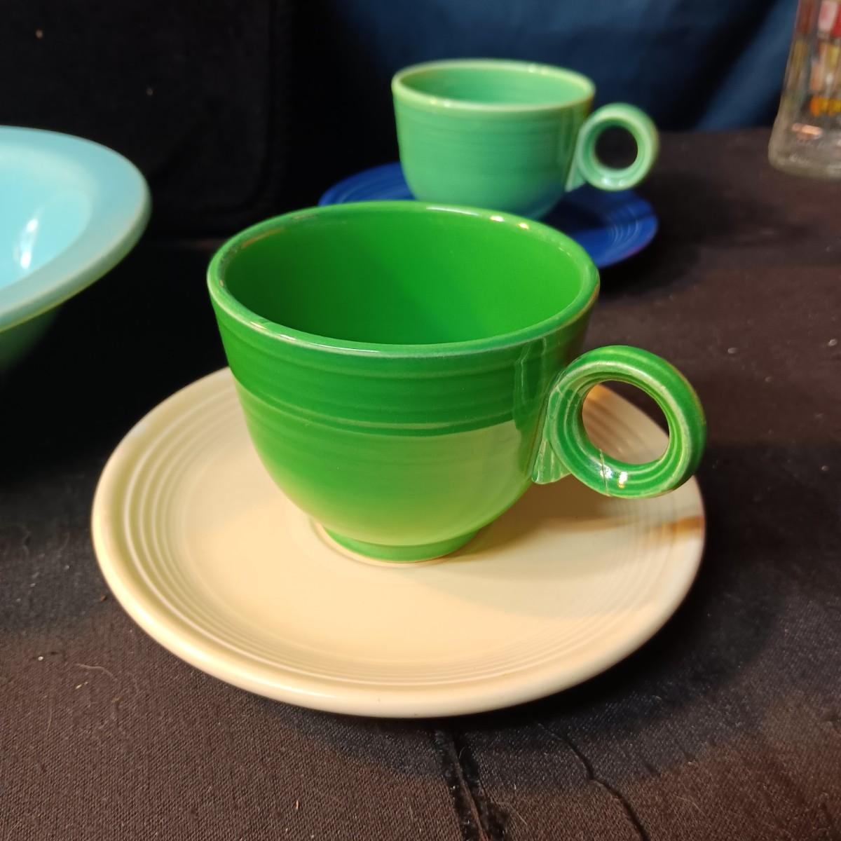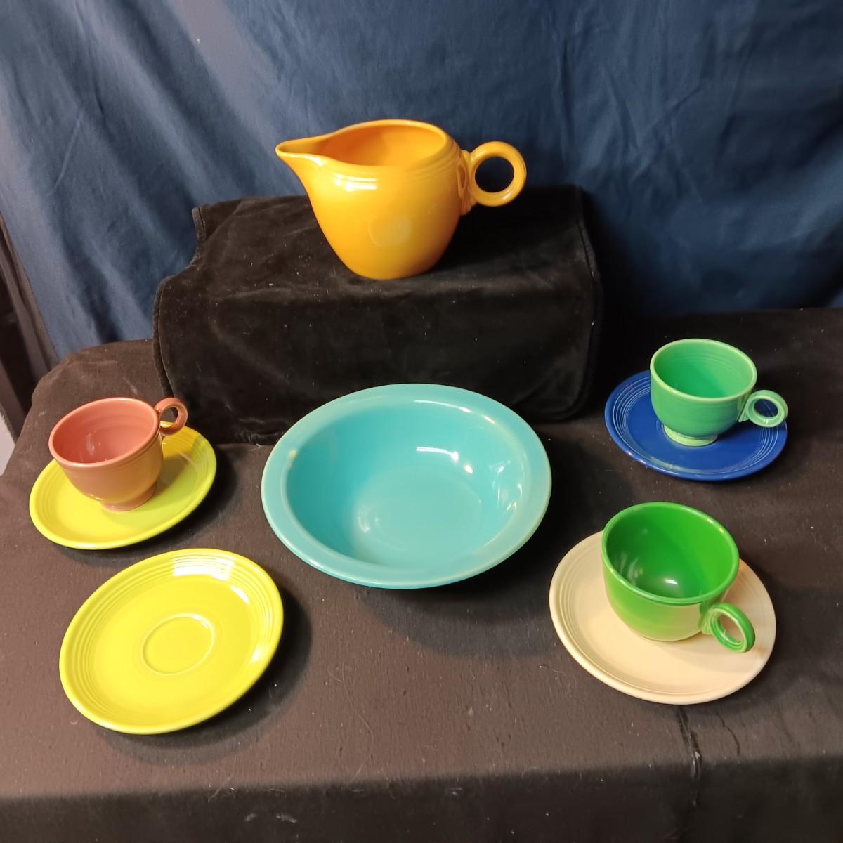 FIESTAWARE CUPS AND SAUCERS, COMPOTE, SERVING BOWL & 2 PINT JUG