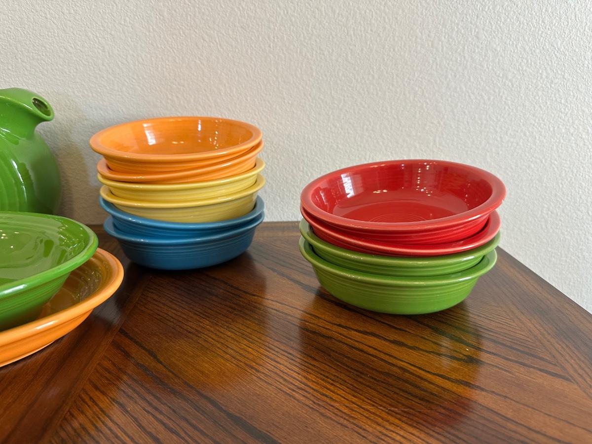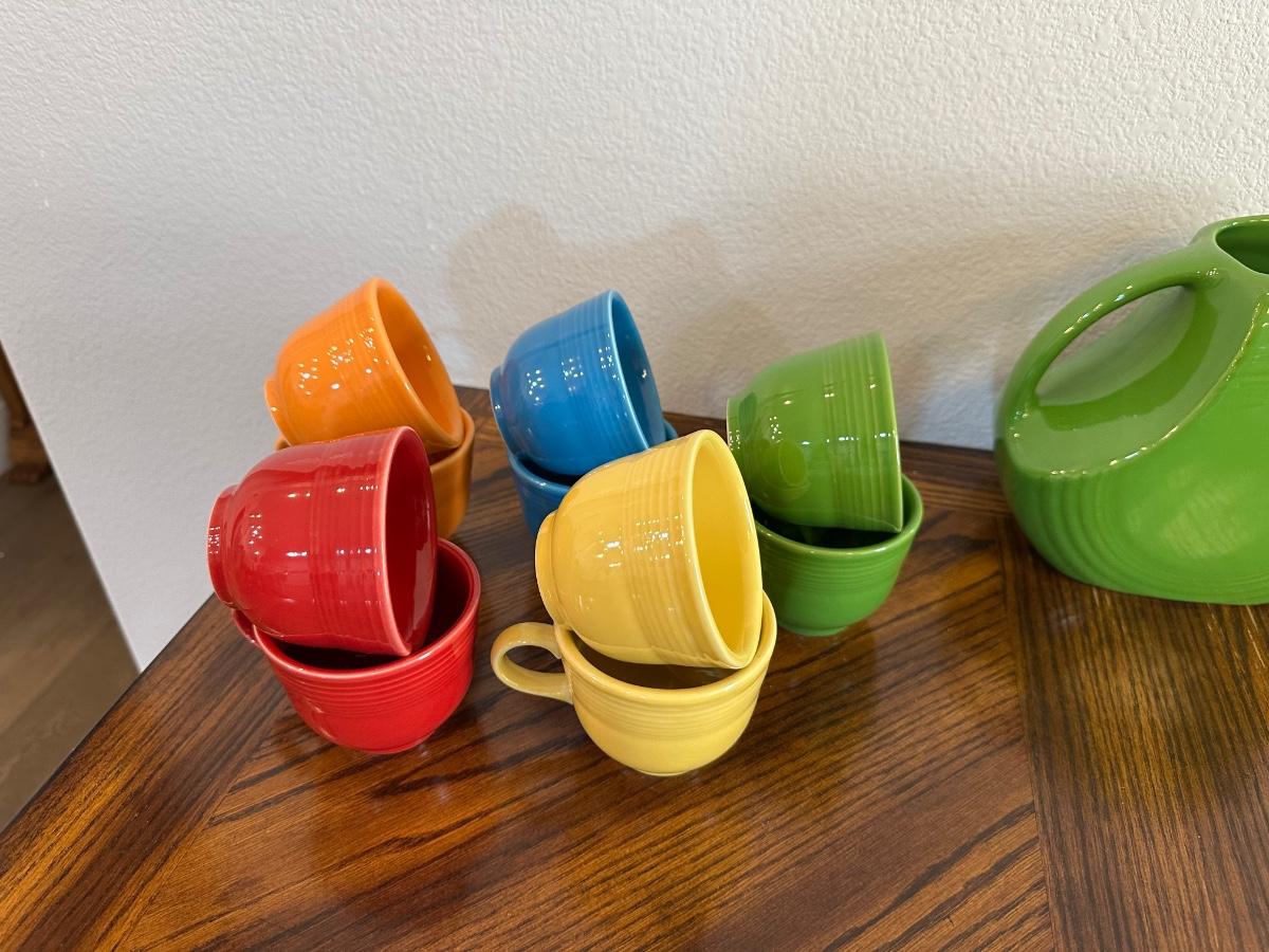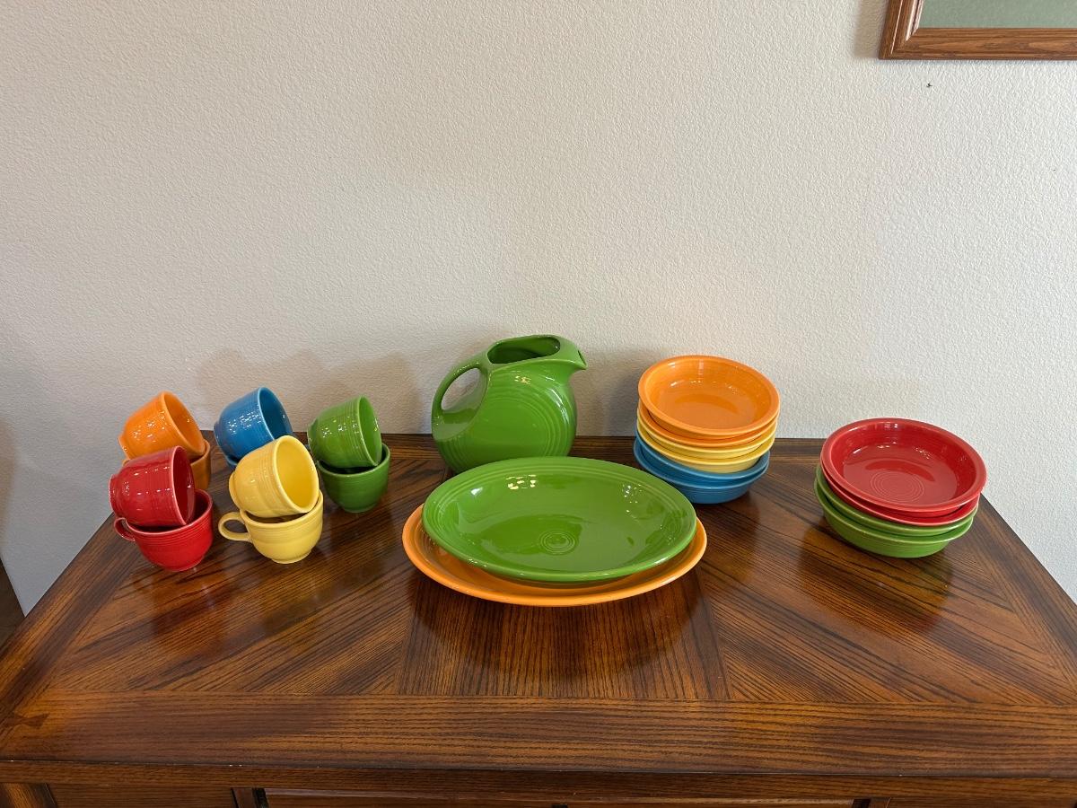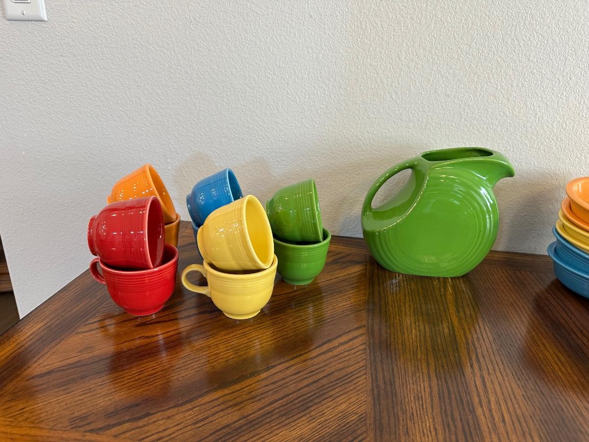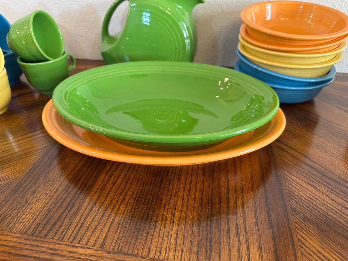 FIESTAWARE CUPS/SAUCERS, PITCHER, BOWLS AND PLATTERS