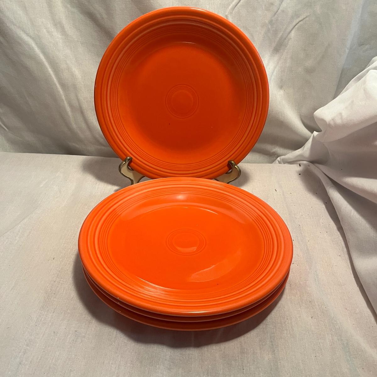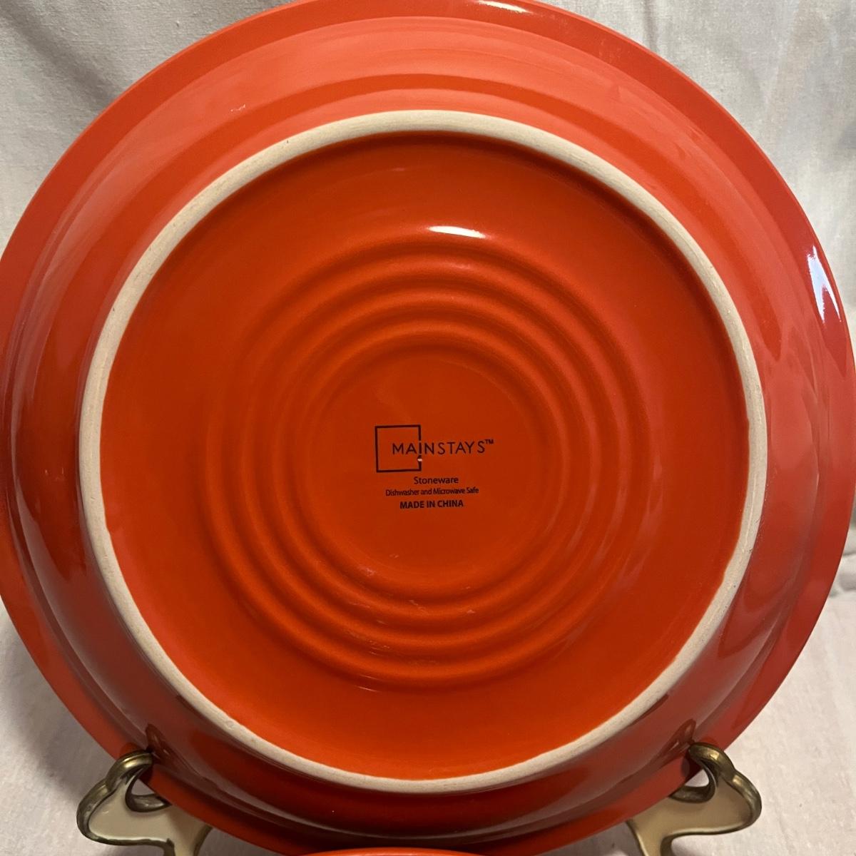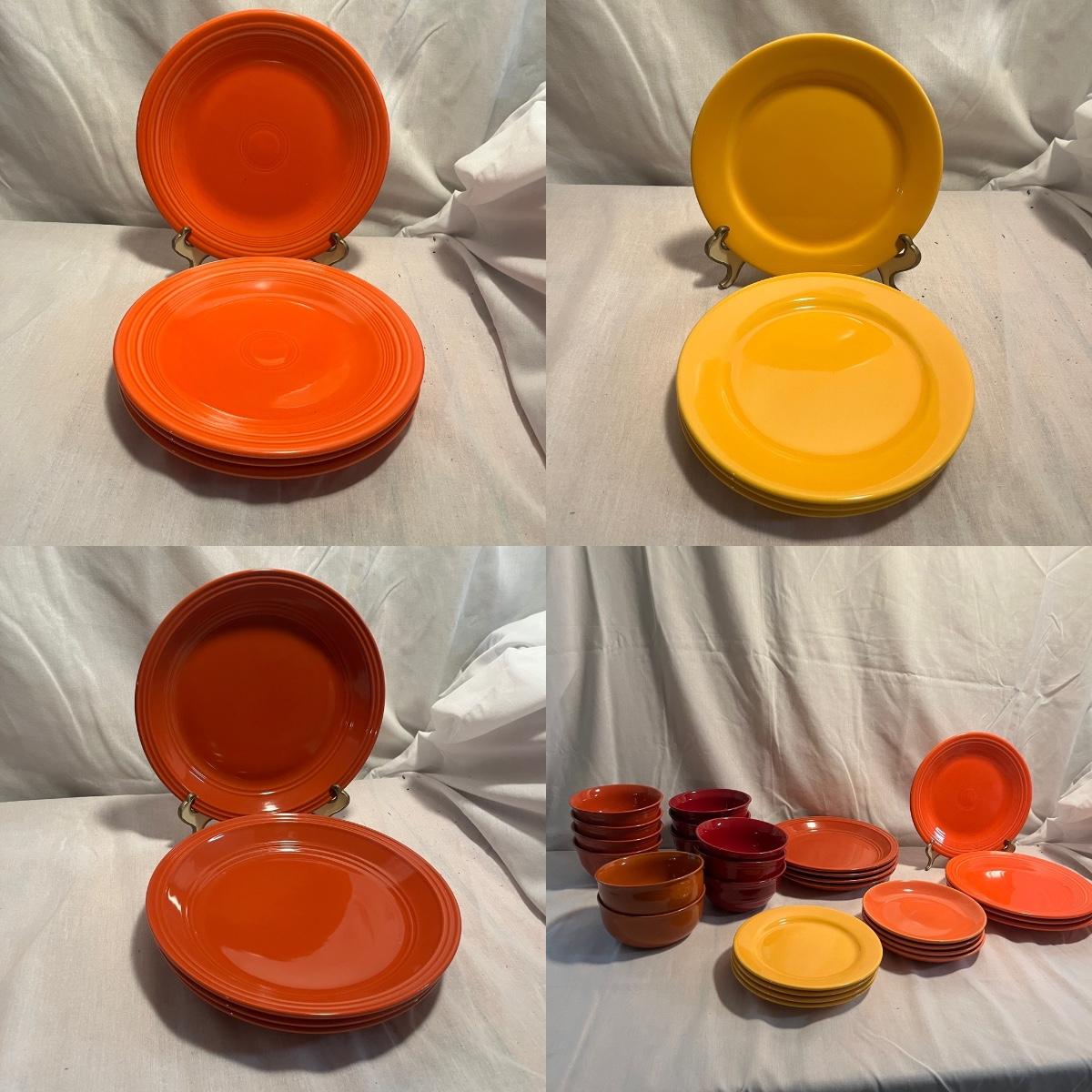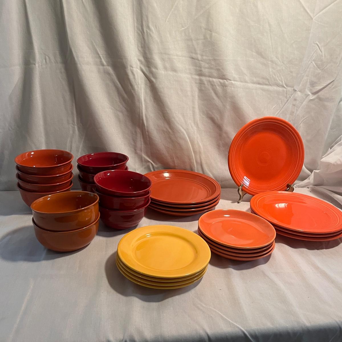 Lot includes four Fiestaware plates, 10 Mainstay bowls, four Mainstay plates, four Waechtersbach plates, four unmarked plates and two Royal Norfolk bowls. Fiestaware plates measure 10.5”D.
