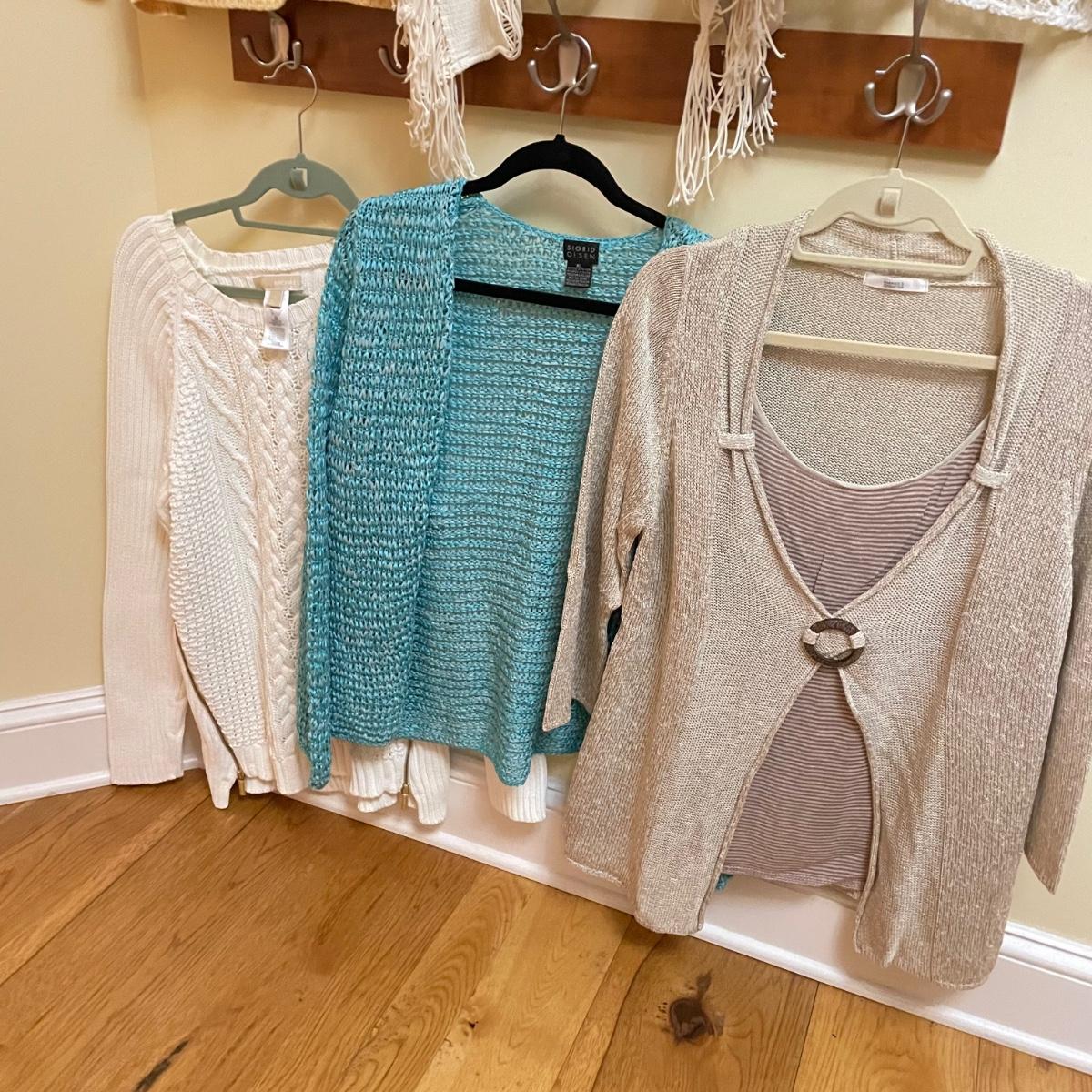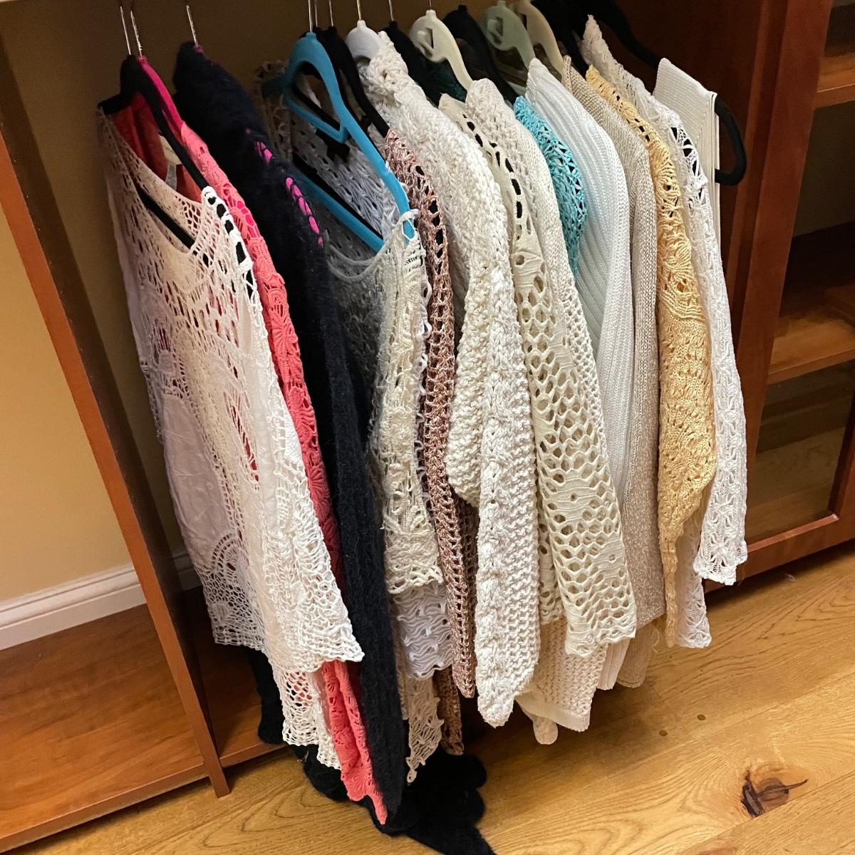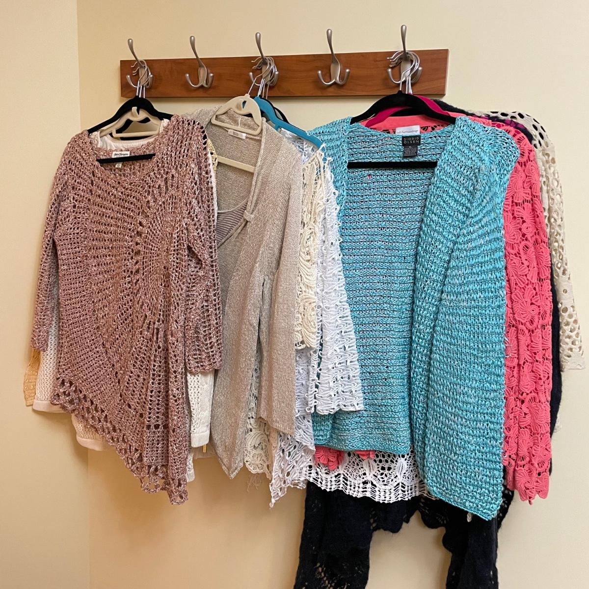 A collection of 15 knit tops ranging from casual to elegant in a variety of colors. Brands include Norm Thompson, Rico, Blue Willis, Marks & Spencer and More. See images. Shipping available.