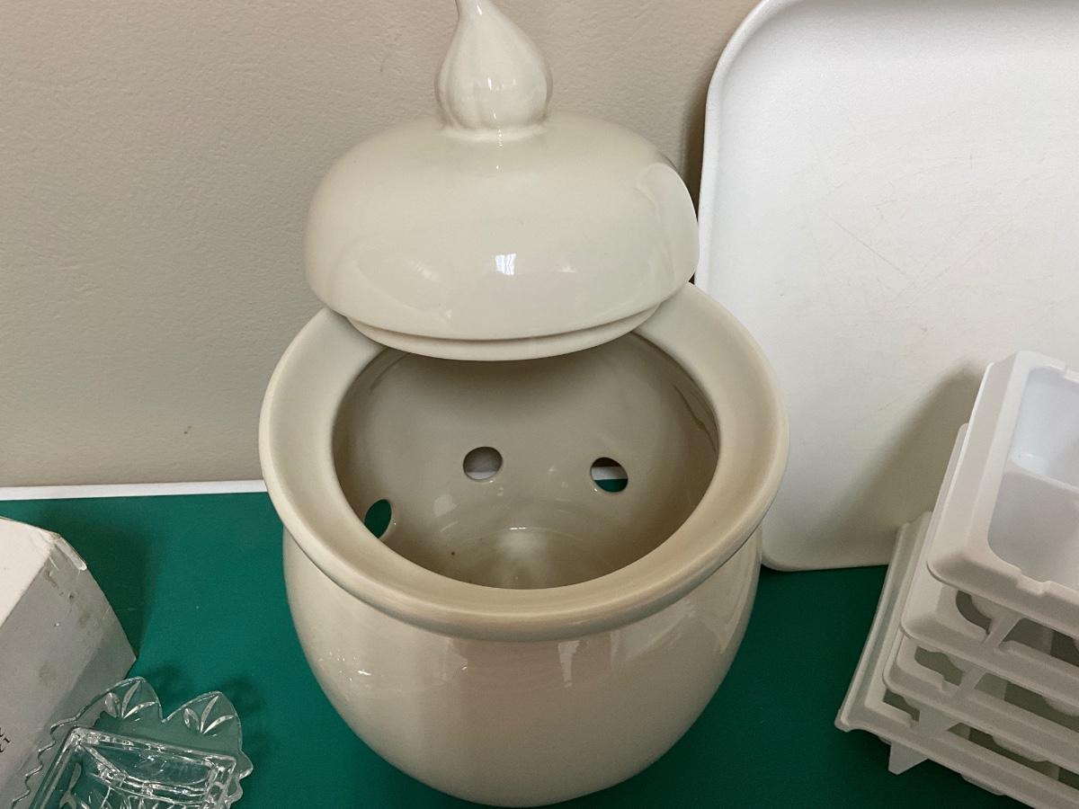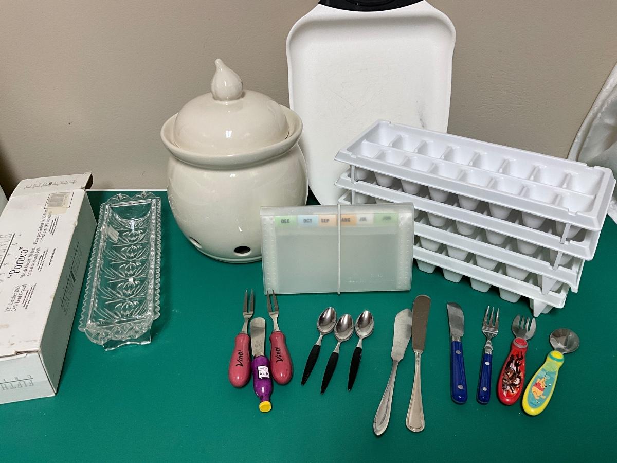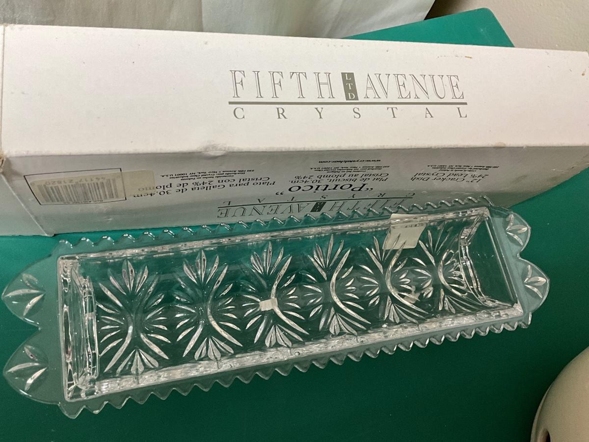 Fifth Avenue Crystal dish, ice trays, cutting board, vintage garlic keeper