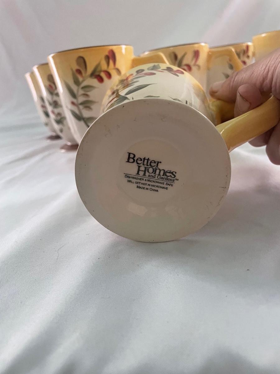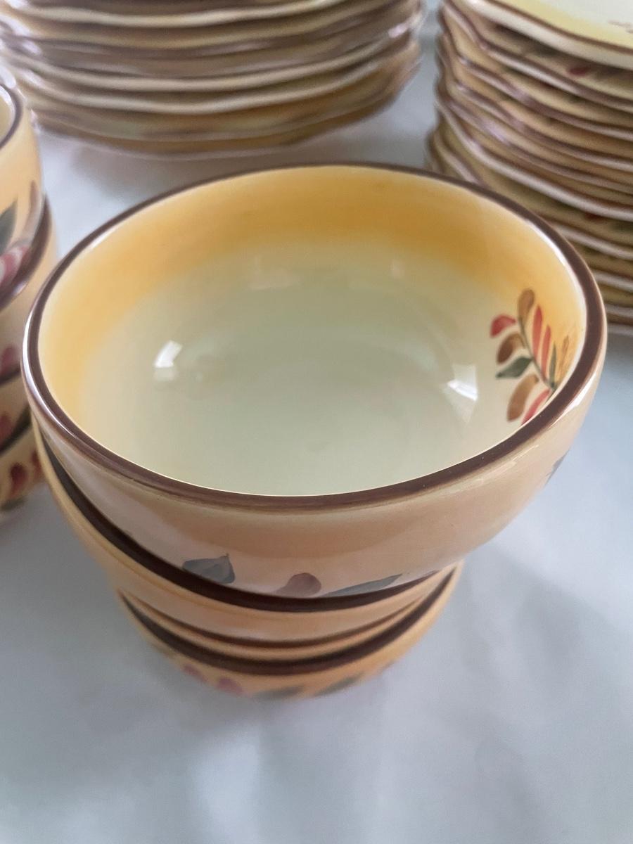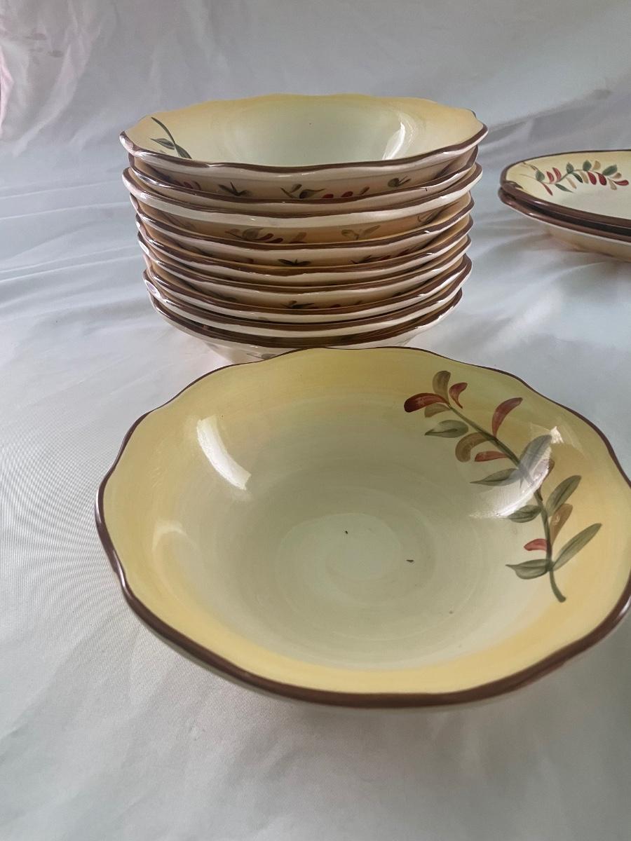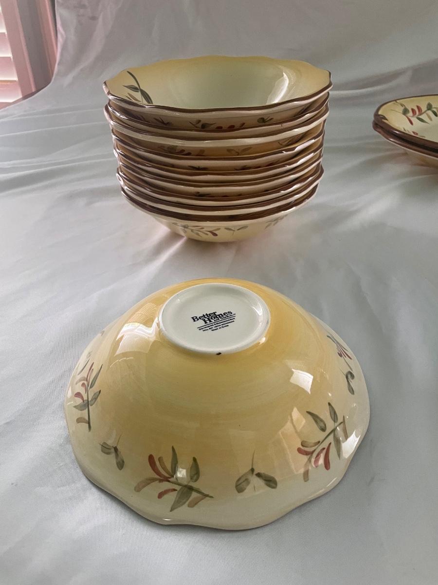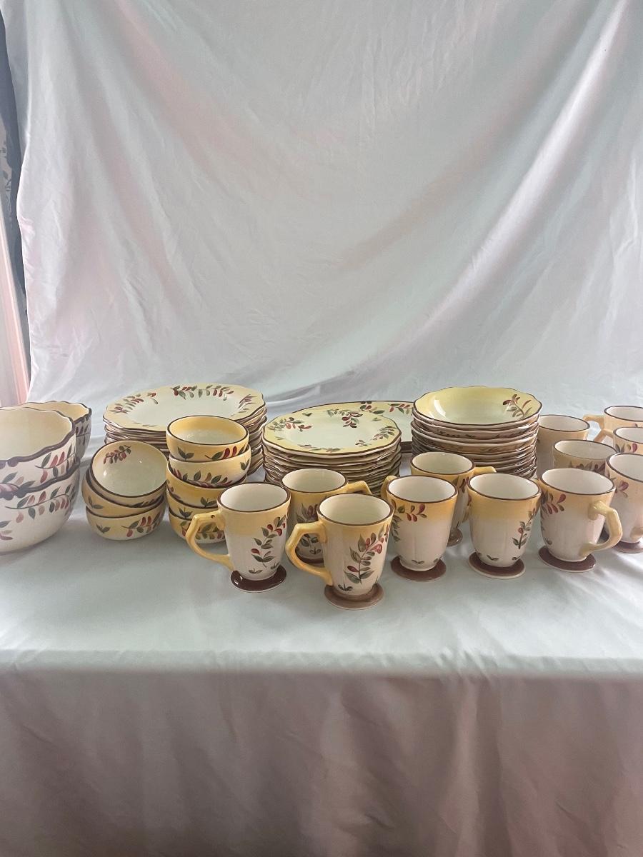 This matching Better Homes set is Tuscan Retreat design ceramic ware. All appear to have been used but are in great condition, just one cup has a chip in the base, see image. Set includes - 12 cups, 3 serving bowls, 2 large platters, 8 small and 10 big bowls, 10 side and 10 dinner plates (11” diameter).