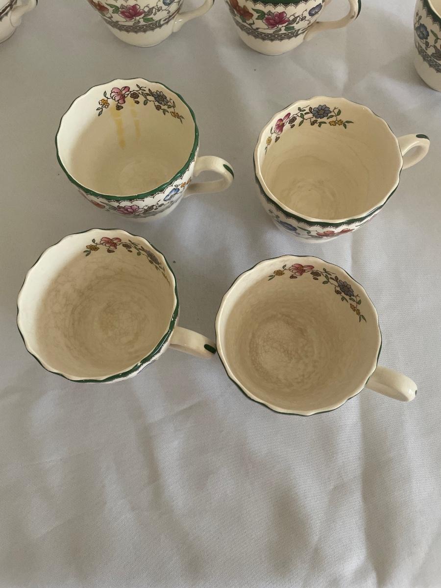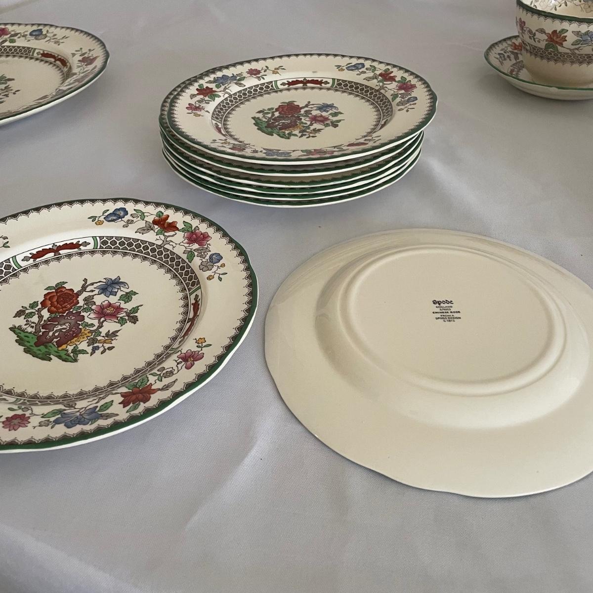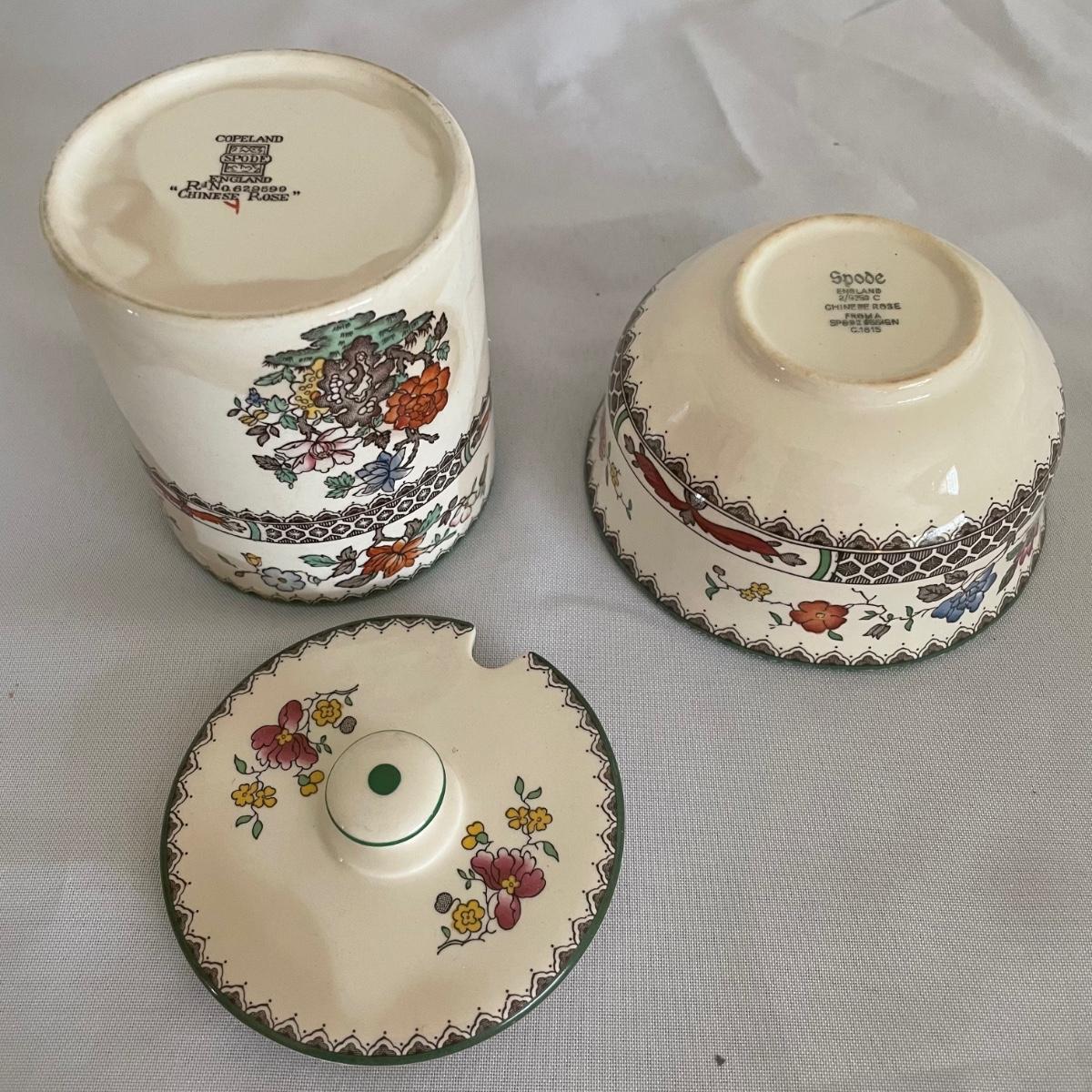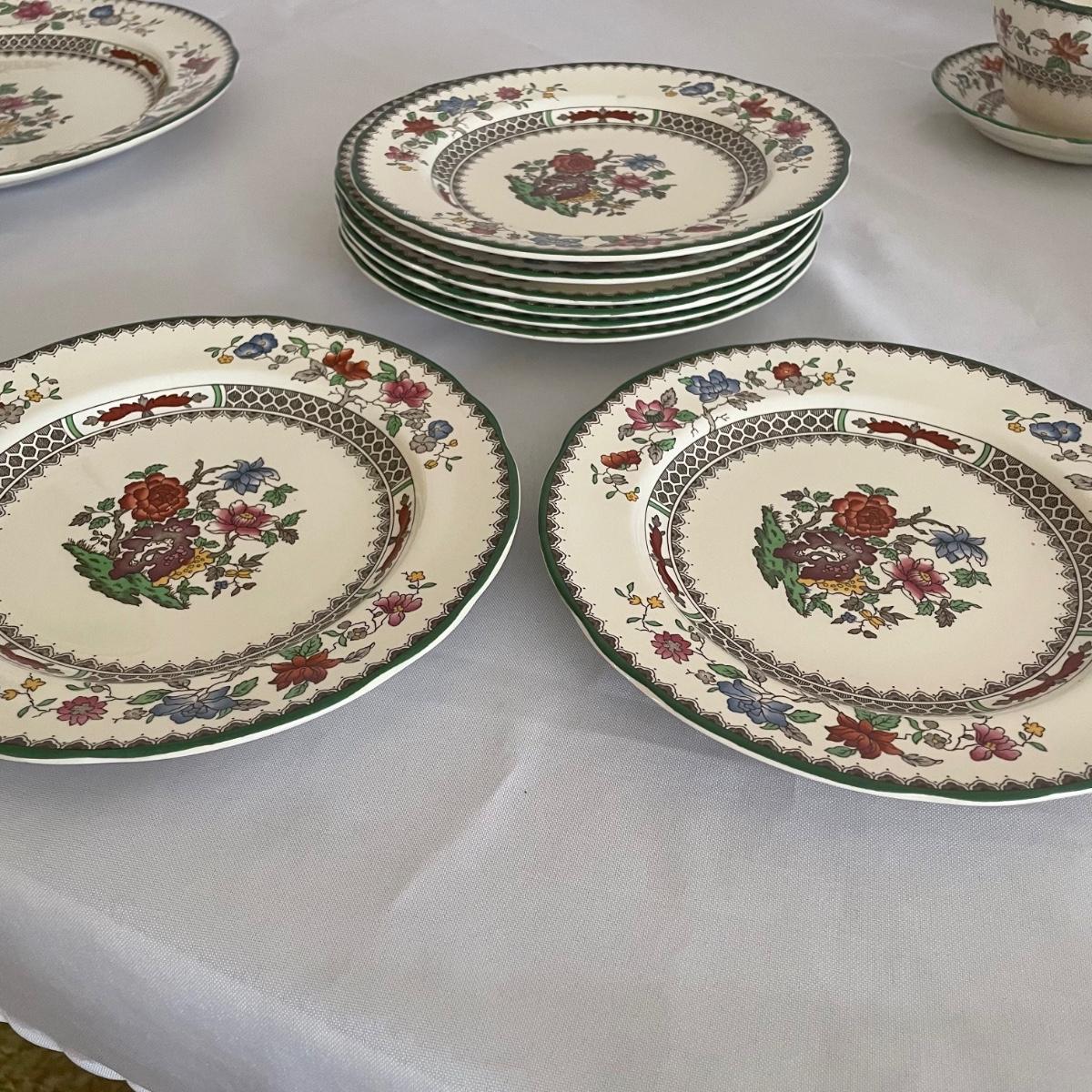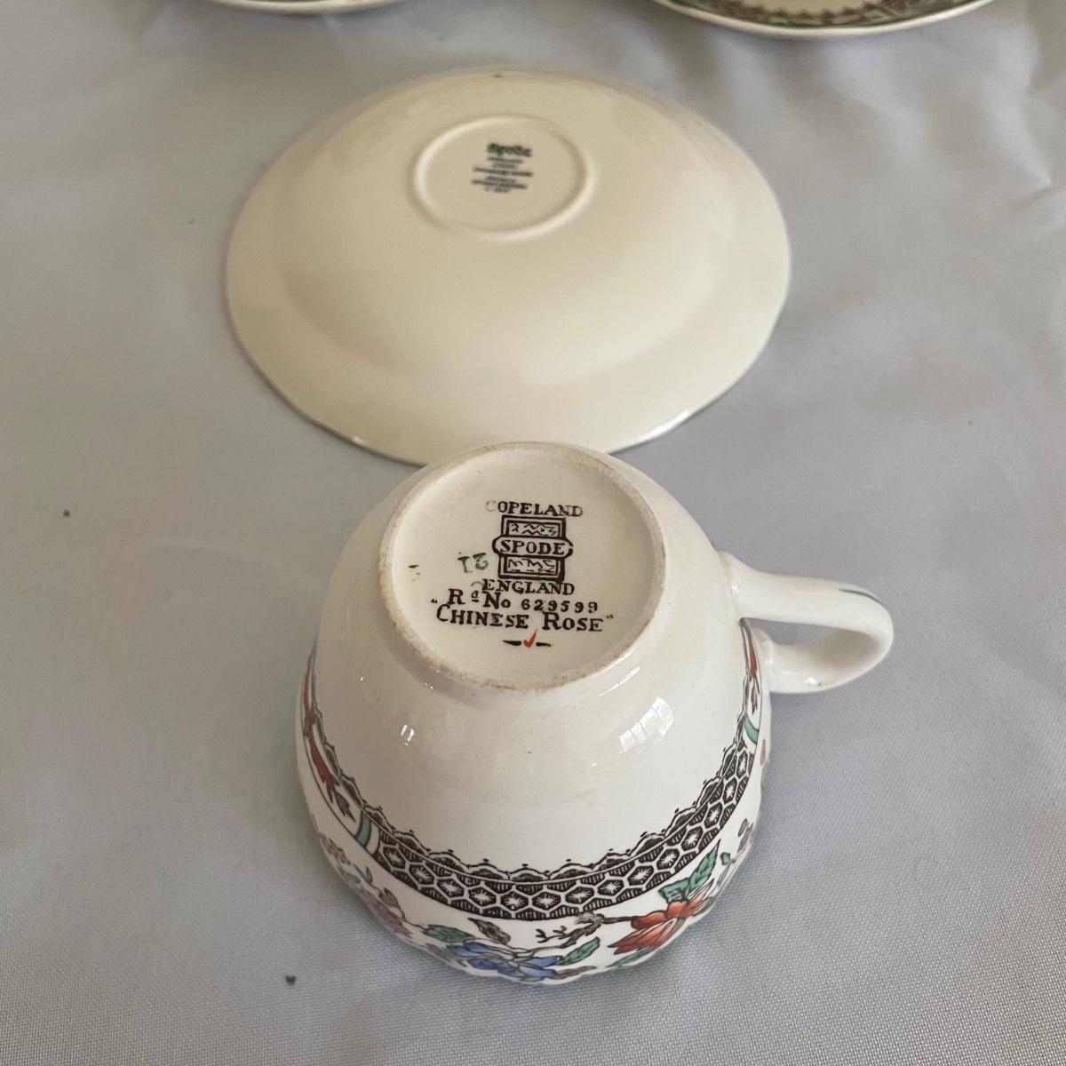 All are Copeland, but this set was added to over the years and therefore some stamps are different due to the companies logo changes over the years. Large plate, 1 medium plate and 2 bowls have a chip each. Also 4 cups have crazing in the glaze and the jam dish has some discoloration, see images.