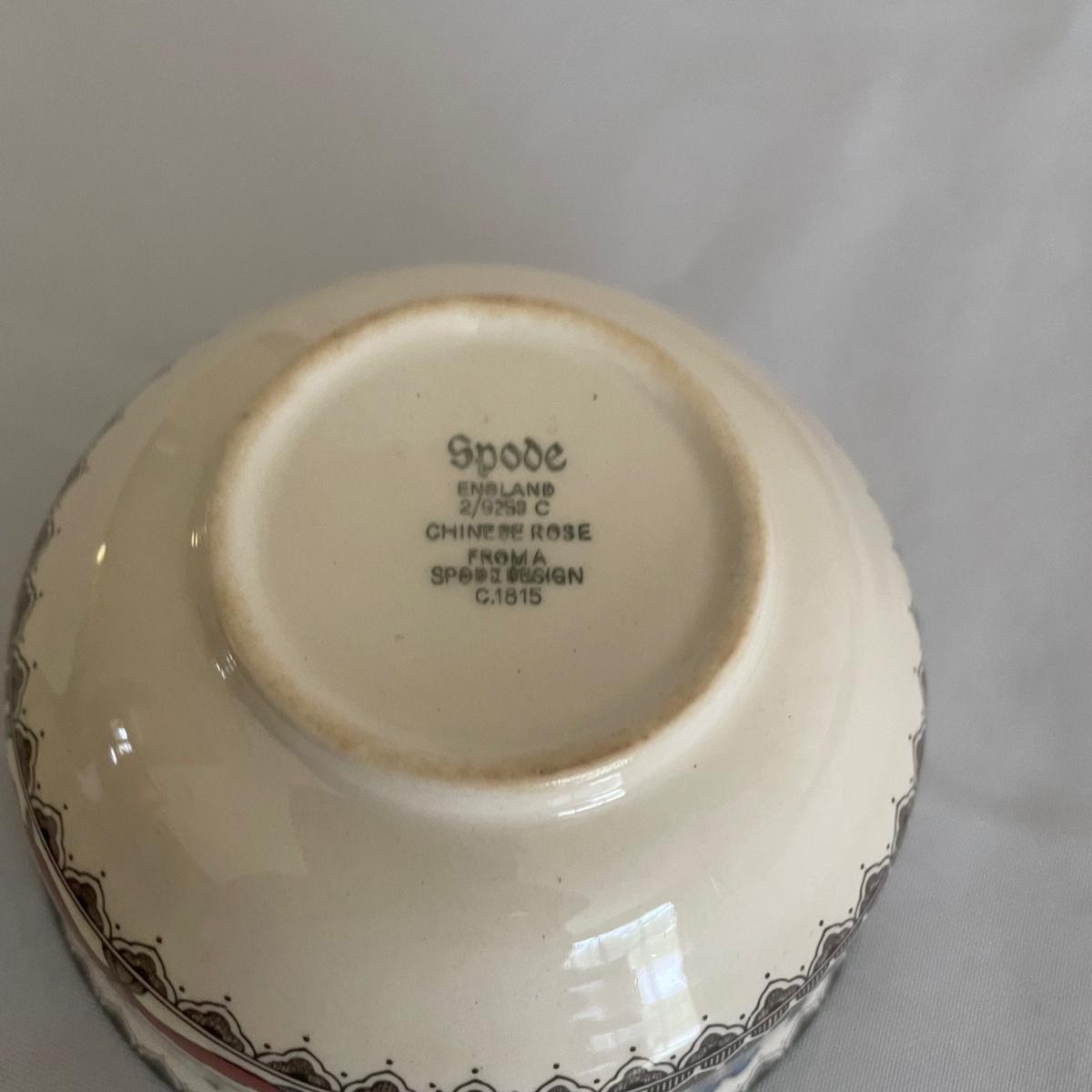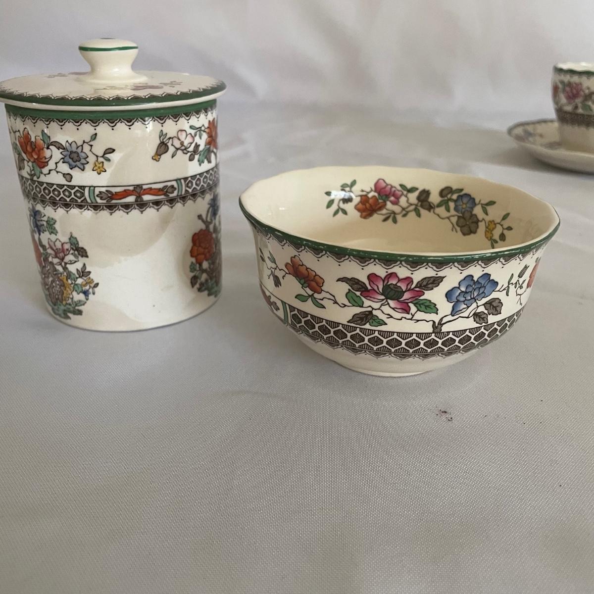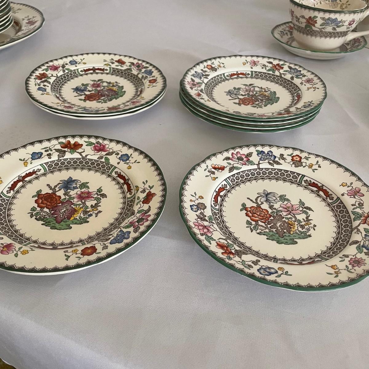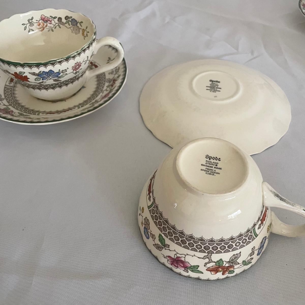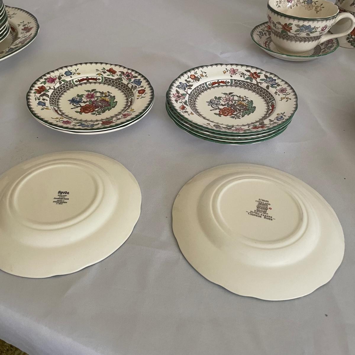 All are Copeland, but this set was added to over the years and therefore some stamps are different due to the companies logo changes over the years. Large plate, 1 medium plate and 2 bowls have a chip each. Also 4 cups have crazing in the glaze and the jam dish has some discoloration, see images.