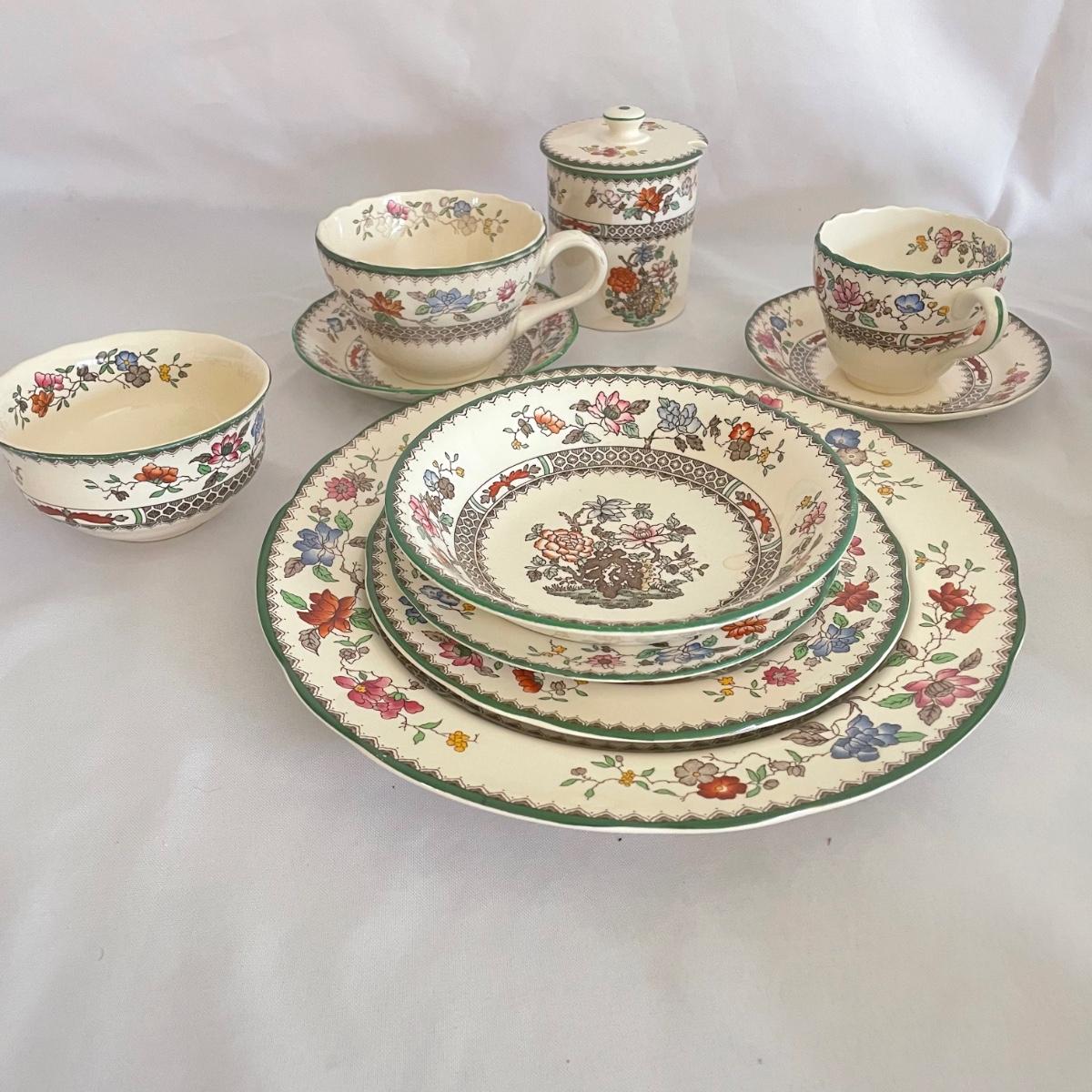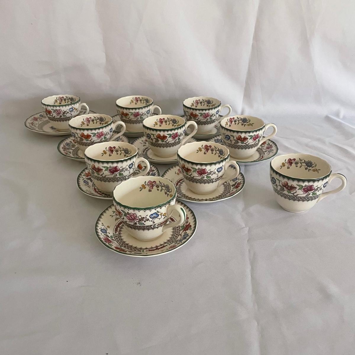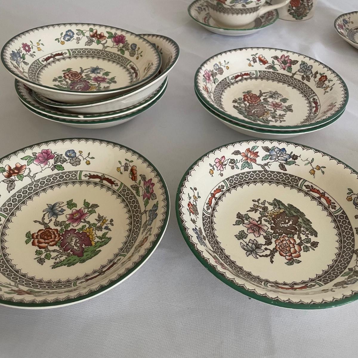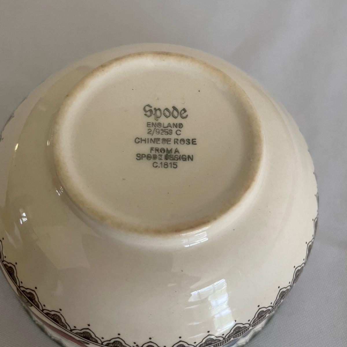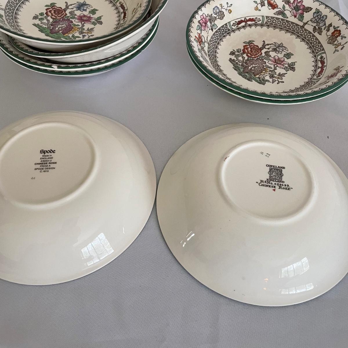 All are Copeland, but this set was added to over the years and therefore some stamps are different due to the companies logo changes over the years. Large plate, 1 medium plate and 2 bowls have a chip each. Also 4 cups have crazing in the glaze and the jam dish has some discoloration, see images.