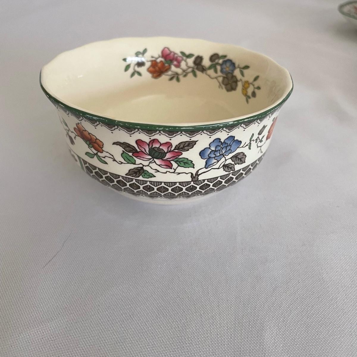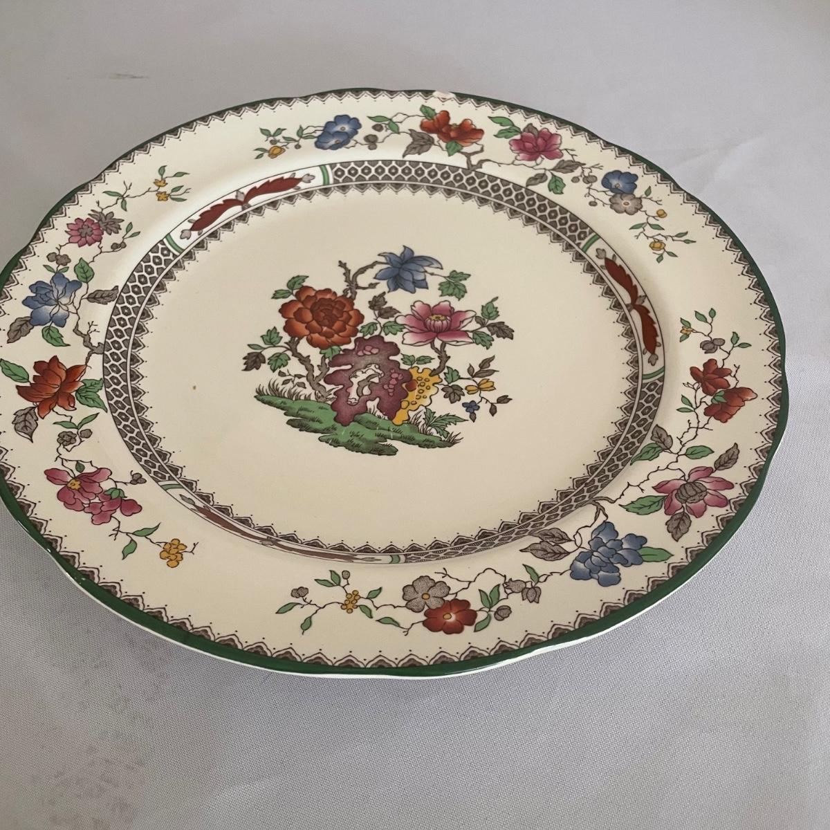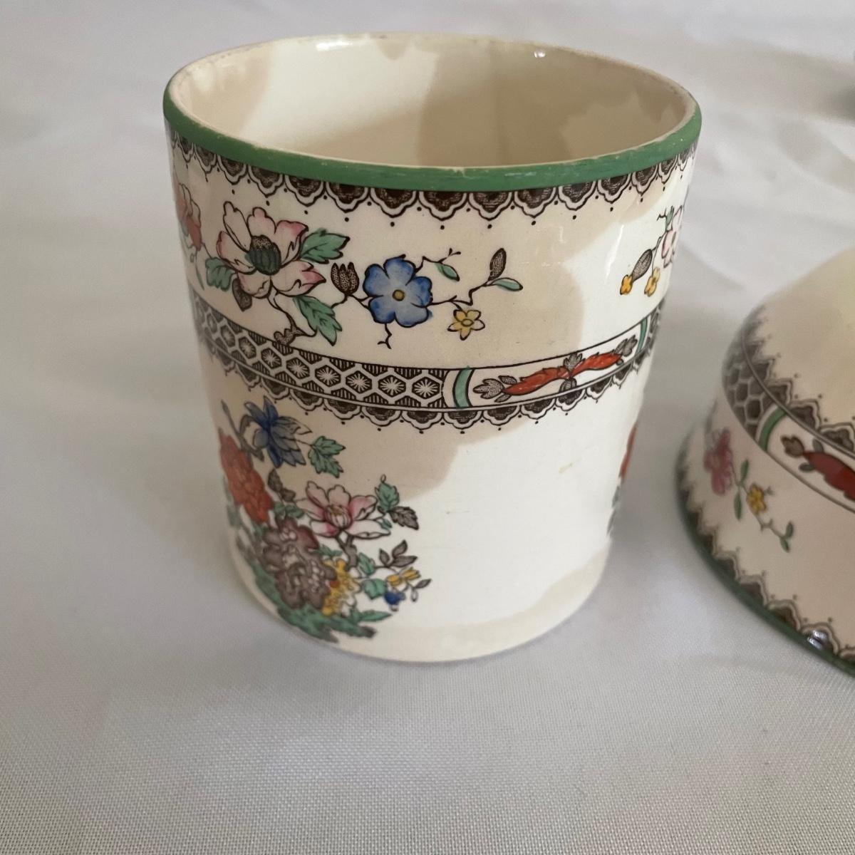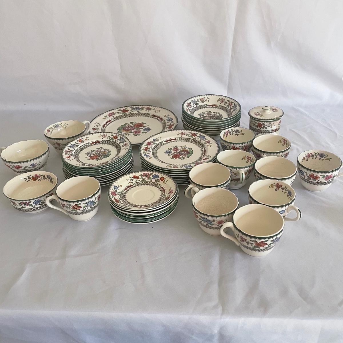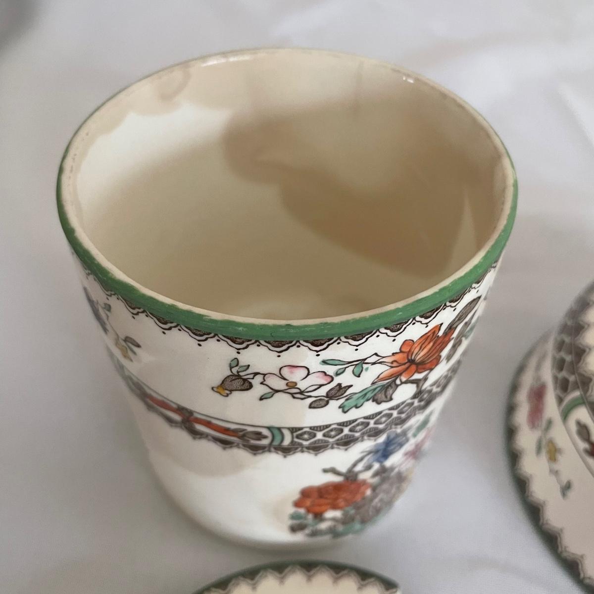 All are Copeland, but this set was added to over the years and therefore some stamps are different due to the companies logo changes over the years. Large plate, 1 medium plate and 2 bowls have a chip each. Also 4 cups have crazing in the glaze and the jam dish has some discoloration, see images.