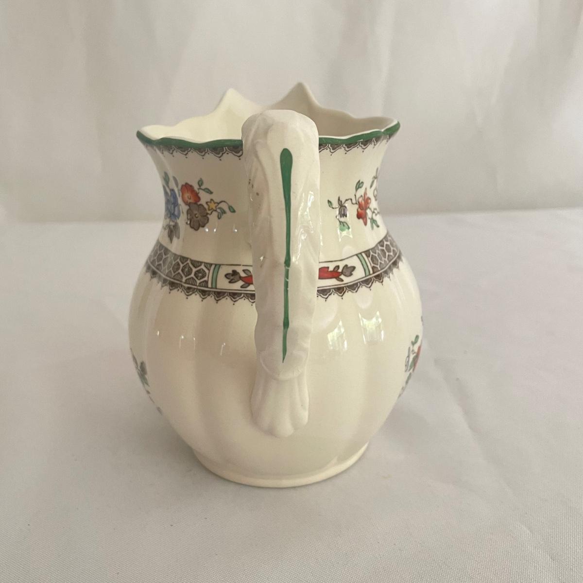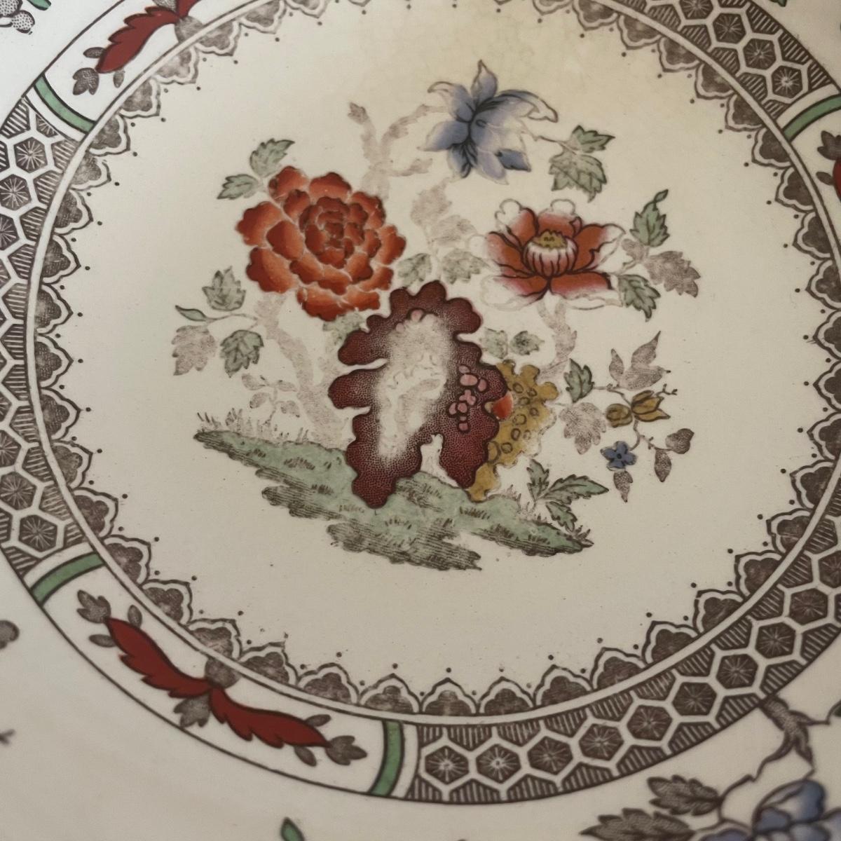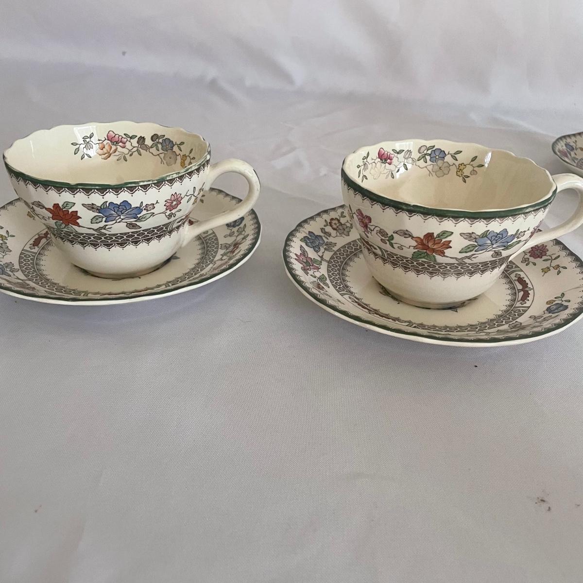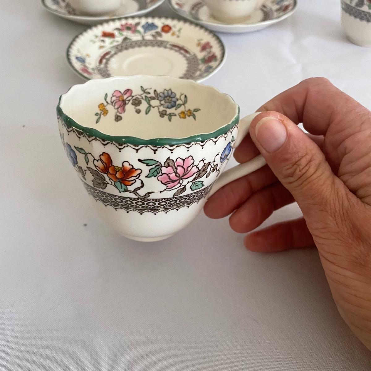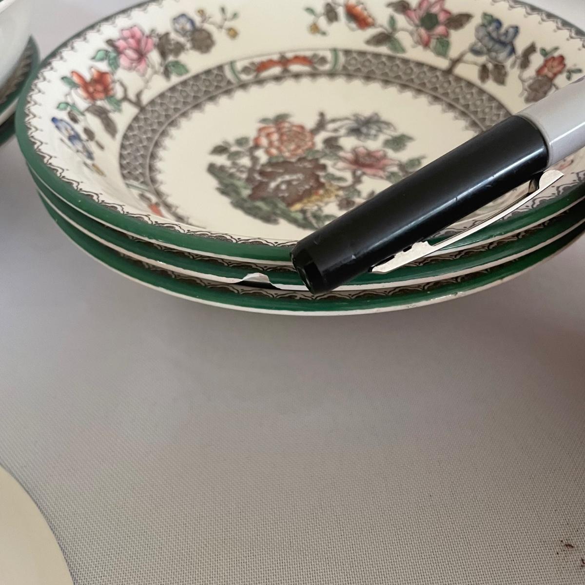 All are Copeland, but this set was added to over the years and therefore some stamps are different due to the companies logo changes over the years. Large plate, 1 medium plate and 2 bowls have a chip each. Also 4 cups have crazing in the glaze and the jam dish has some discoloration, see images.