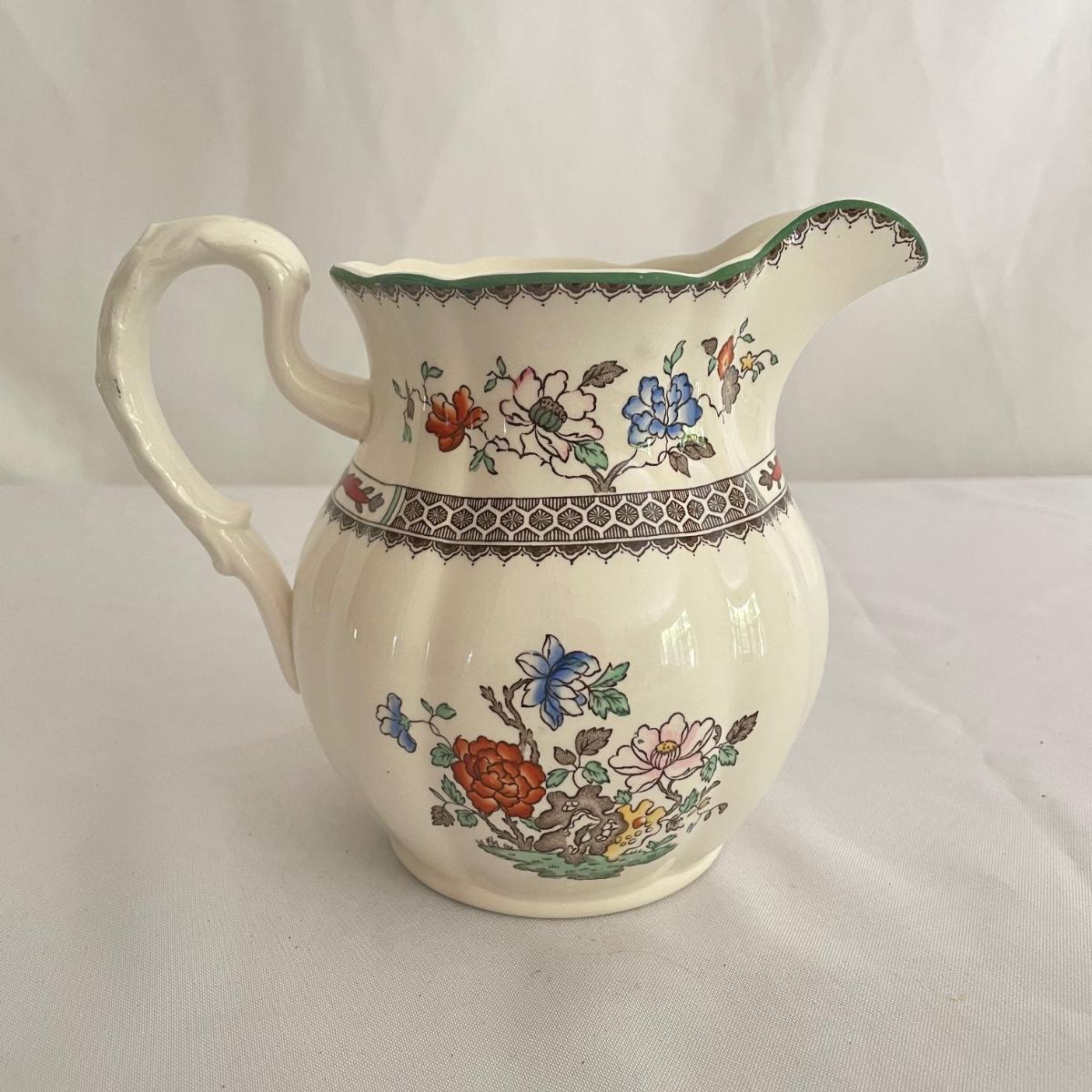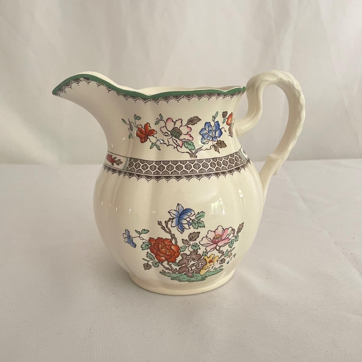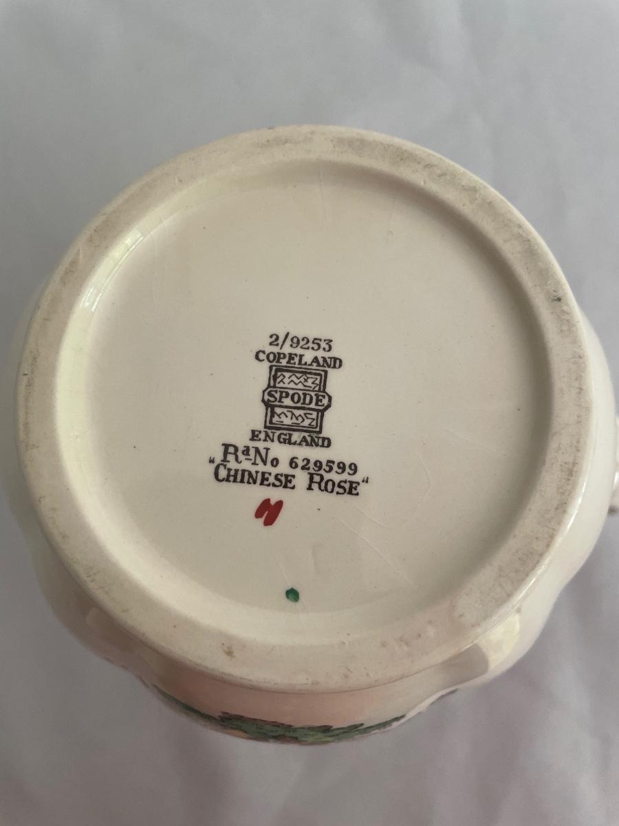 This large collection of Copeland Spode fine China in the Chinese Rose design includes 1 large plate (10” d), 8 medium plates, 8 smaller plates, 8 bowls, sugar bowl, lidded jam dish, 10 smaller tea cups, 2 larger tea cups and 11 saucers, plus one 6” tall pitcher.
