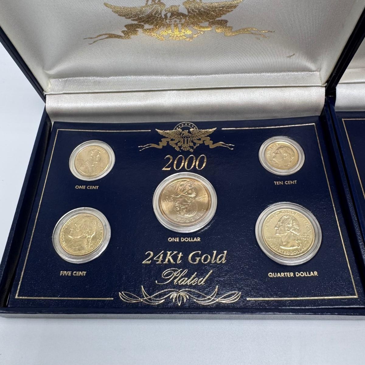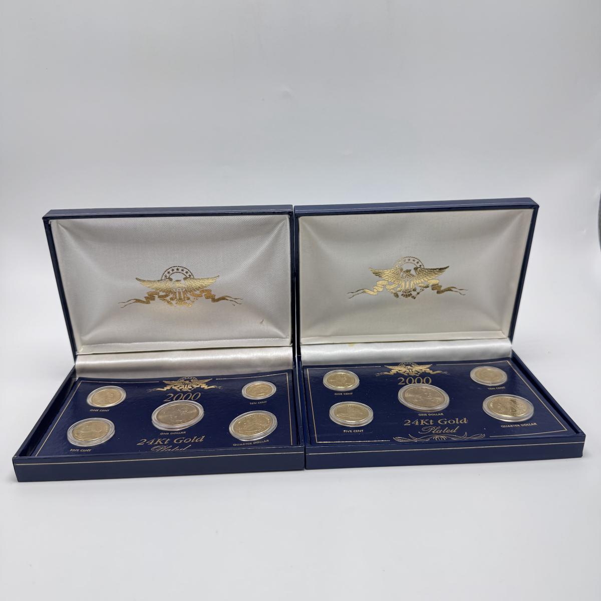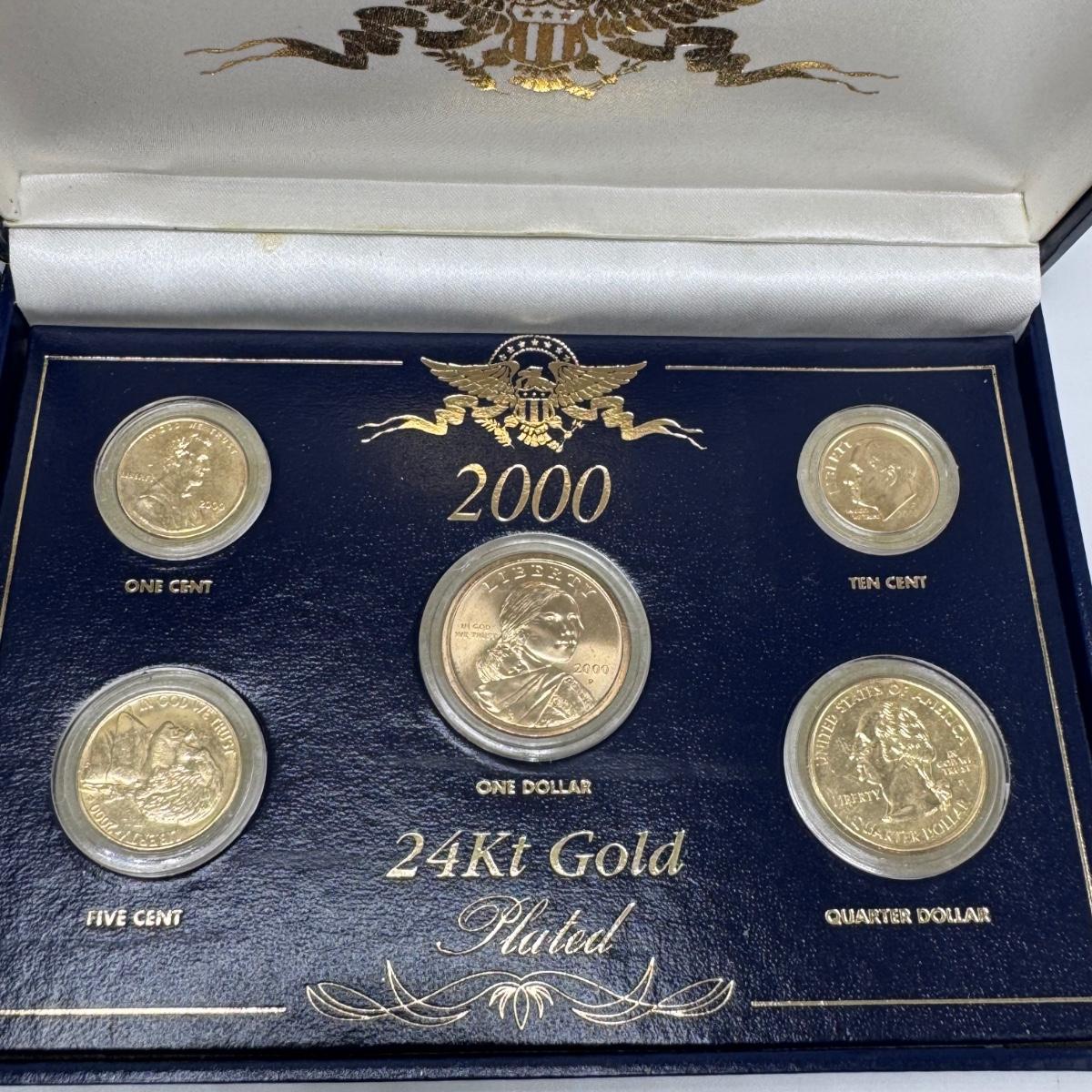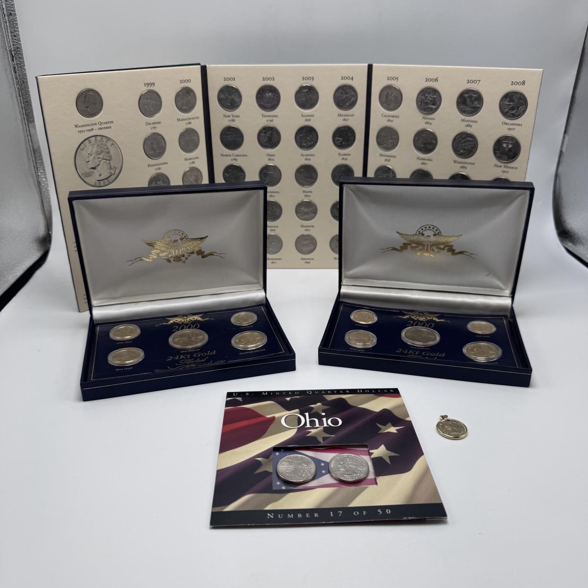 This lot includes fifty state commemorative quarters, U.S. minted quarter dollar from Ohio (17/50), 1964 Canadian one-cent coin pendant, and two boxes of 2000 U.S. Mint 24-karat gold-plated coin sets. All sales are final. No returns or refunds. Please bid accordingly. Shipping available.