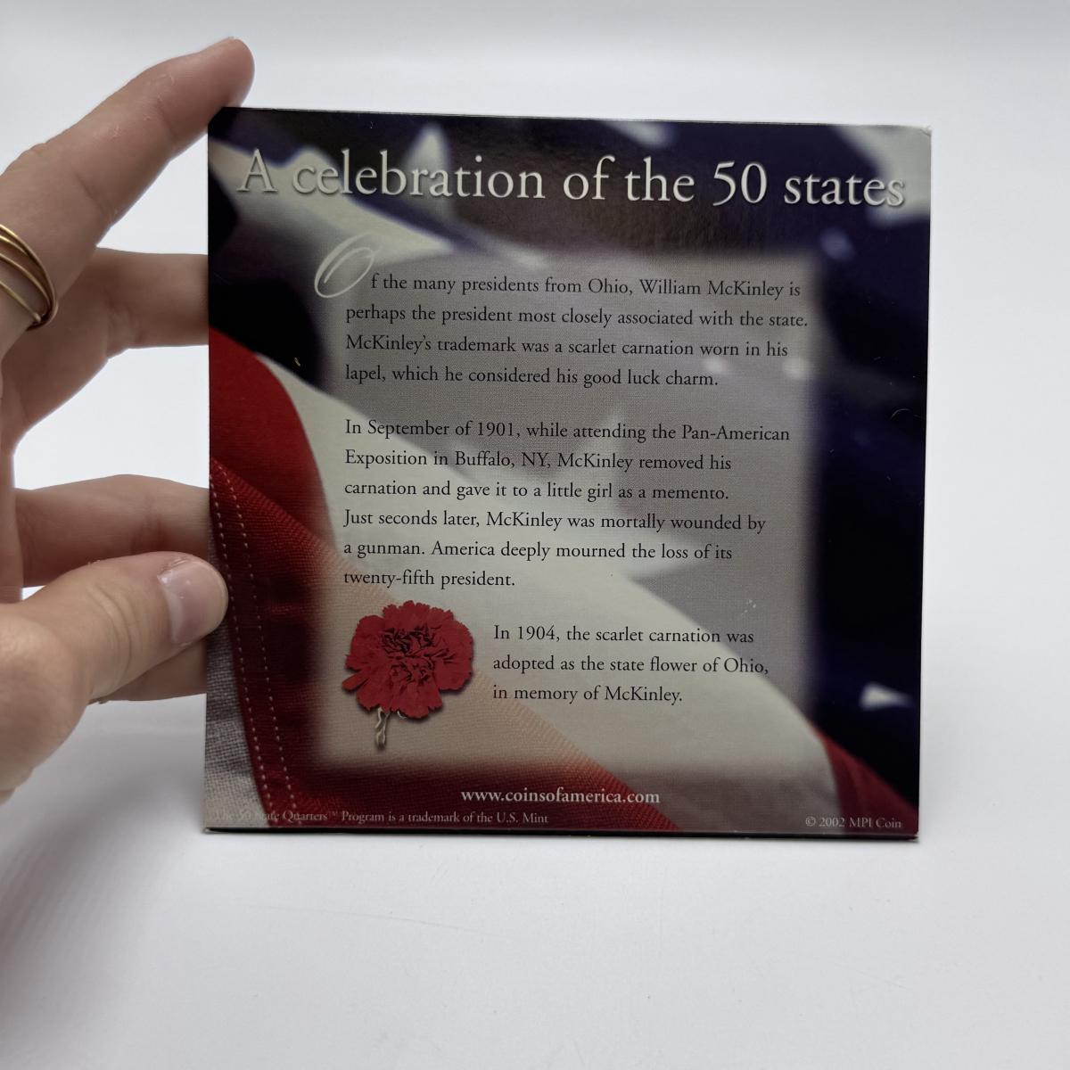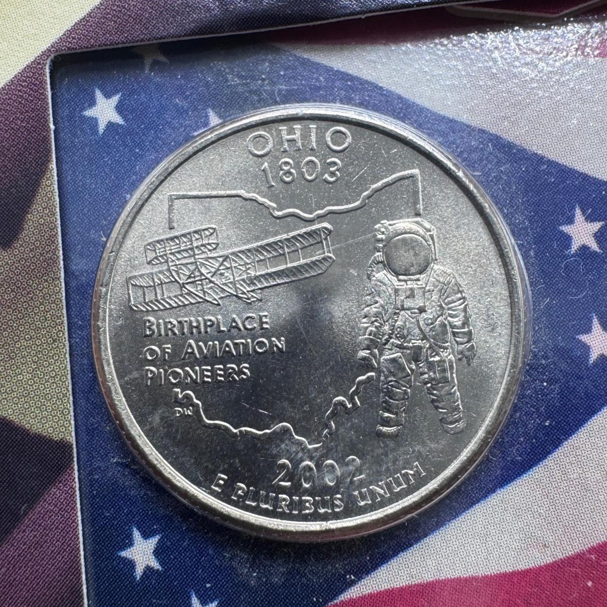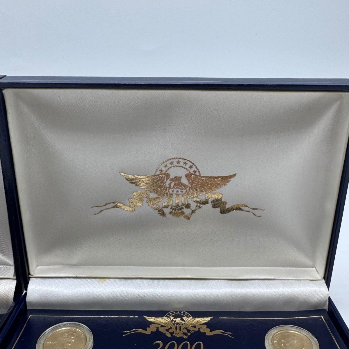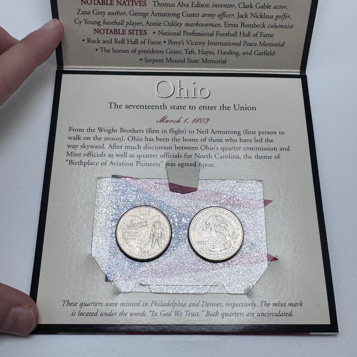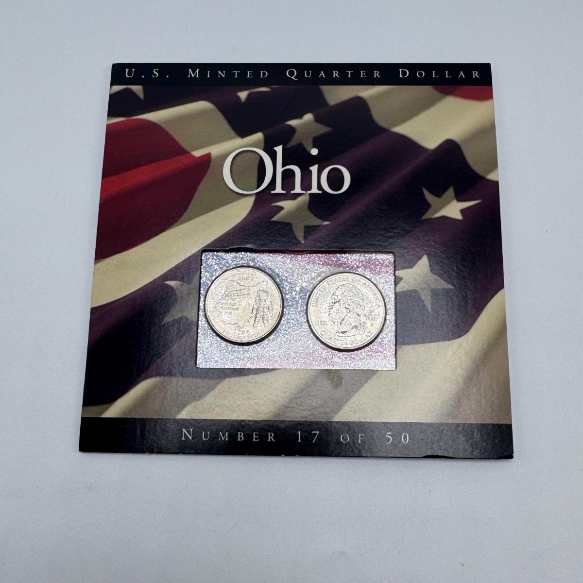 This lot includes fifty state commemorative quarters, U.S. minted quarter dollar from Ohio (17/50), 1964 Canadian one-cent coin pendant, and two boxes of 2000 U.S. Mint 24-karat gold-plated coin sets. All sales are final. No returns or refunds. Please bid accordingly. Shipping available.