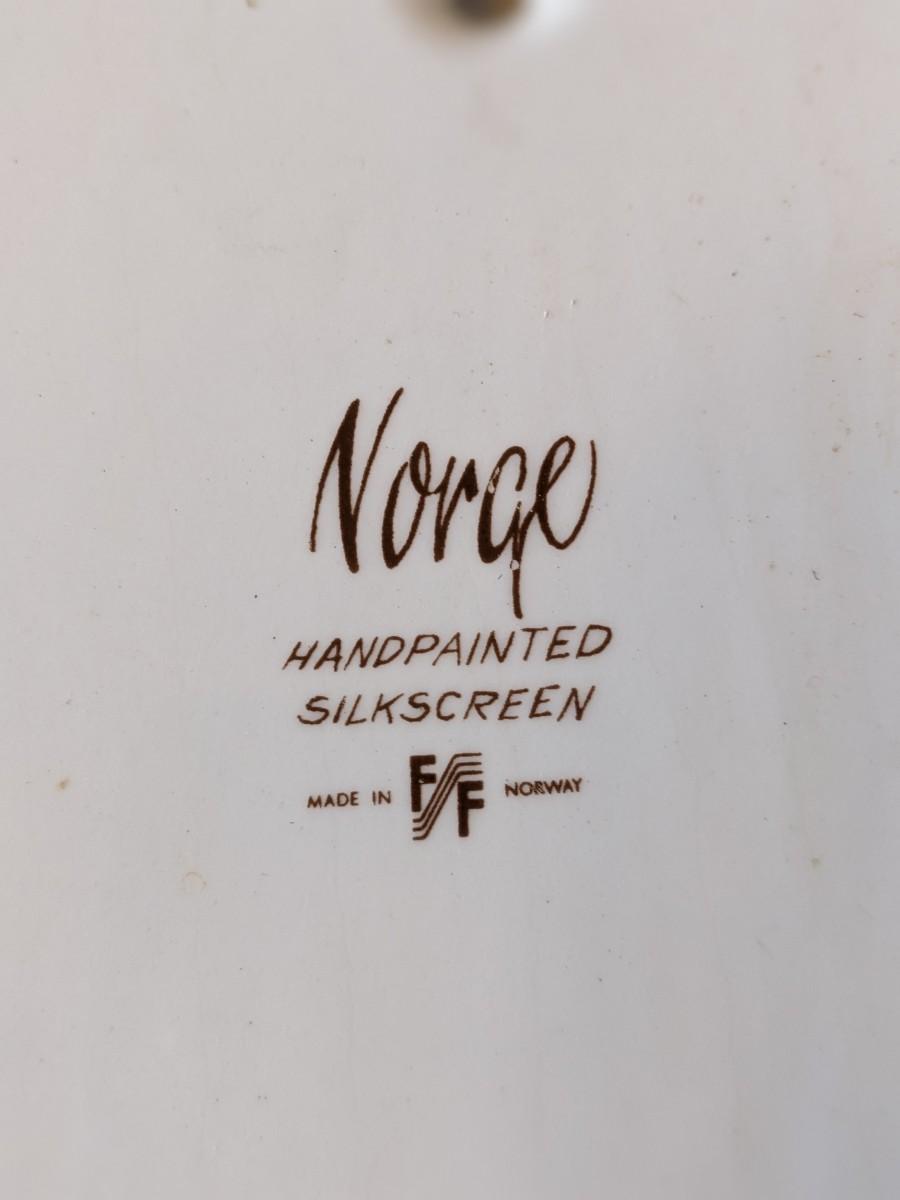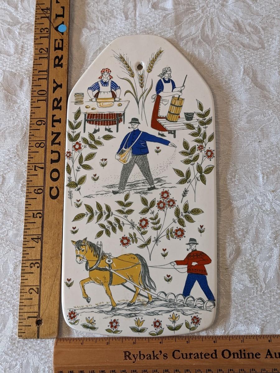 This is a 1970s ceramic wall plaque or trivet by Figgjo Flint of Norway. This an unusual and rare design called Norge. It is a Hand Painted silk screen design displaying how wheat is sown and made into flour and used in cooking.