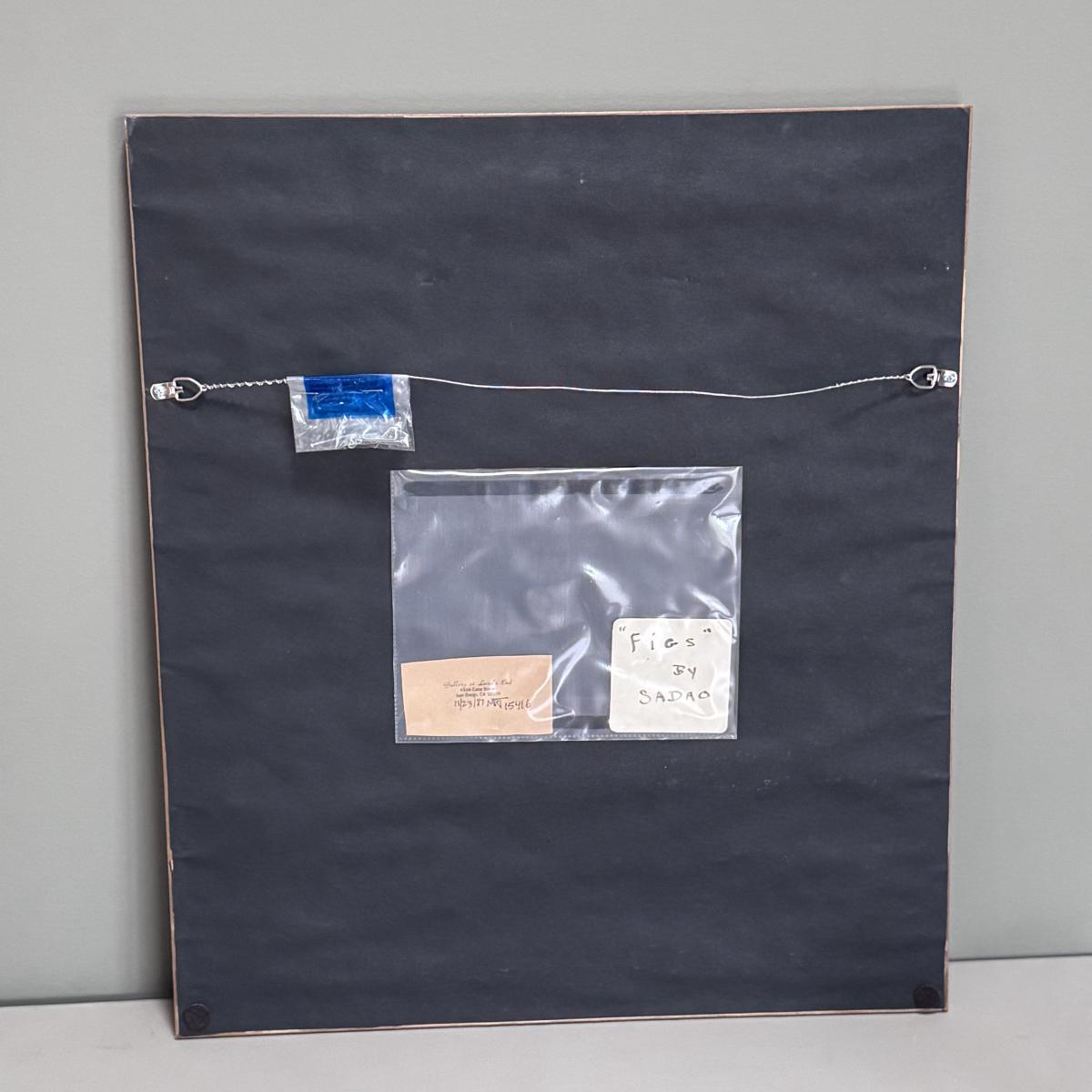 This lot includes, what appears in to be, a painting titled “Figs” by Sadao. The art is matted once, protected with glass, and framed in a wooden frame. It measures 20” x 23”H. It appears to be signed in the bottom right corner. Shipping available.