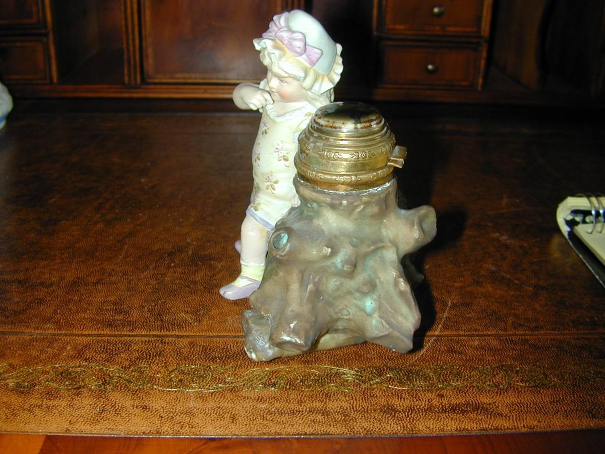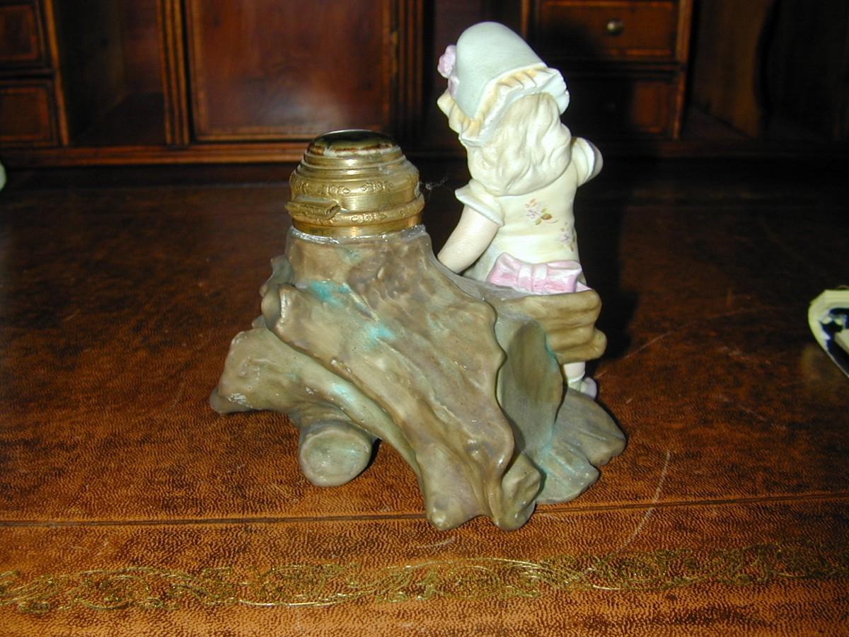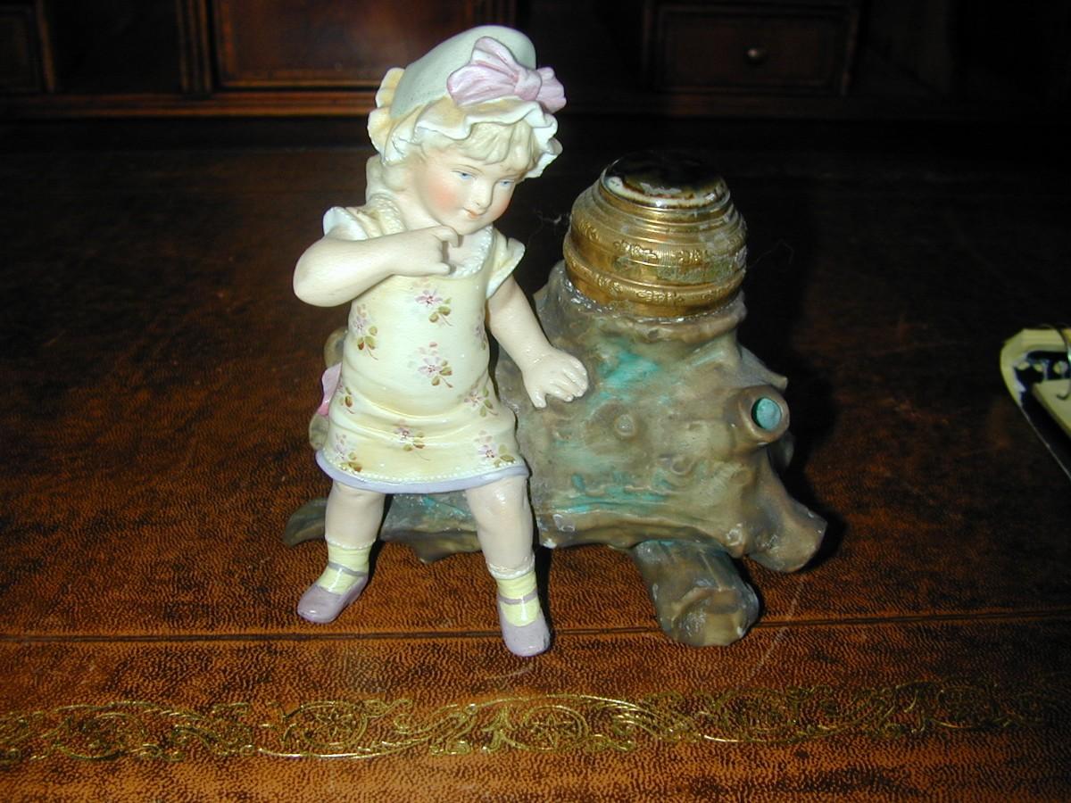 Figural Bisque/Pottery & Metal Little Girl Inkwell