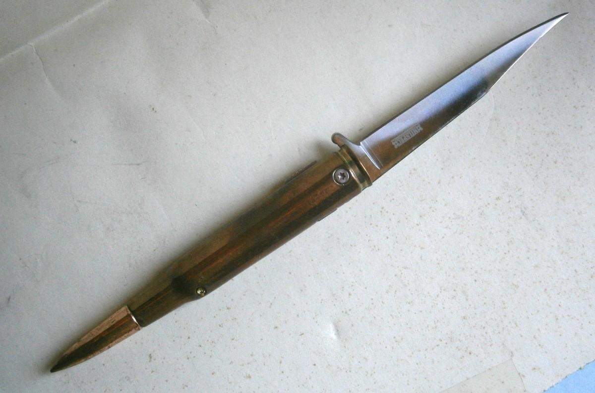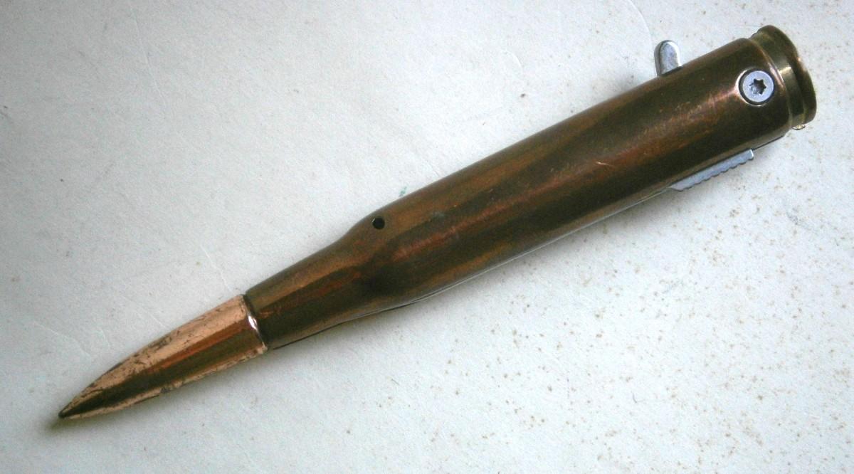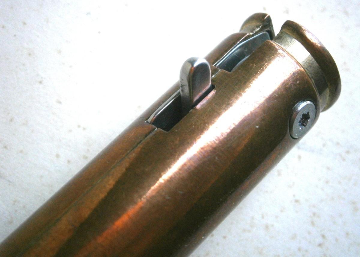 Figural Bullet Pocket Knife, 5 1/2 in. long (closed), copper and steel, 4 in. blade.