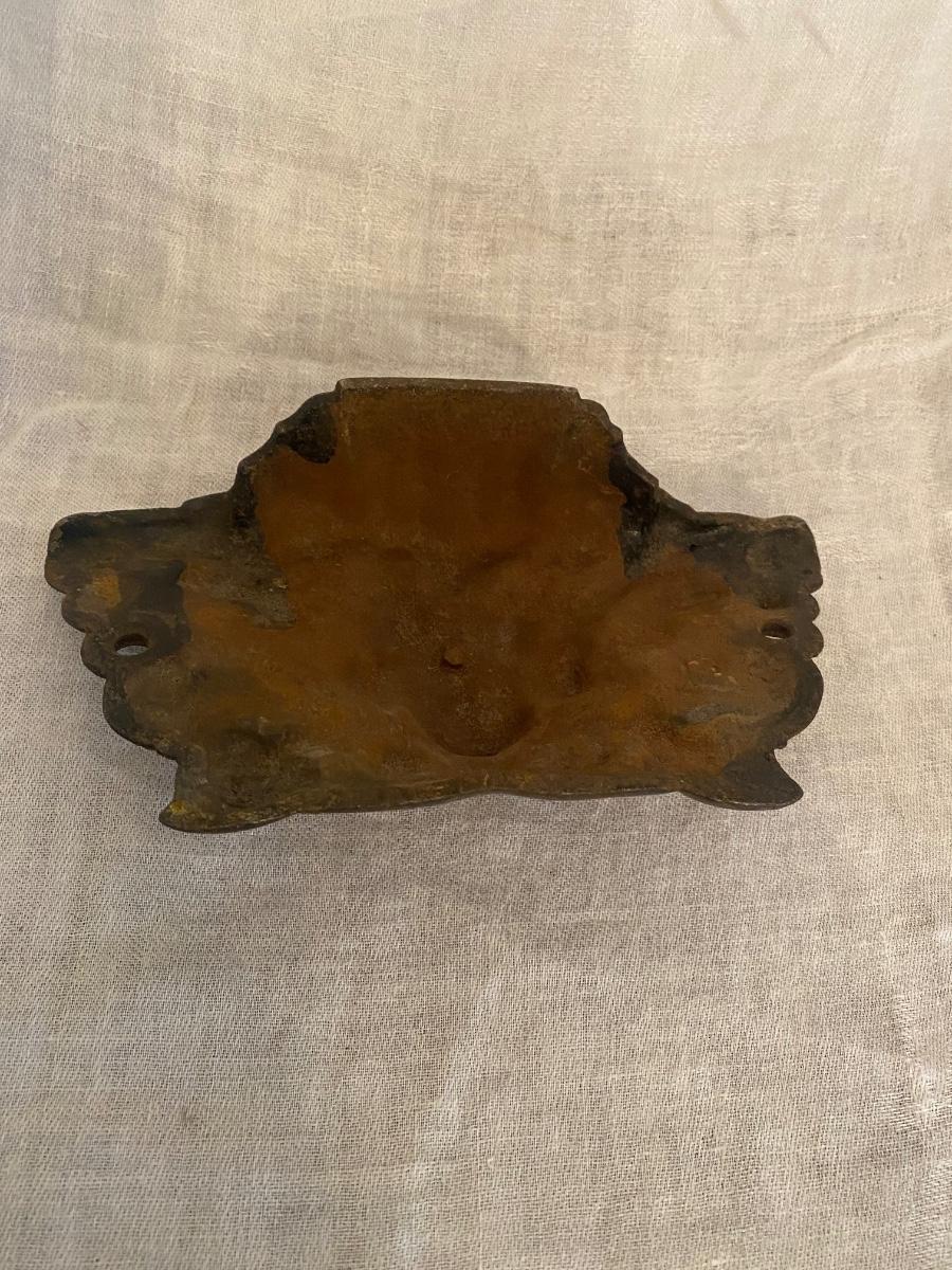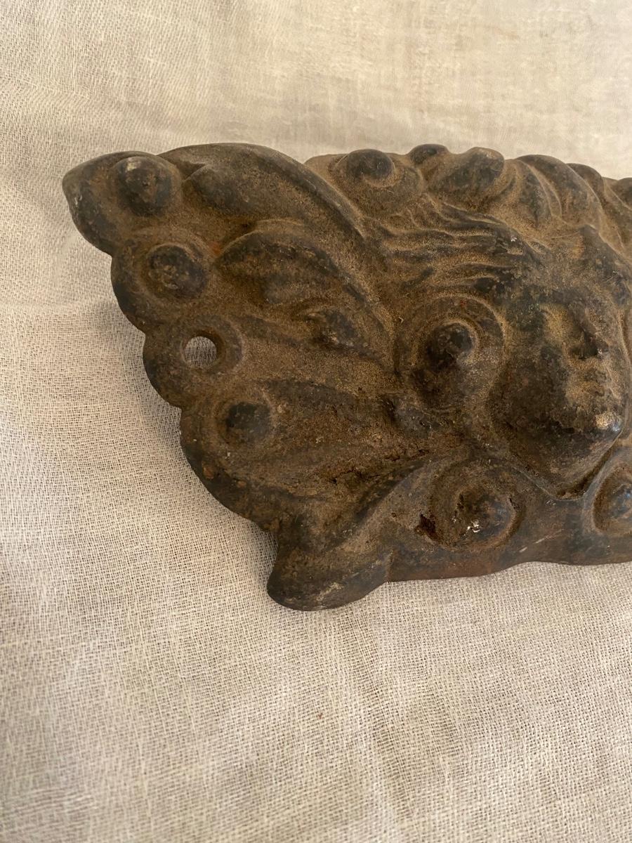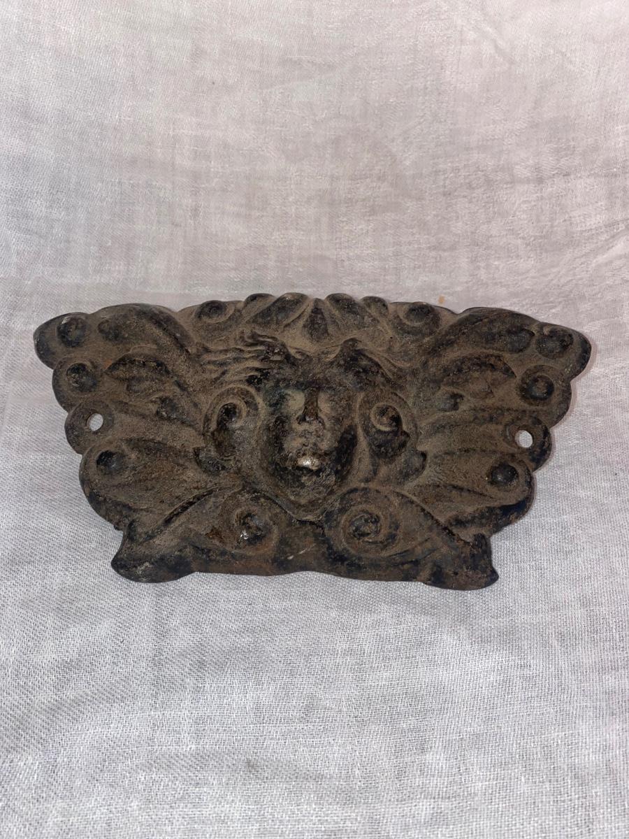 Figural Cast Iron Embossed Cherub Architectural Wall Plaque or large pull. Heavy. Cherub center. 8lx4x2D