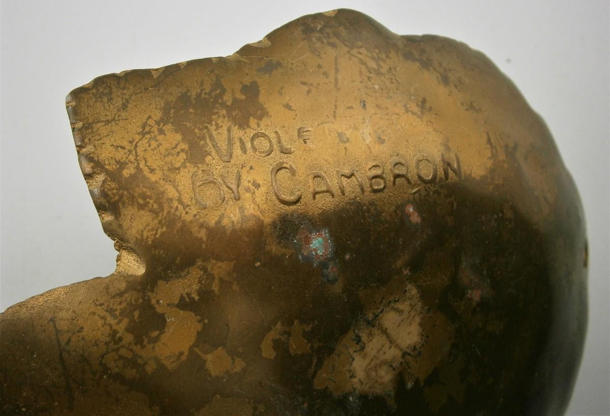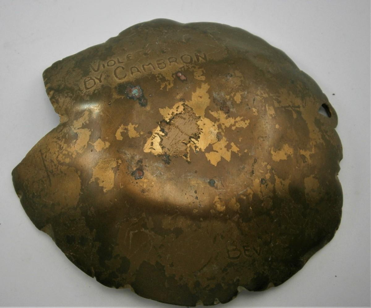Figural Leaf Brass Pin Tray signed ""VIOLET" BY CAMBRON" from the early 1900's, 5 in. long, cast brass, assuming Cambron is the artist.
