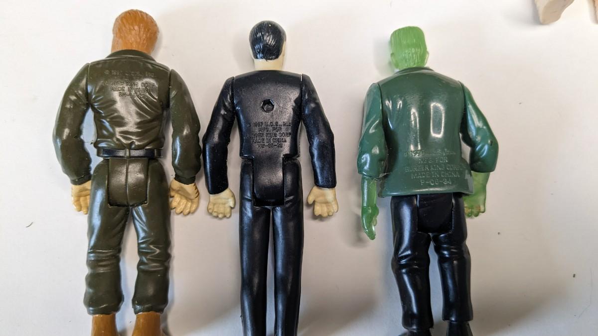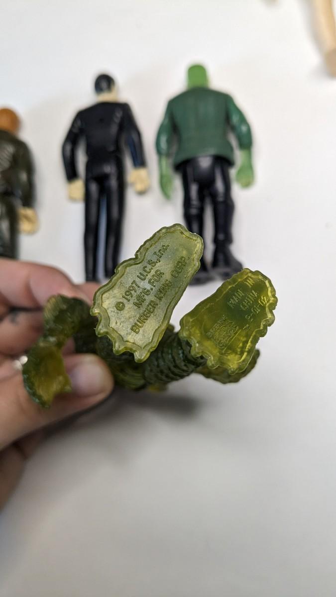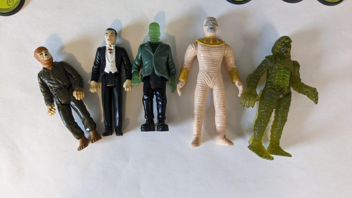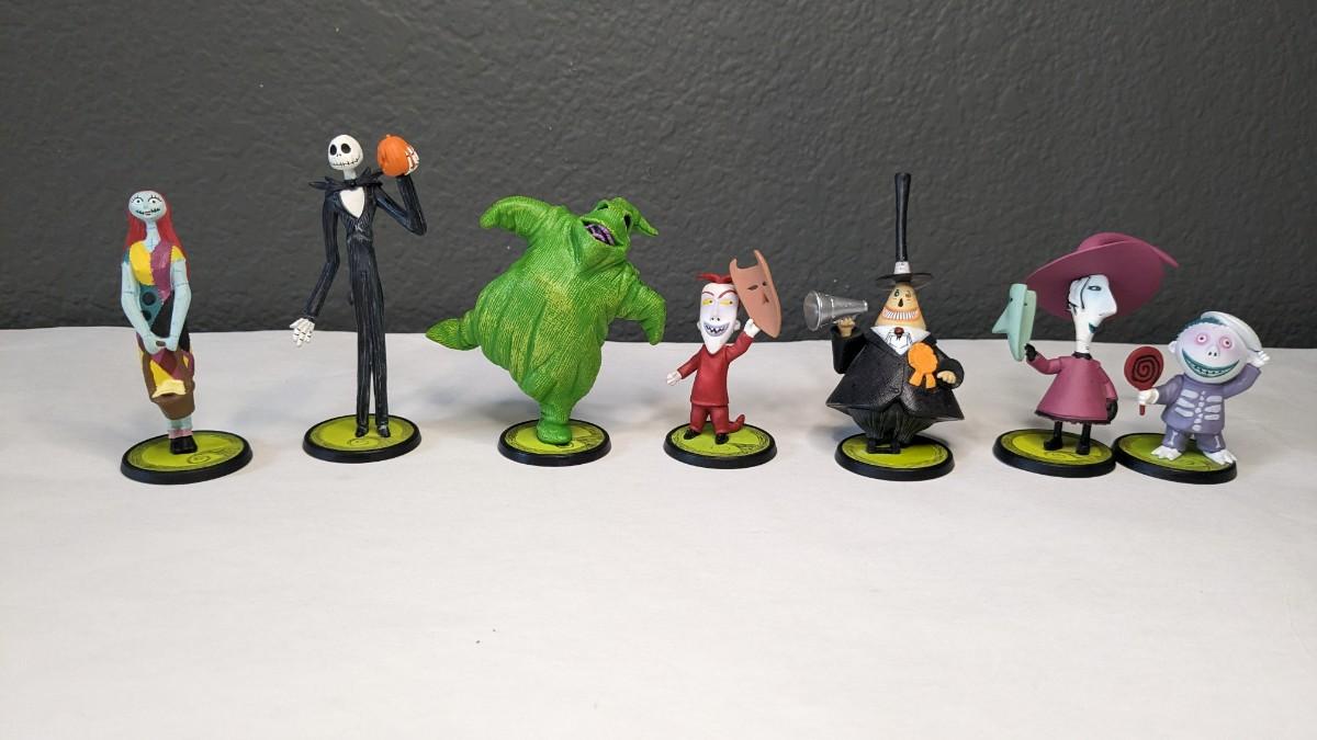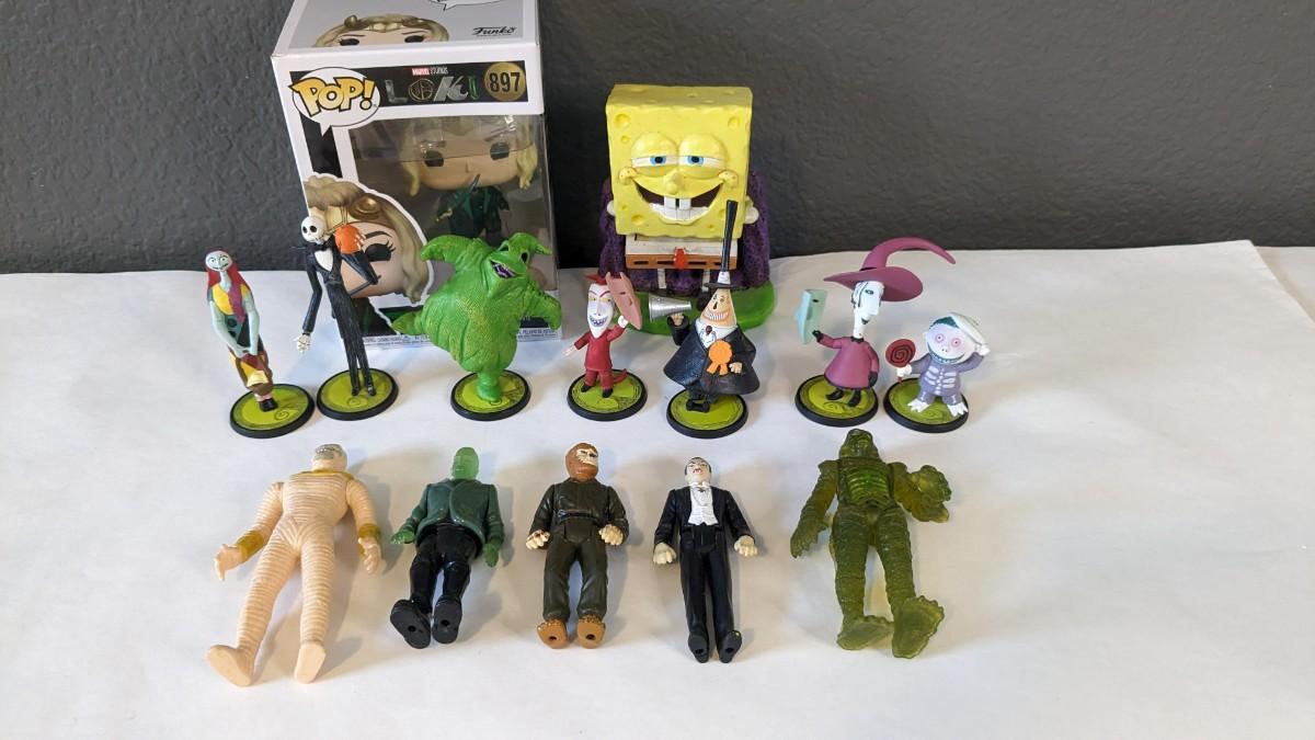 includes Nightmare Before Christmas collectibles, Paramount Monsters from Burger King w/ Bandai mummy, Spongebob Squarepants articulating figure, and Sylvie Funko Pop figure.