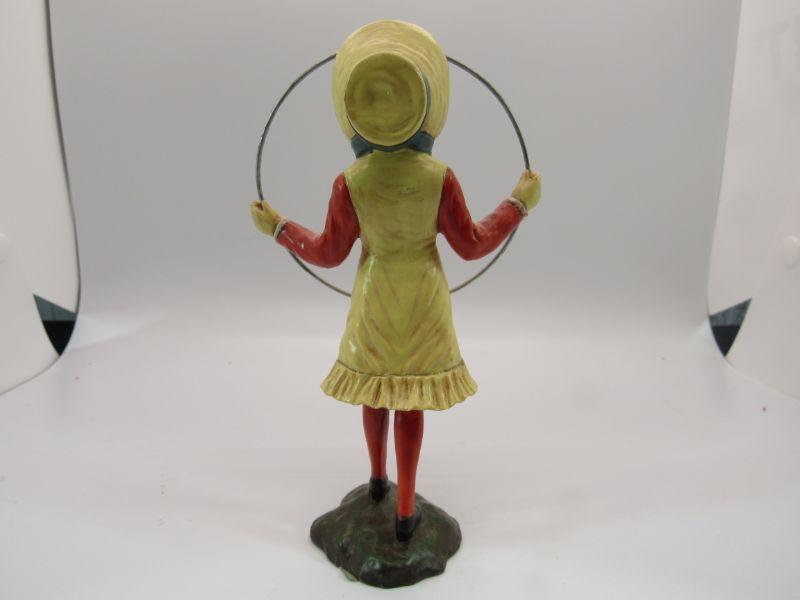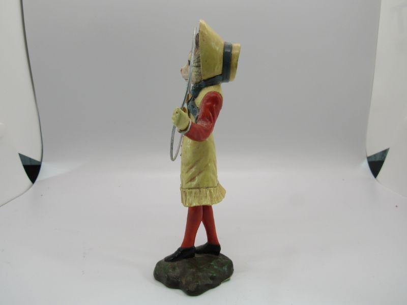 Cat girl figurine dressed in yellow and red dress with blue Bonnet and holding a silver hula hoop. She stands on a base. Sticker on the bottom says Mid West of Cannon Falls made in China.