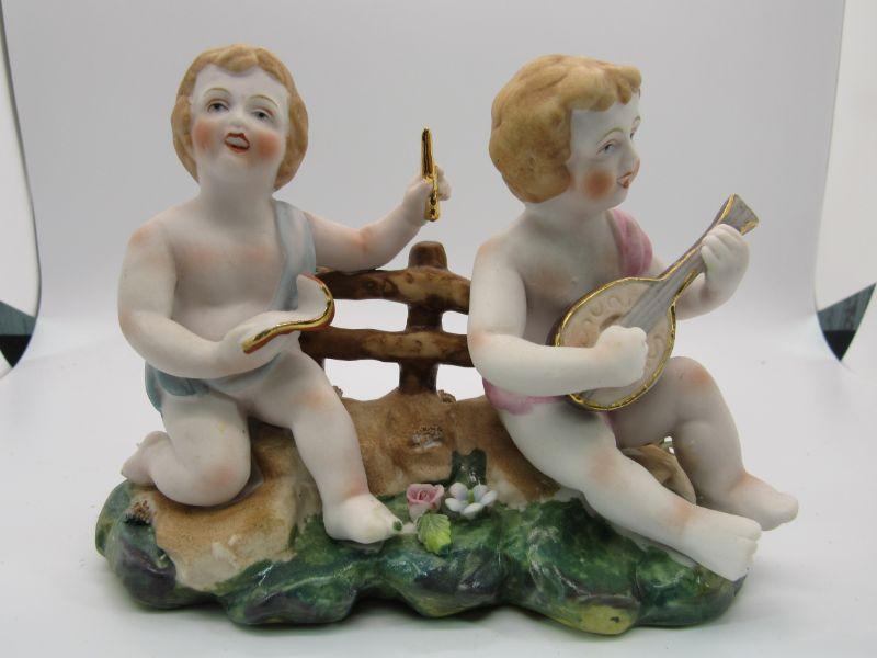 Halsey cherub figurine made in Occupied Japan. Features 2 cherubs playing mandolin and singing. About 6" size.