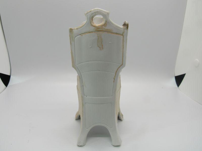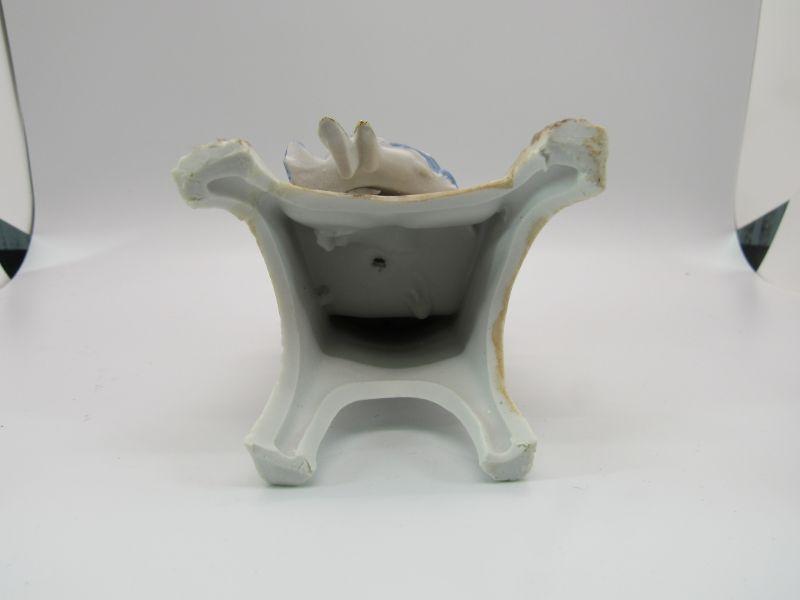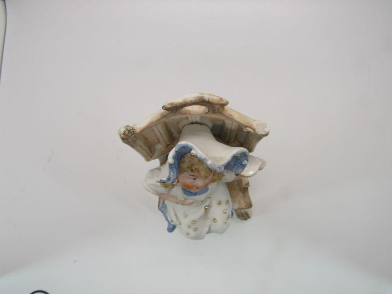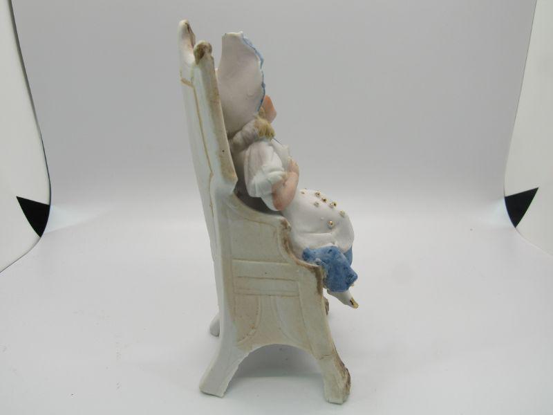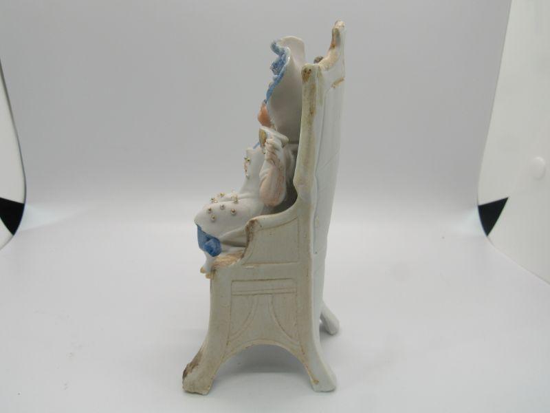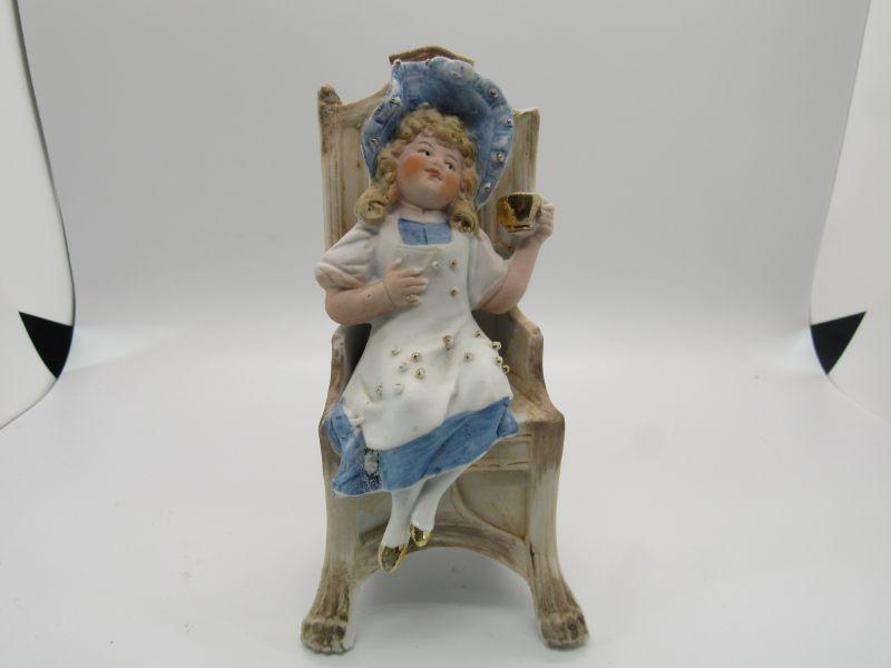 Figurine of Alice in Wonderland drinking tea while sitting in a chair. About 6" size. Chair has one leg with a rough finish. No chips noticed. #020-00200