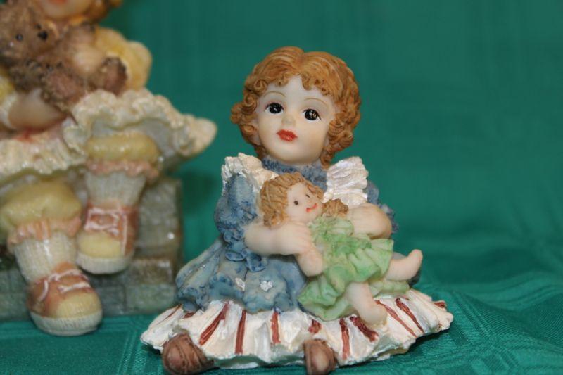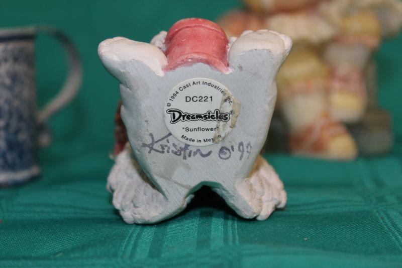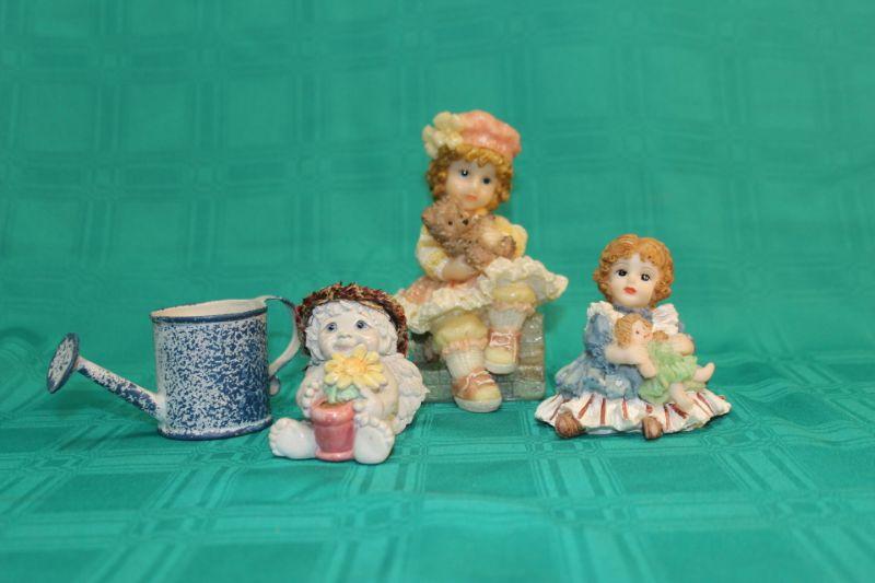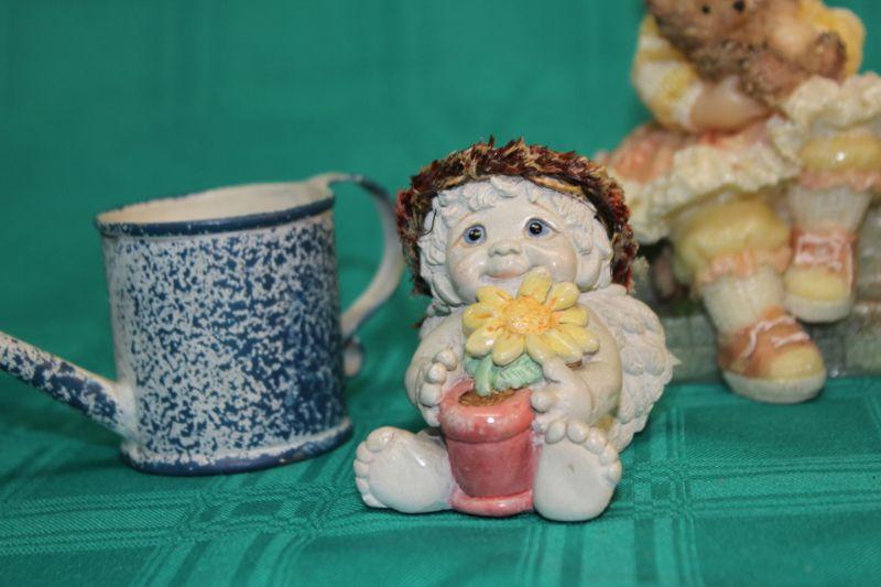 Small figurines and a little watering can. 4 piece lot. The small angel is signed.