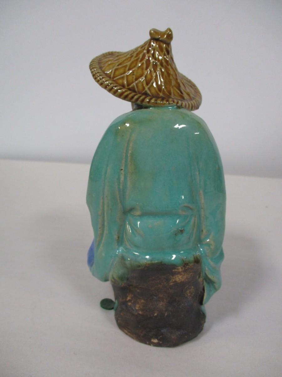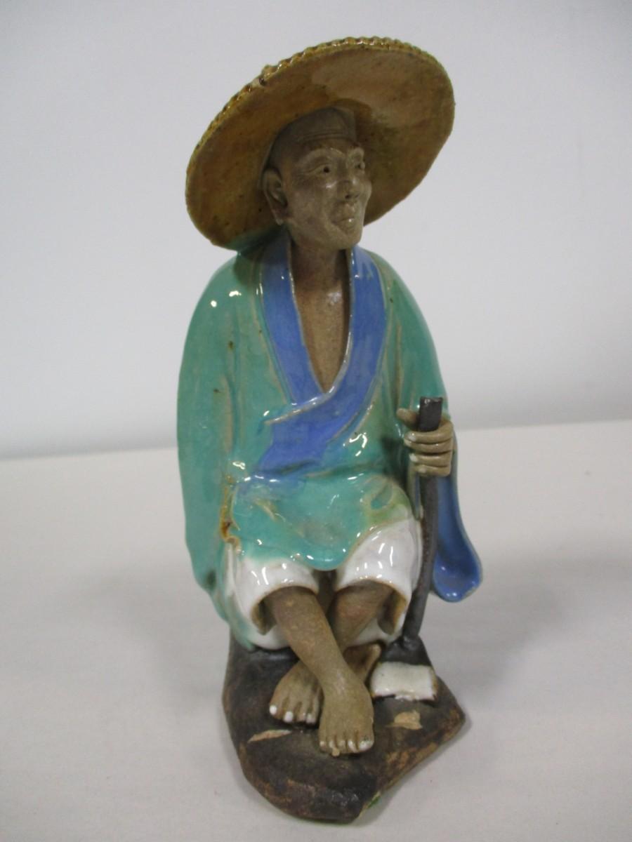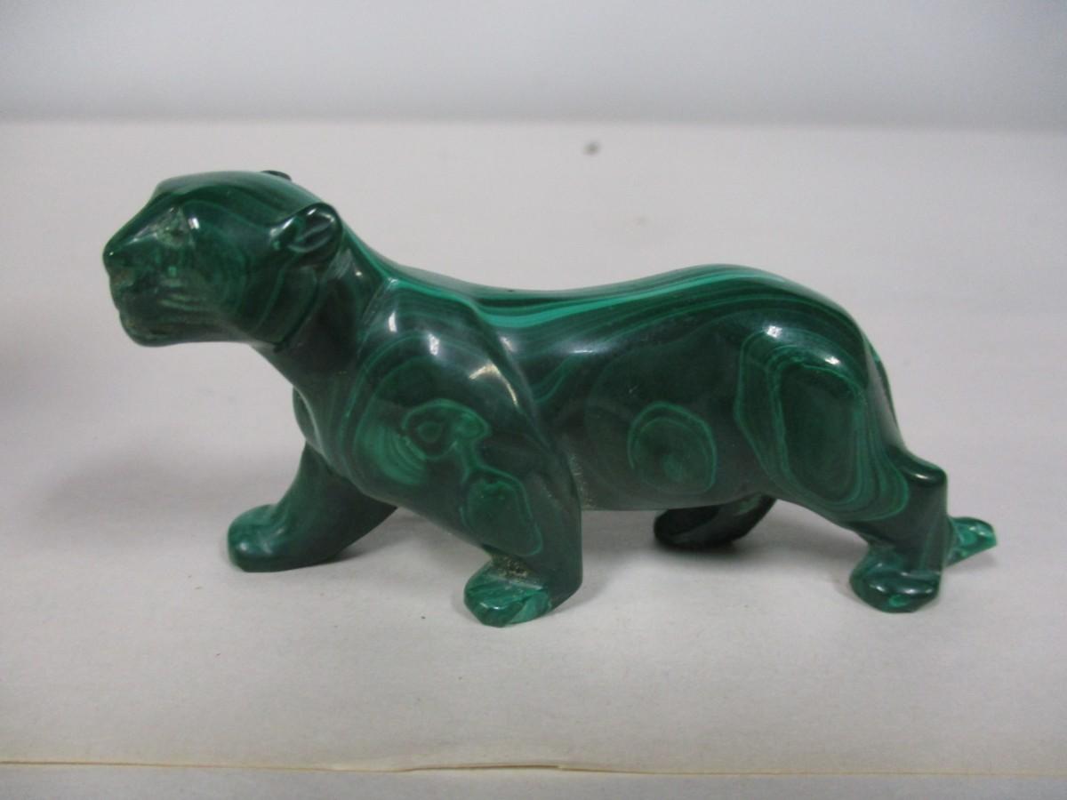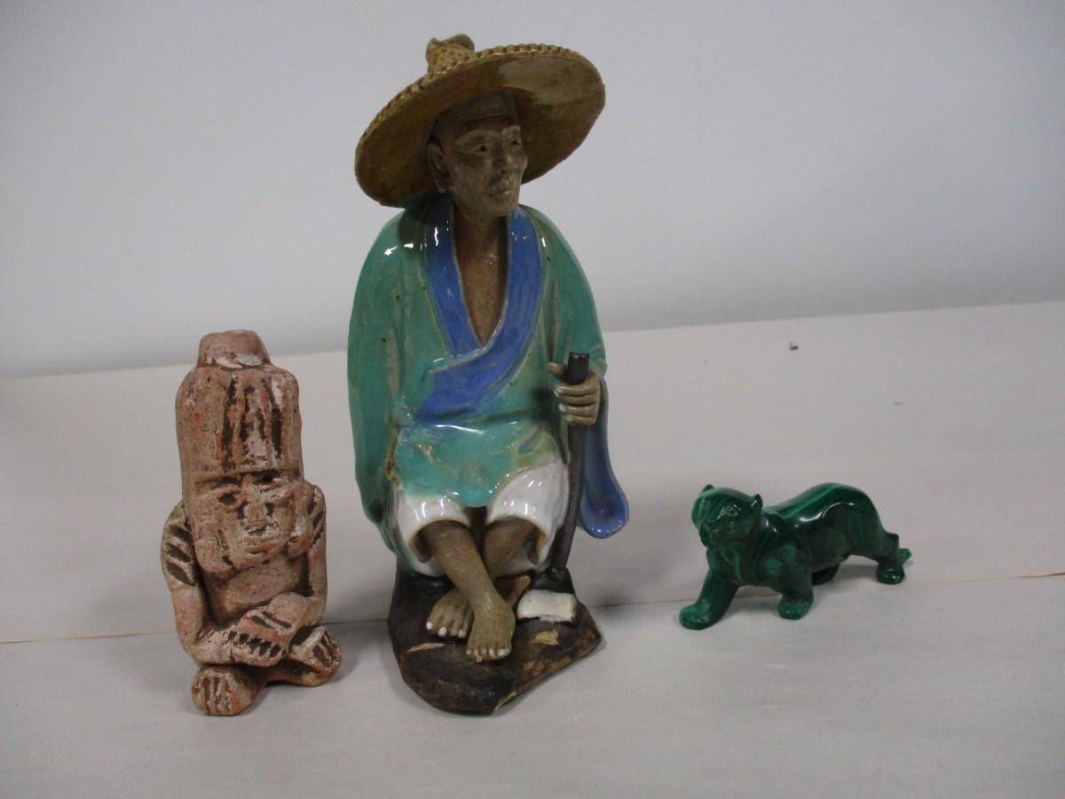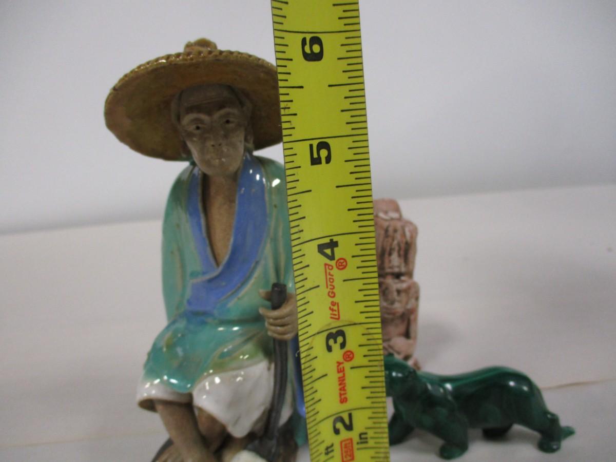 Malachite Carved Panther Figurine, Chinese Clay Ceramic Mud Man, and Other.