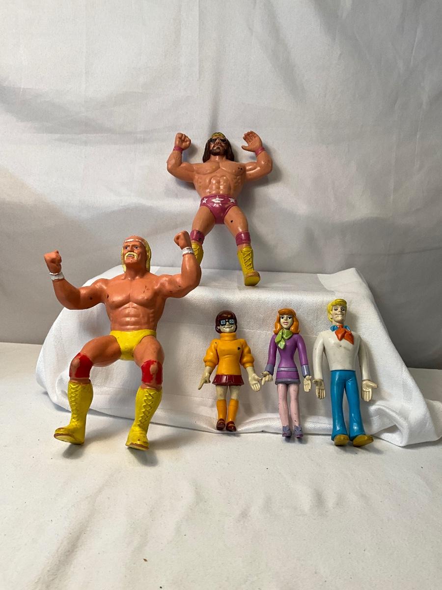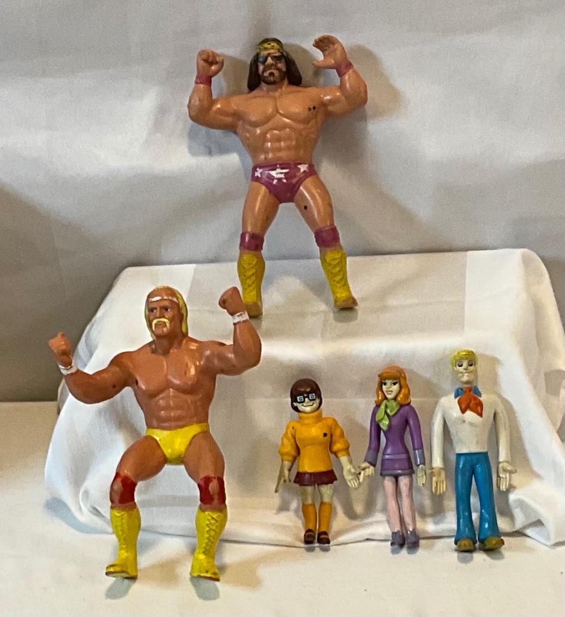 2 wrestling figurines 3 figurines from Scooby Doo