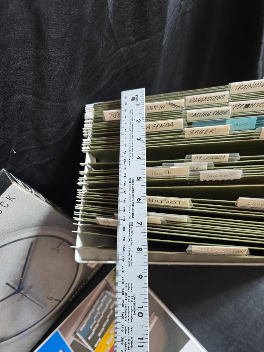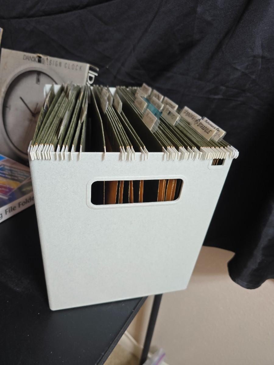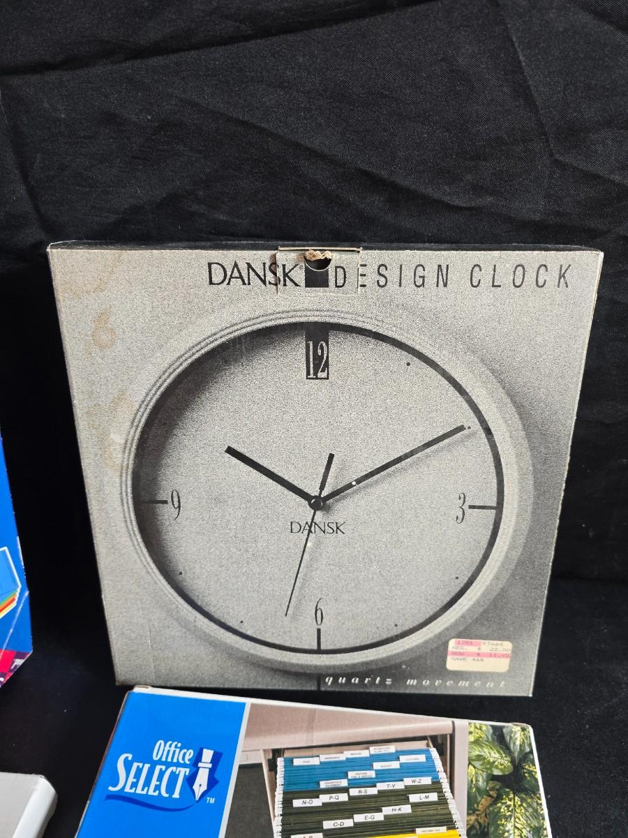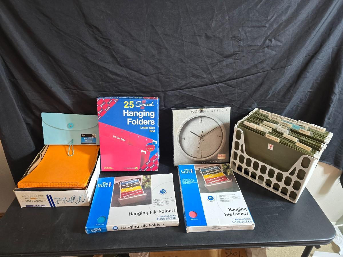 File box with new packages of folders and a nice wall clock