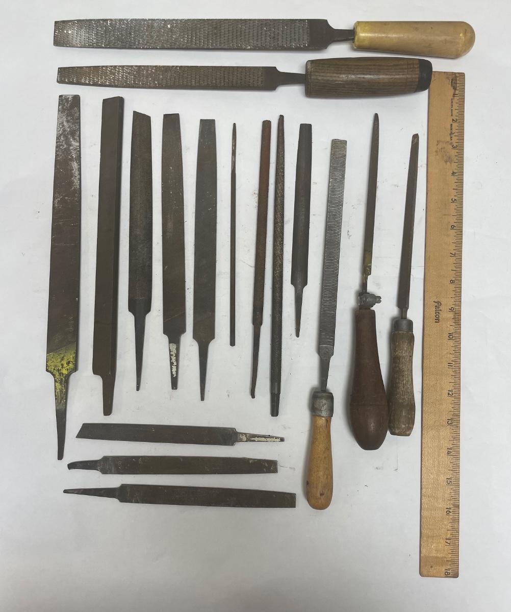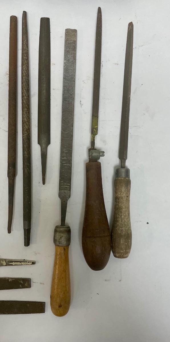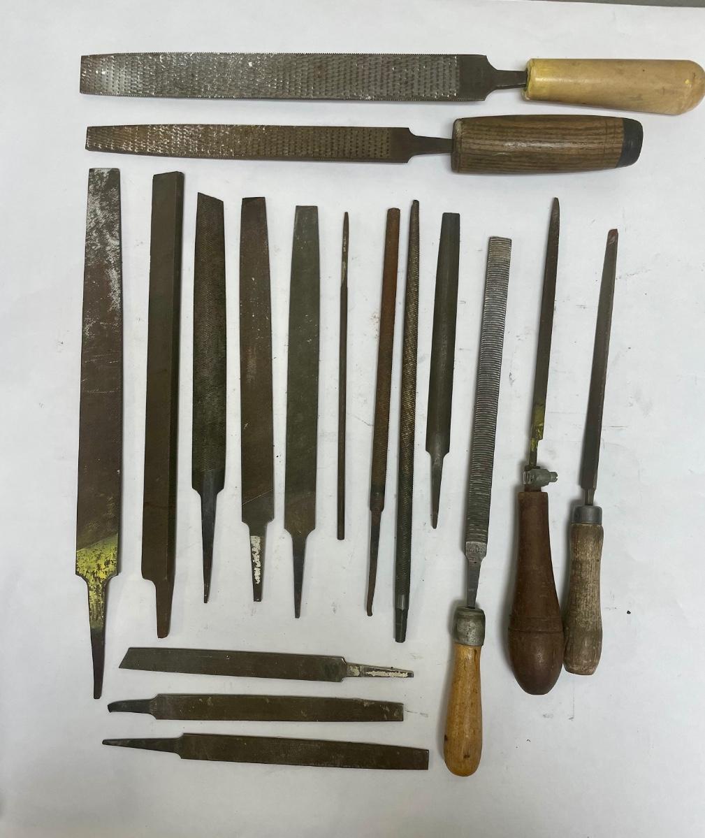 Lot includes 17 Pieces: 10 flat metal files, 3 rat tail files, 2 triangular files, and 2 wood rasp files with handles.
