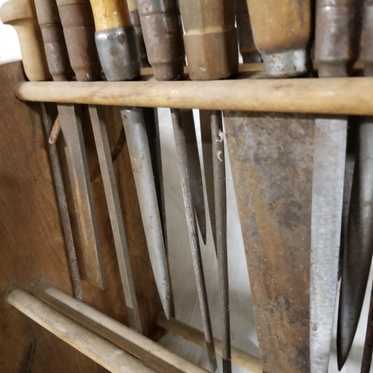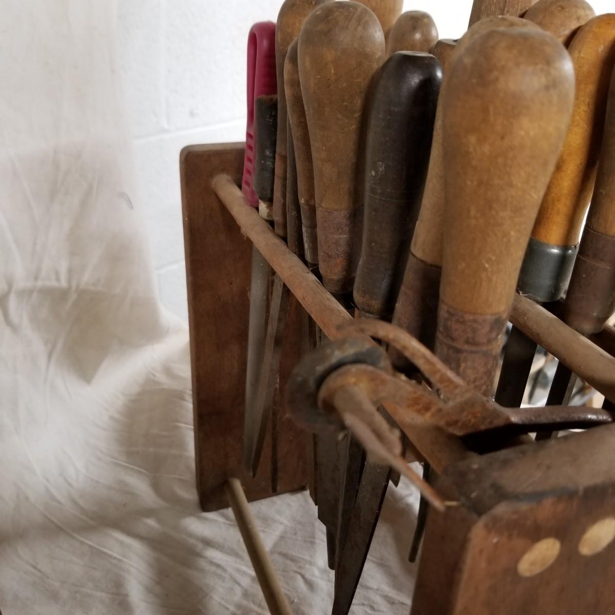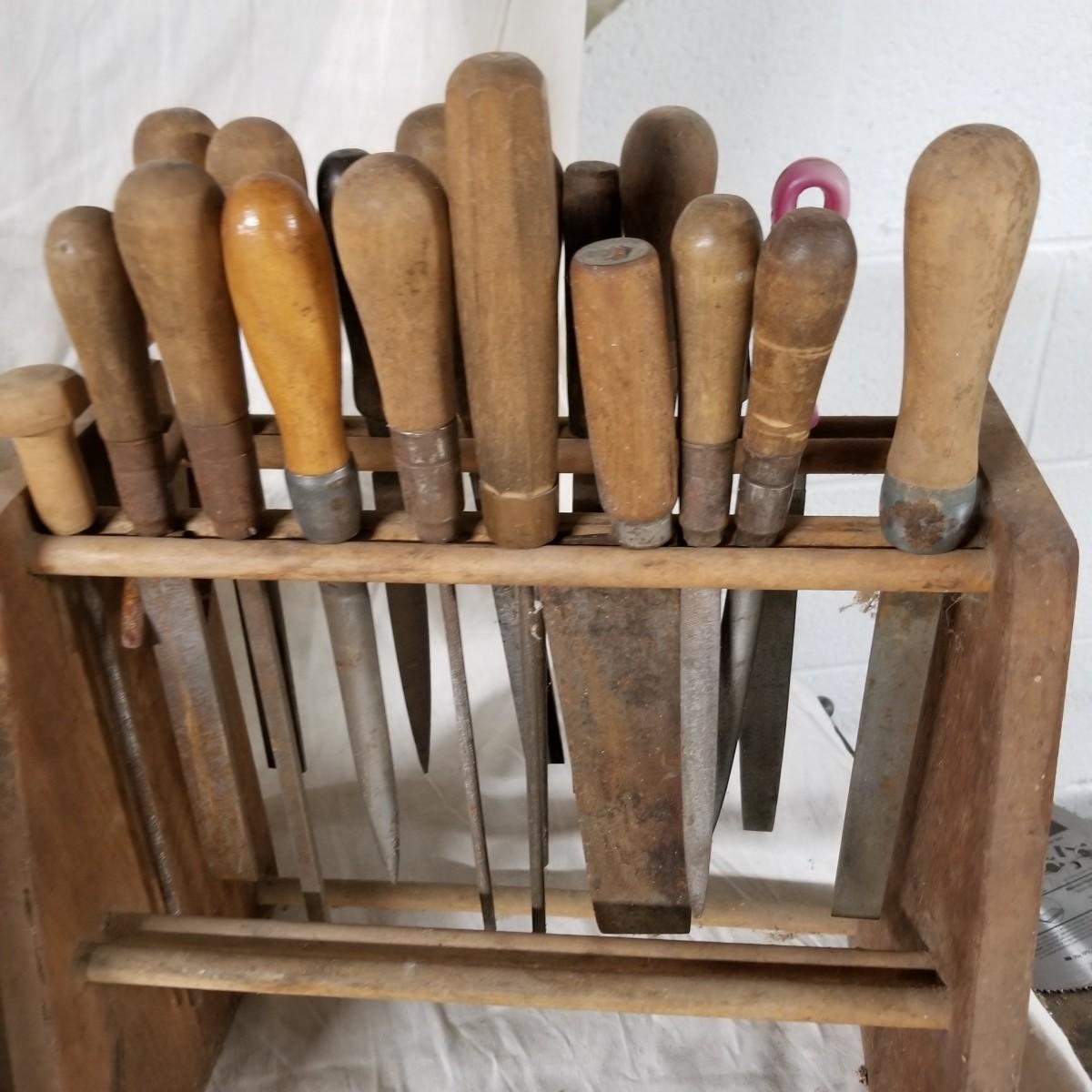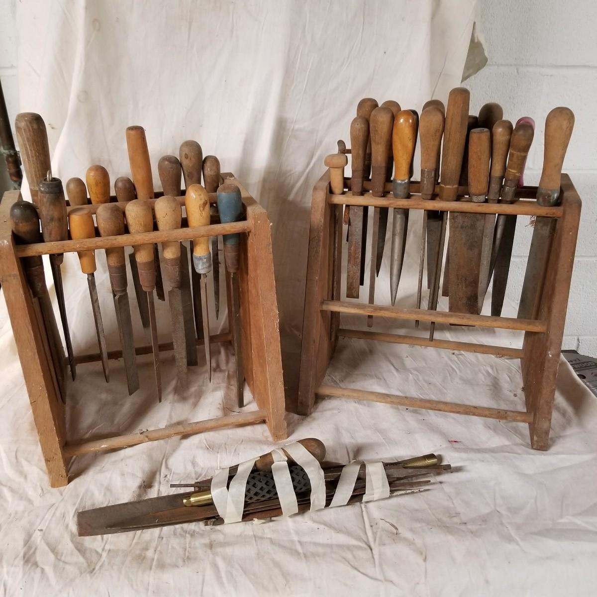 Two handmade racks with an assortment of files and rasps, plus a bundle of miscellaneous pieces. Longest item is 17". All used, in fair to good shape. Forty pieces + See pics for details. Local pickup only.
