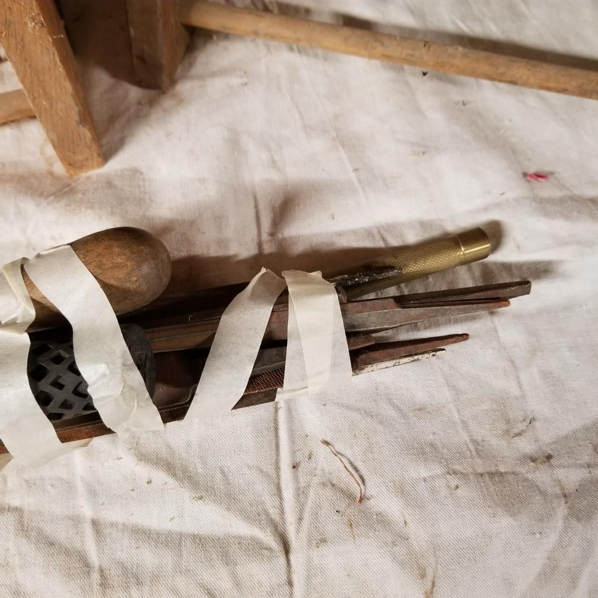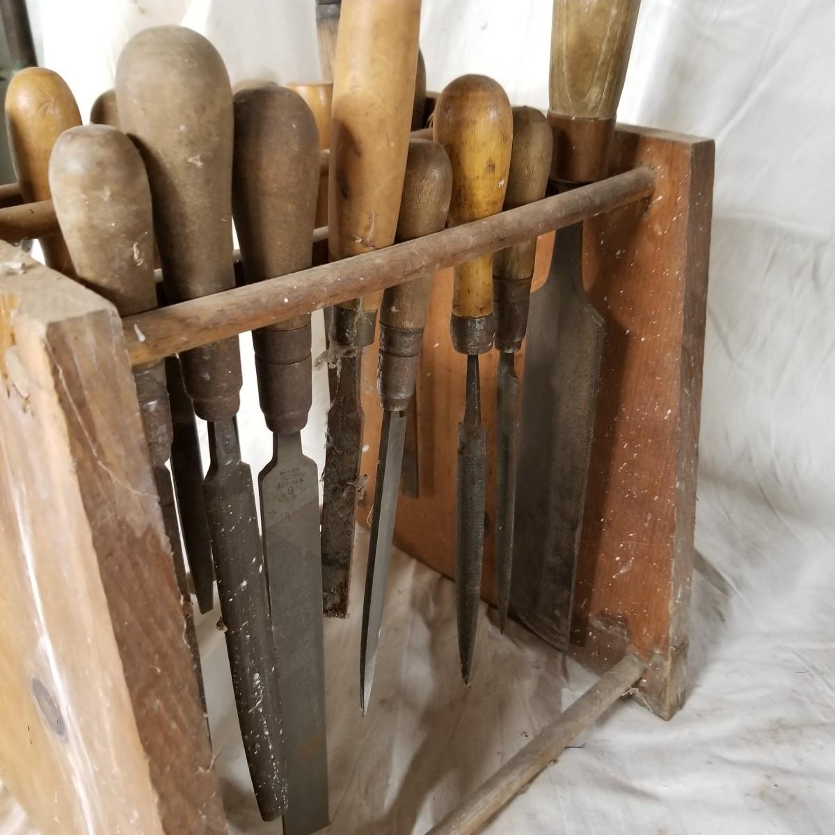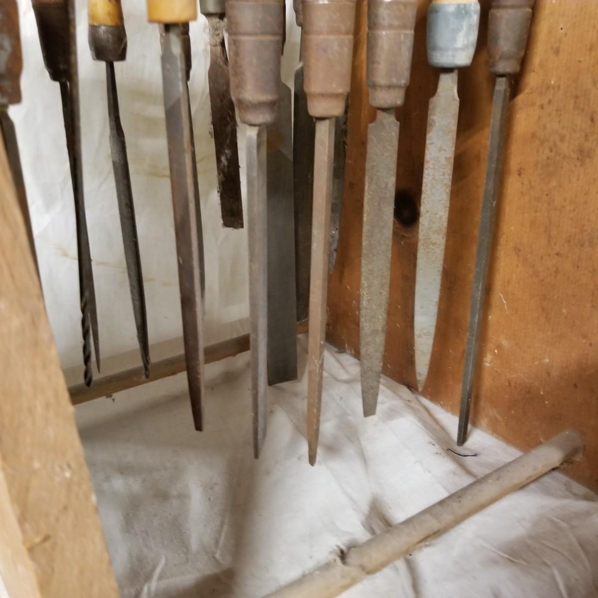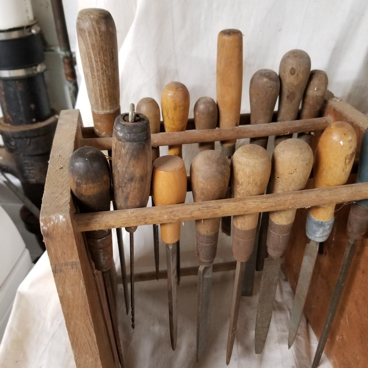 Two handmade racks with an assortment of files and rasps, plus a bundle of miscellaneous pieces. Longest item is 17". All used, in fair to good shape. Forty pieces + See pics for details. Local pickup only.
