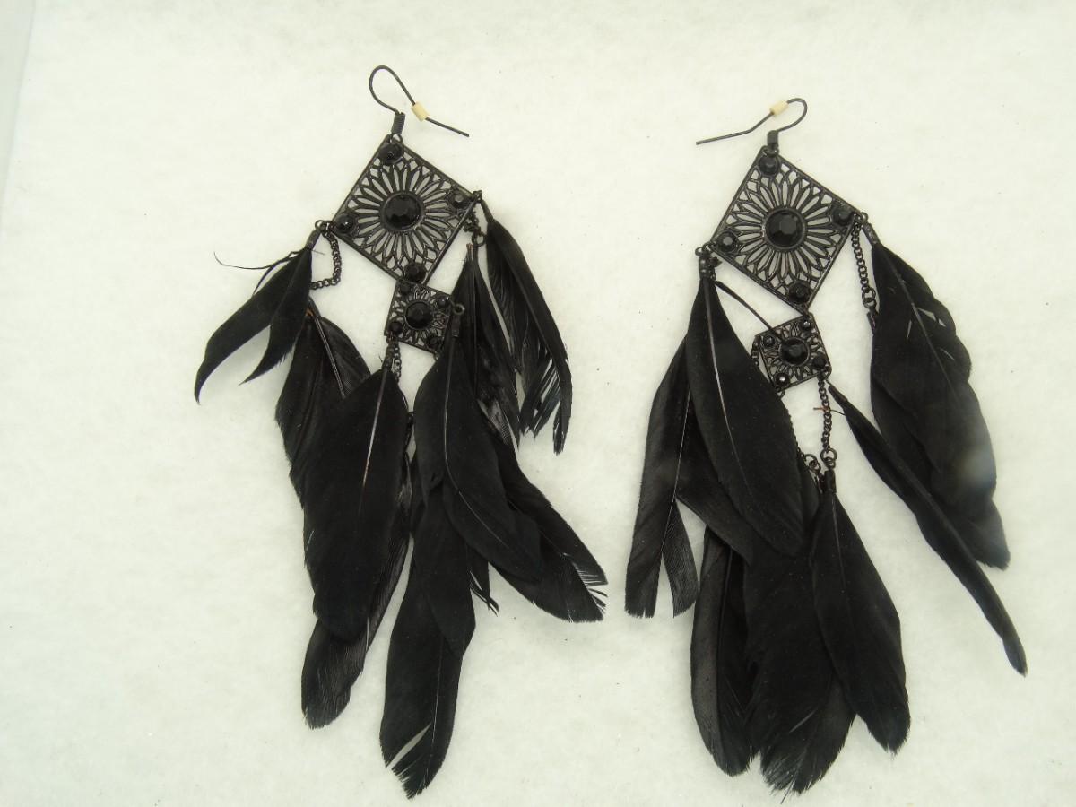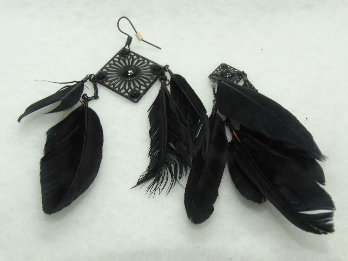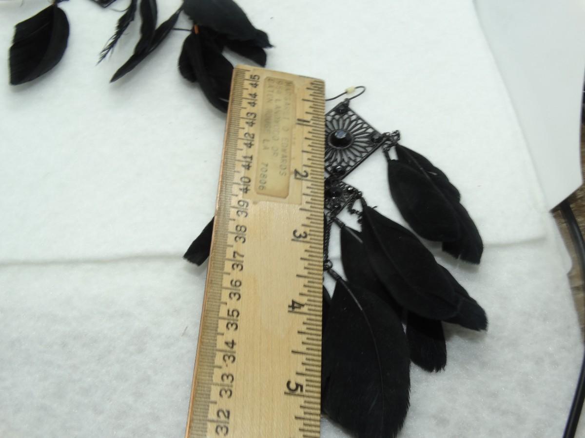 Filigree Black Raven Feathers, Dangle Feather Earrings (one of the feathers needs reattached)