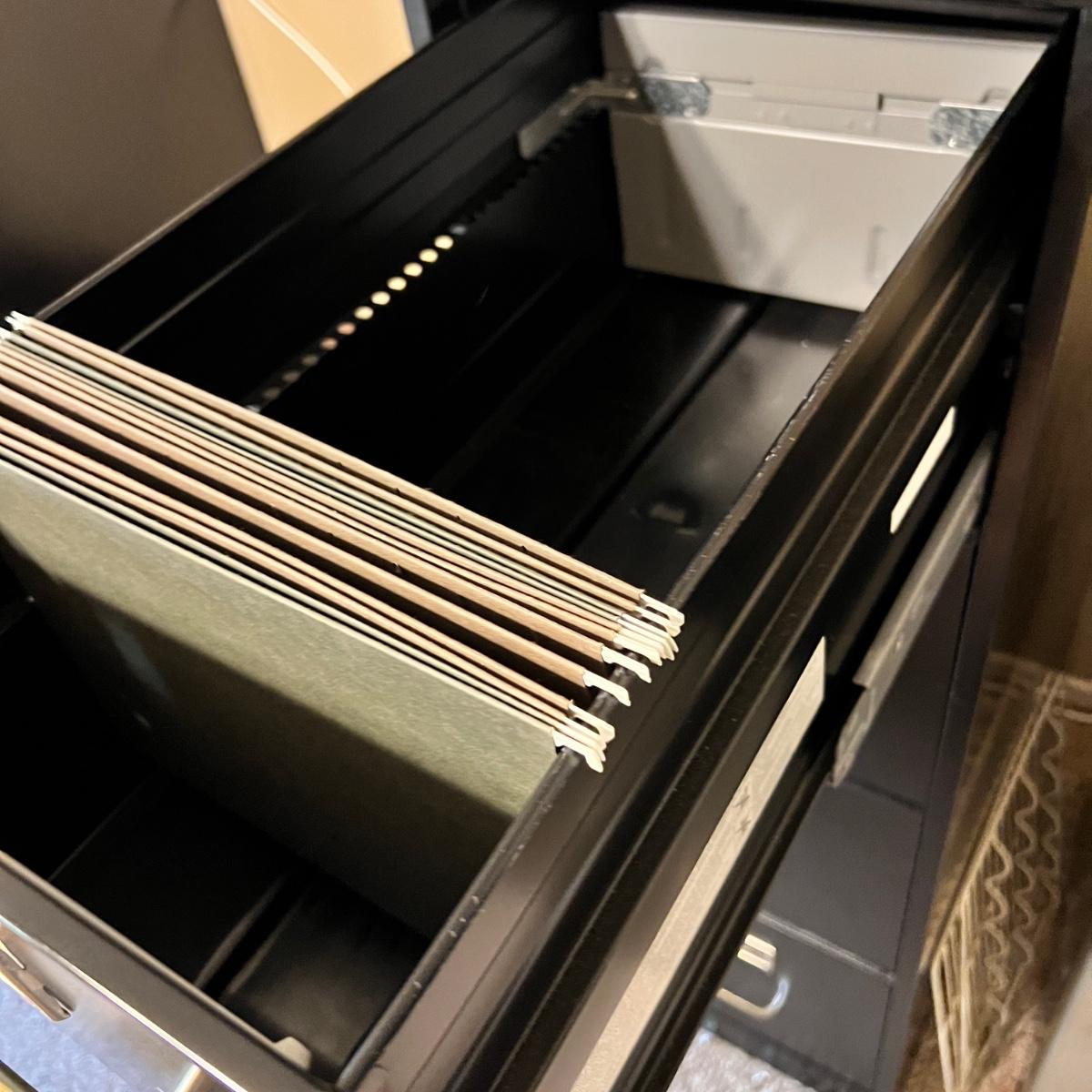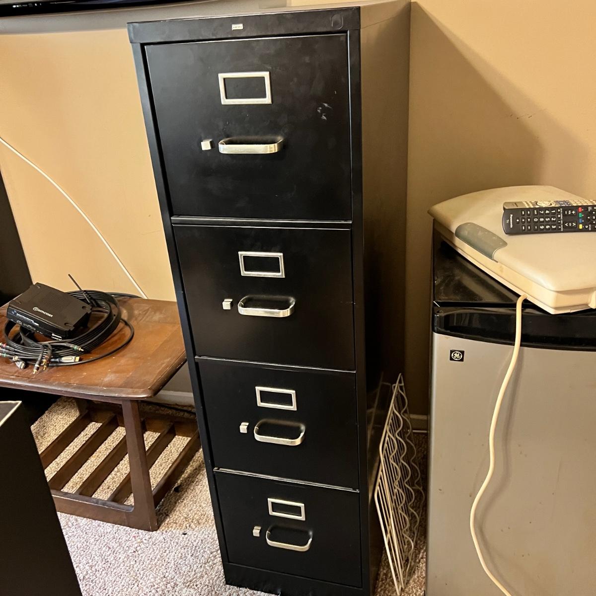4 drawers filing cabinet with hanging folders. 26.5"x15"x52" NOTE: PICK UP ONLY IN DUNKIRK MD.