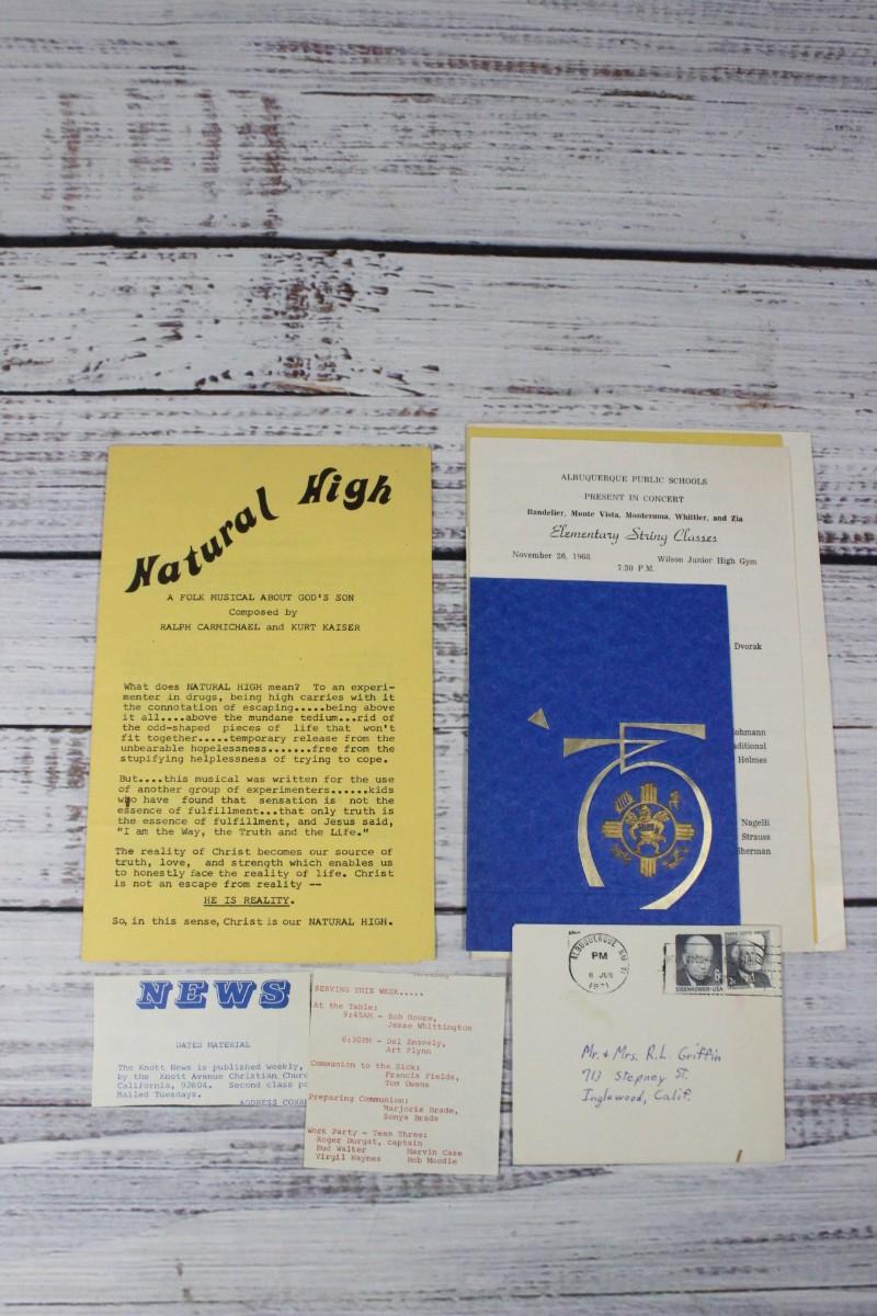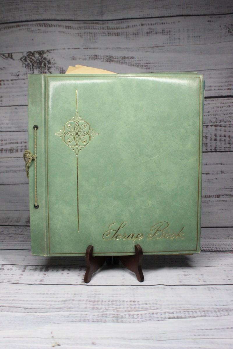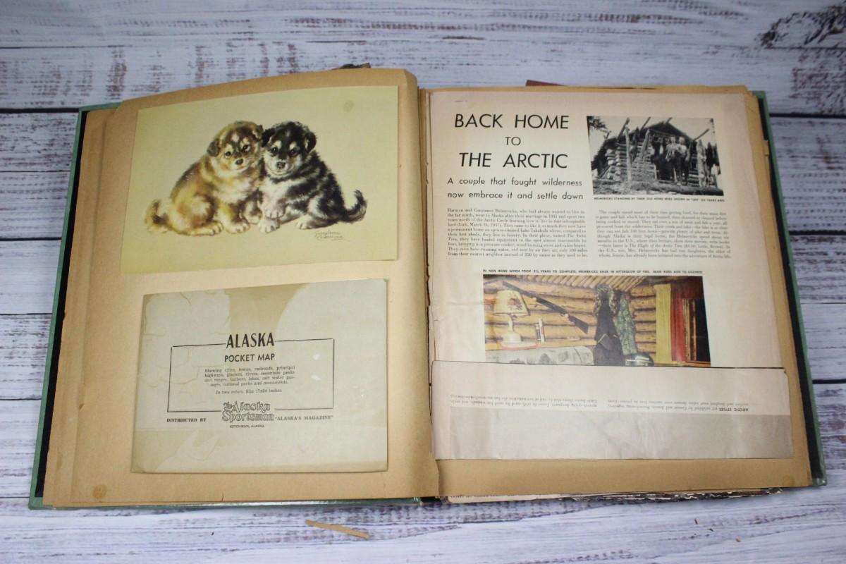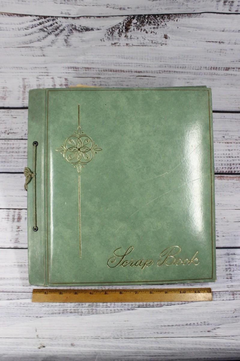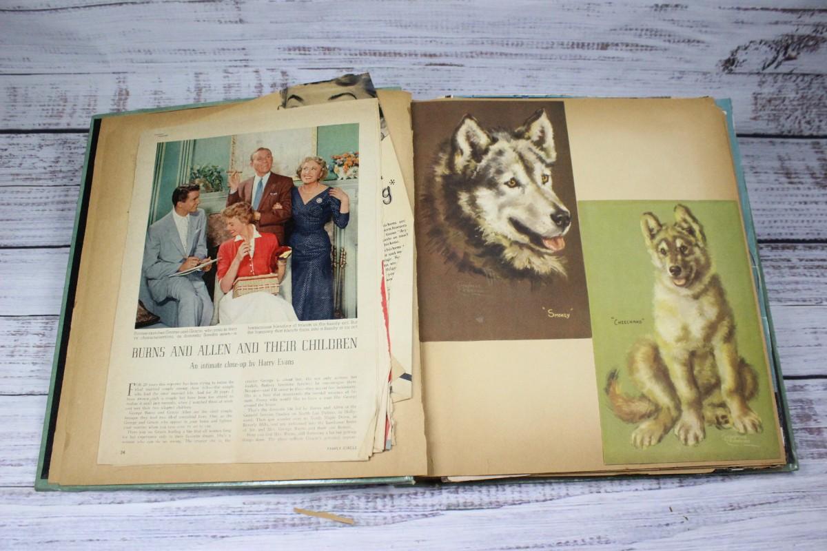 12" x 12" vintage scrap book filled with personal letters, newspaper clippings, photographs, maps, postcards, magazines and more. There is some ware on the scrap book, but there is no significant damage to the piece as well as the pages and contents included.