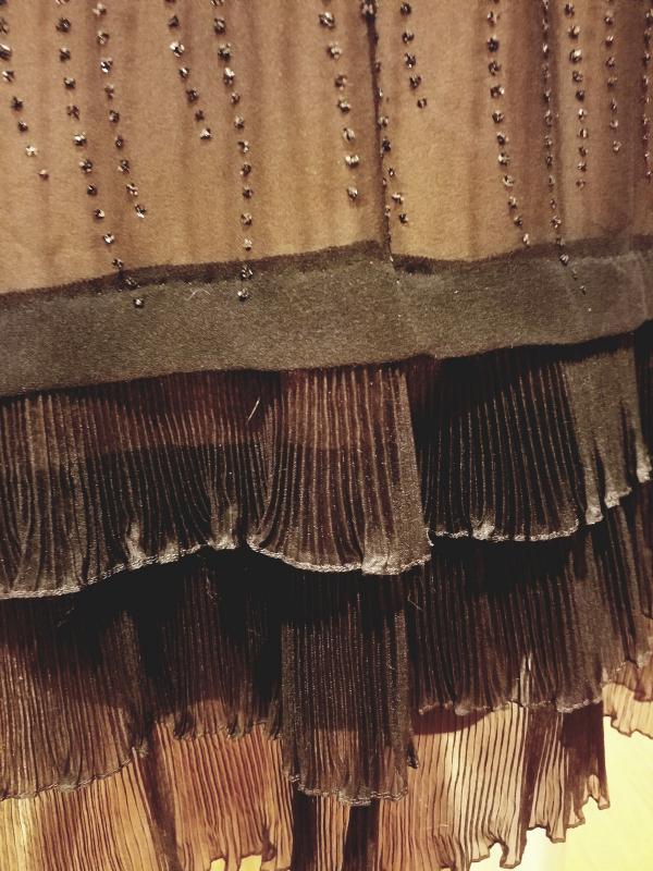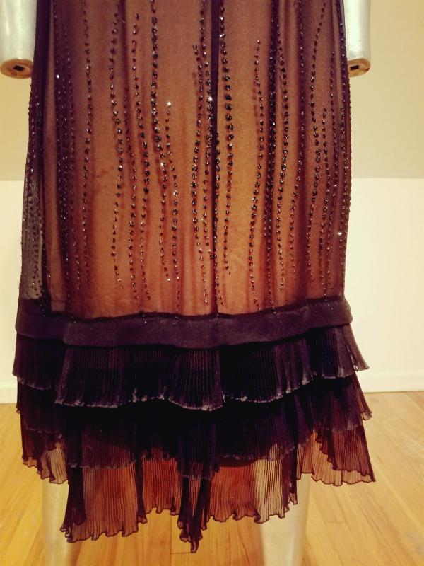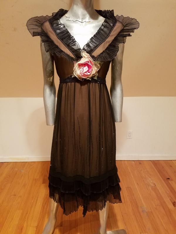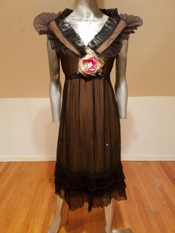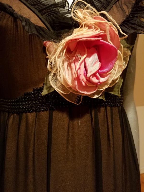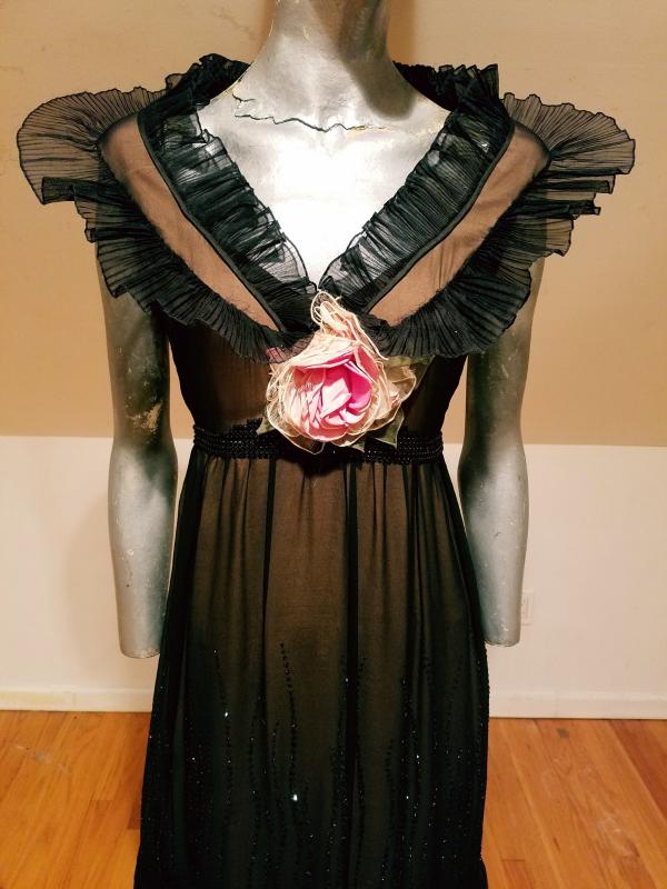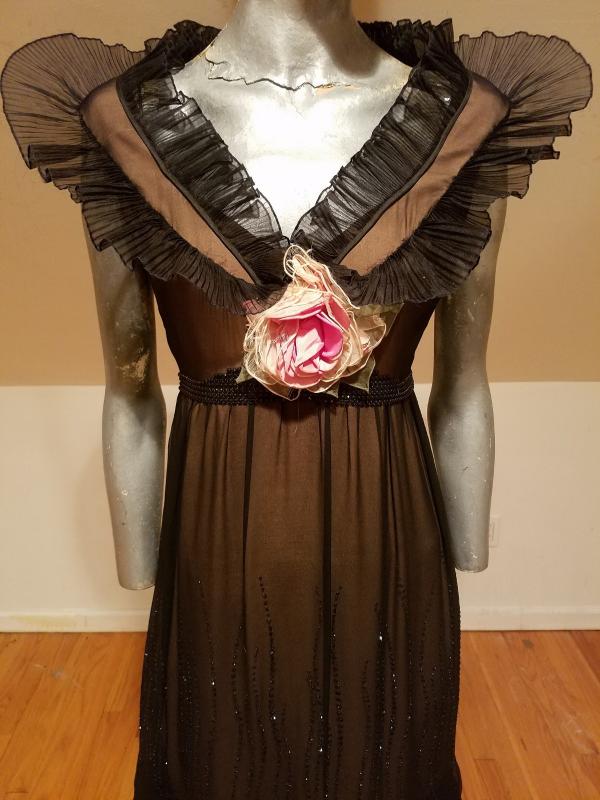 A beauty from the early 1960's. collar and hem are delphos pleat ruffle.Lined with skin colored illusion layer. And covered with tiny onyx radiance beads .The beautiful millinery front flower is frayed on the outside but the main flower is still ok.