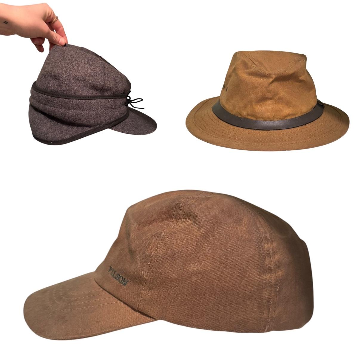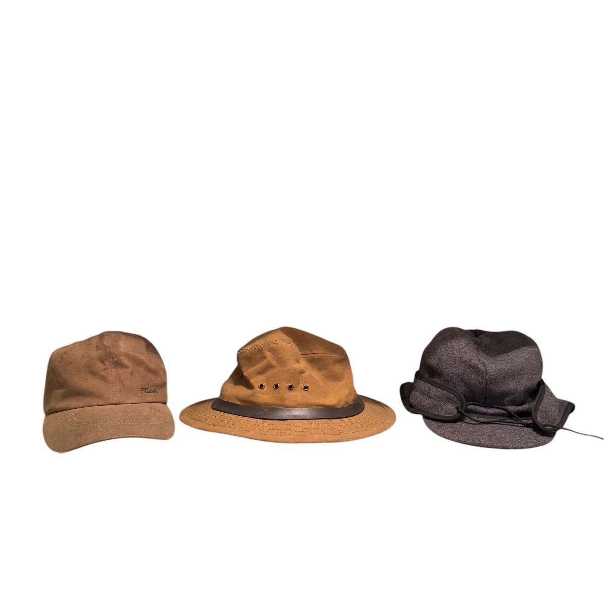 Lot includes two Filson hats and one Stormy Kromer hat. The Filson hats are size medium and the Stormy Kromer is a size 7 1/8. The Filson hats need a good cleaning, but they’re in great shape otherwise. Shipping available.