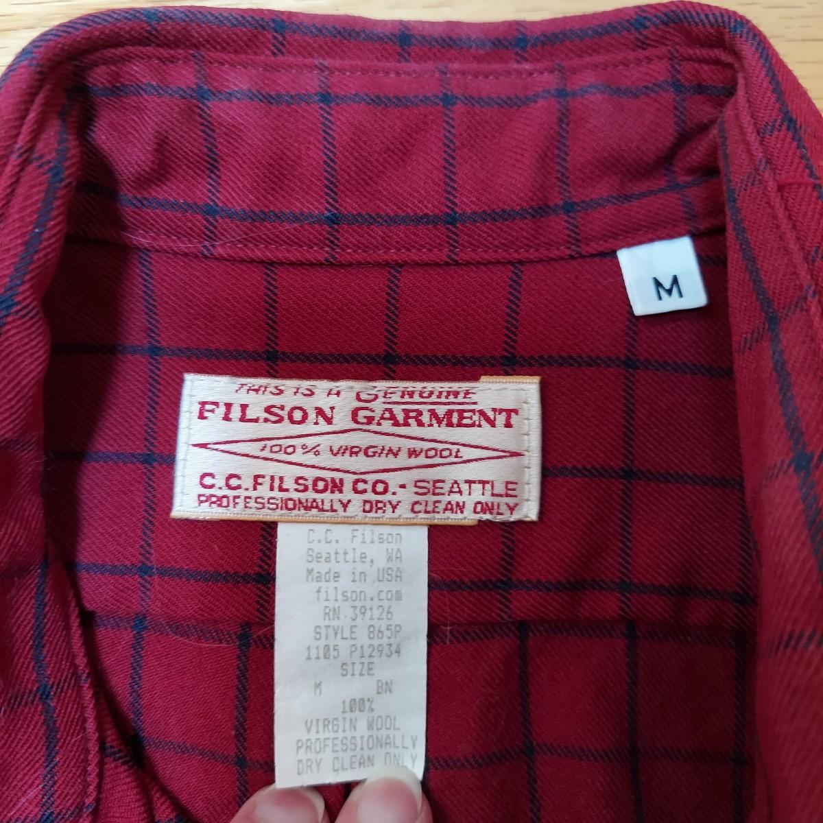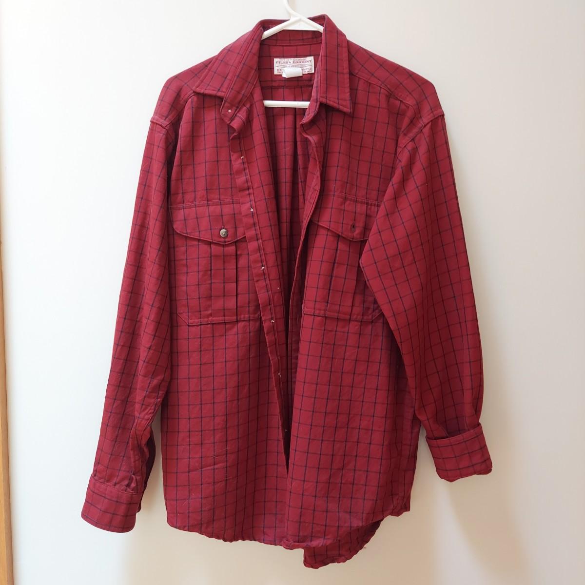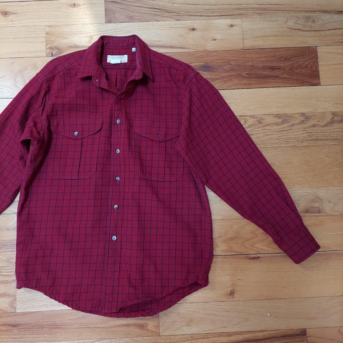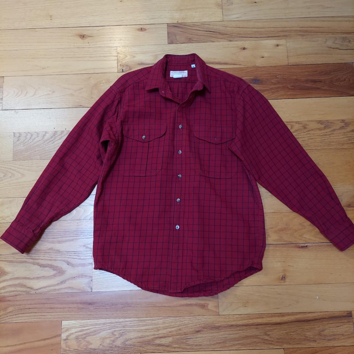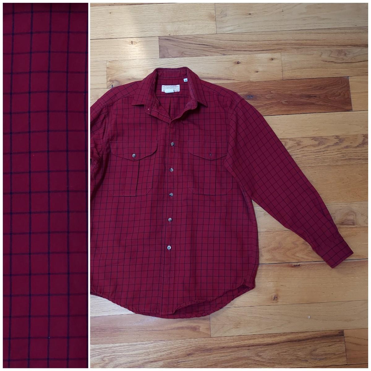 Heavyweight button down wool shirt with check print by outdoor wear brand Filson. Size medium. Please see photos for details. Shipping available