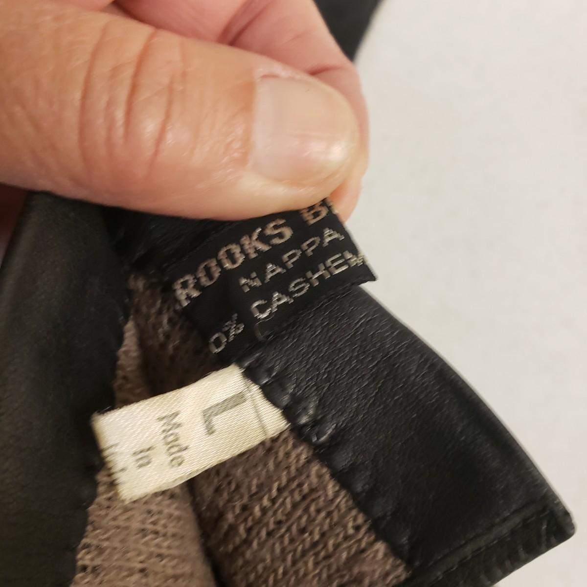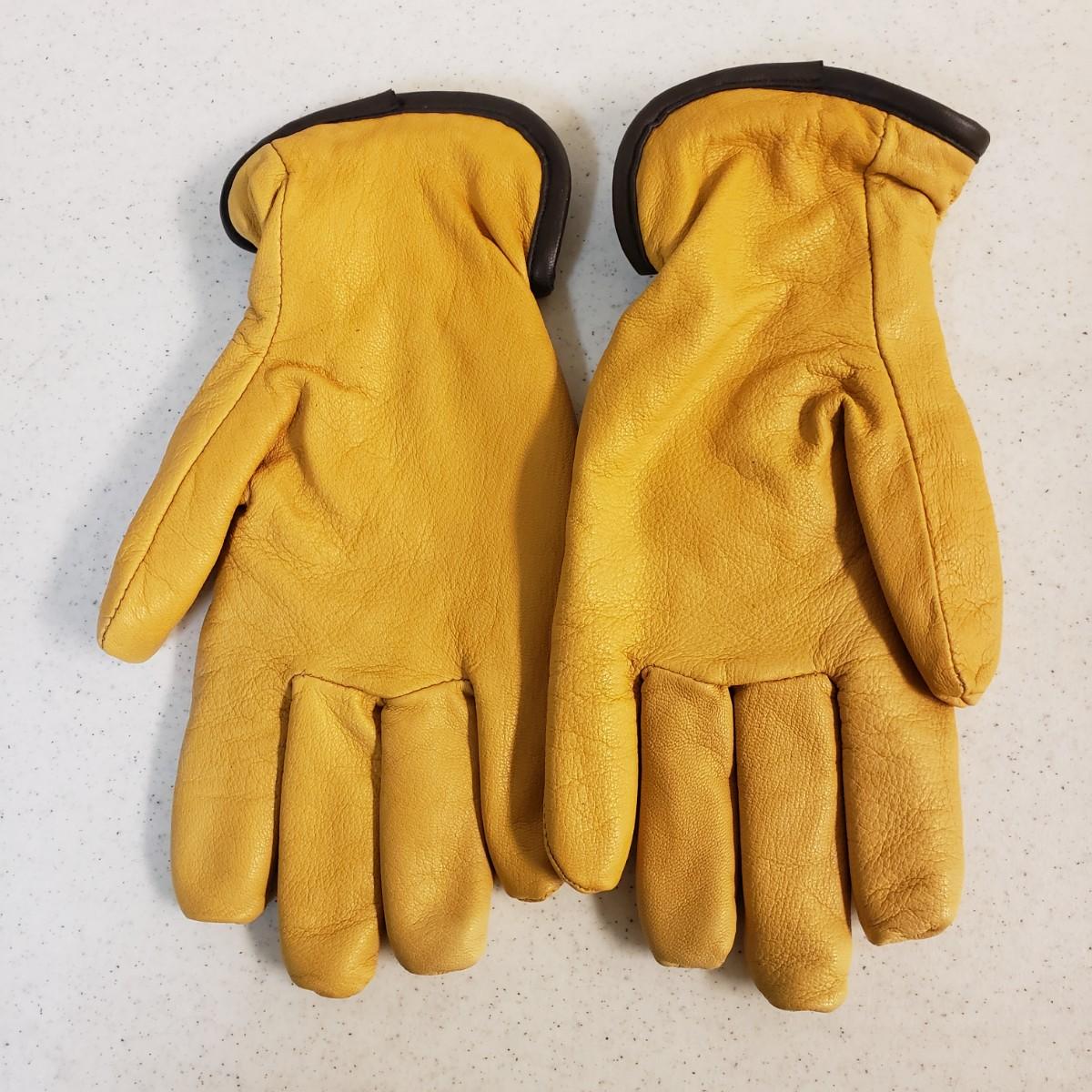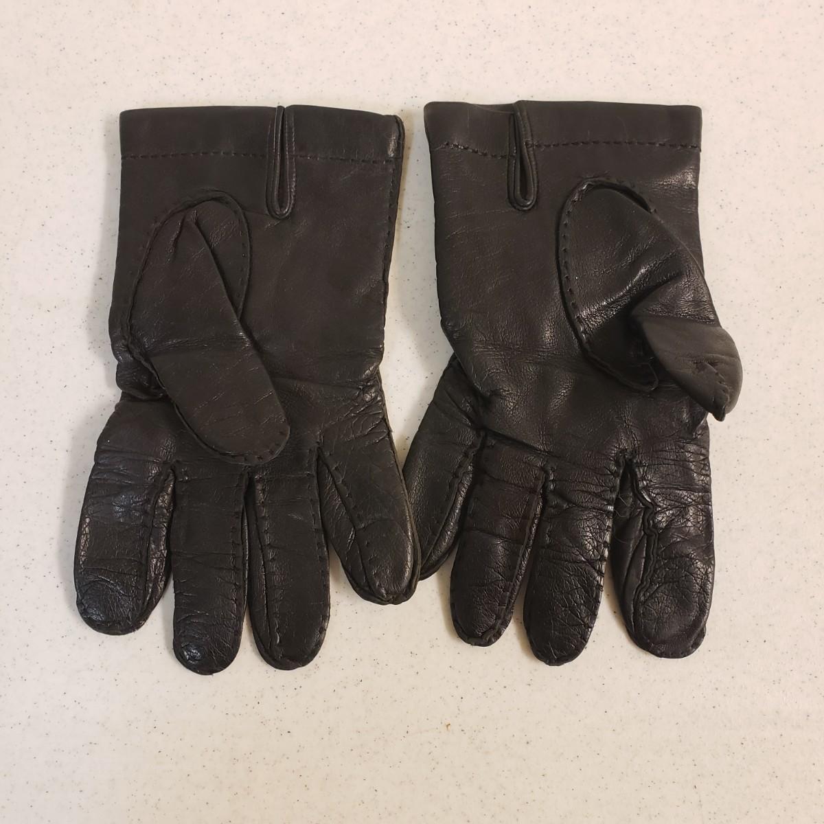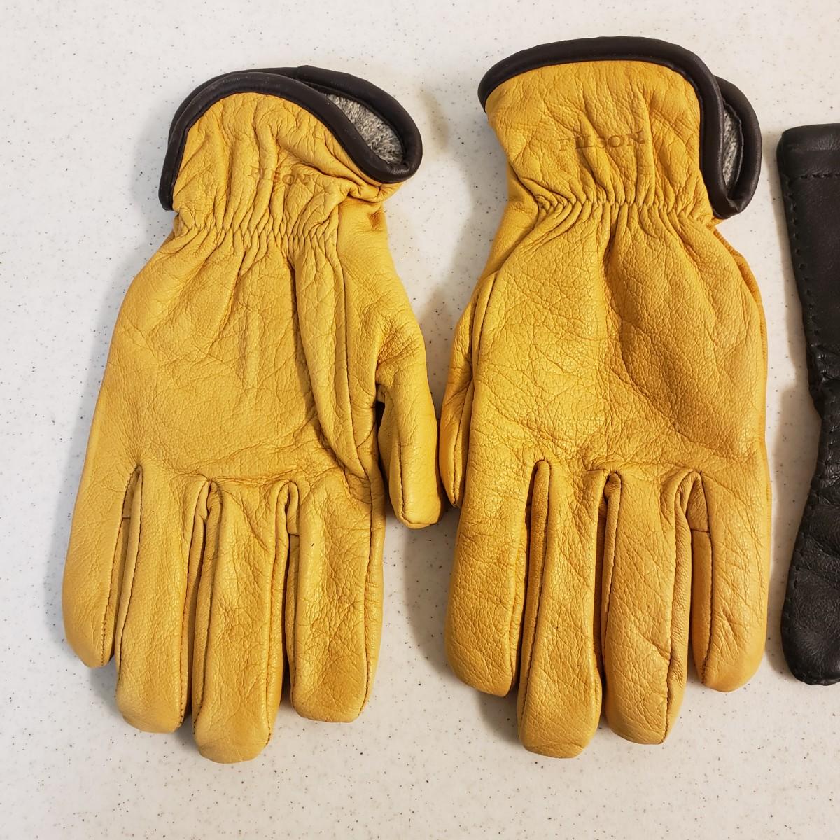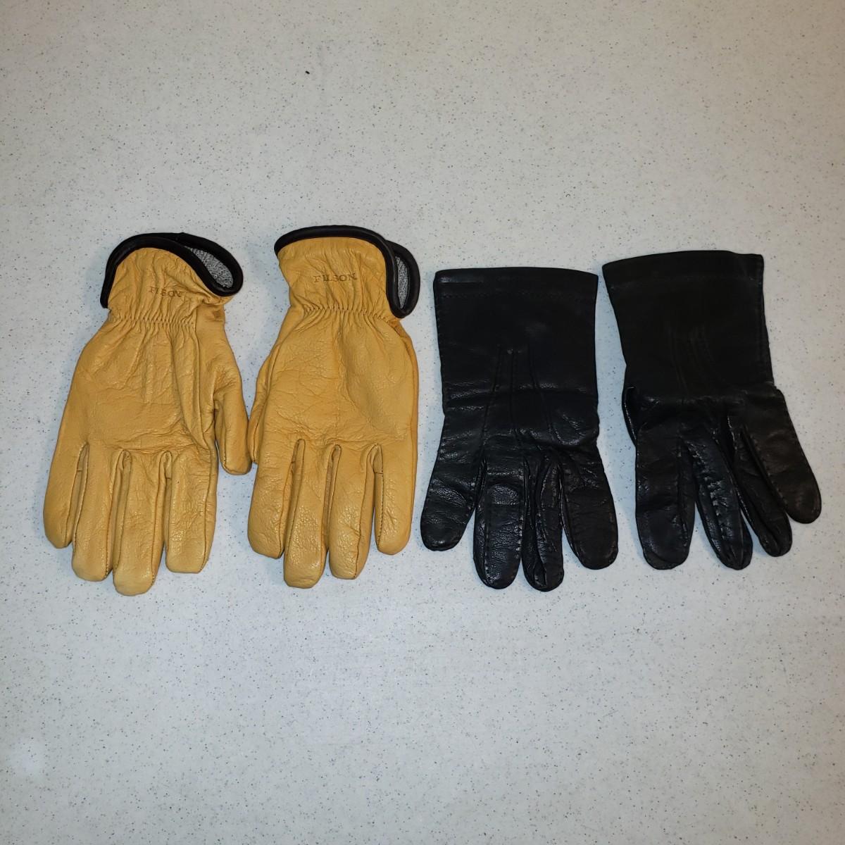 The Filson gloves are a soft leather with a cotton blend lining. There is to tag to indicate size. They measure 10" x 4". The black leather Brooks Brothers gloves are lined with a cashmere lining. The tag says "L".
