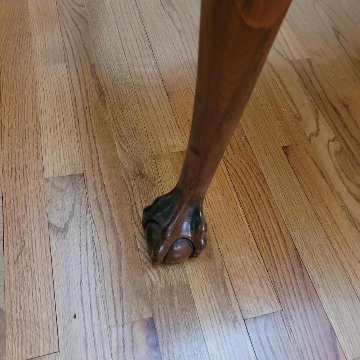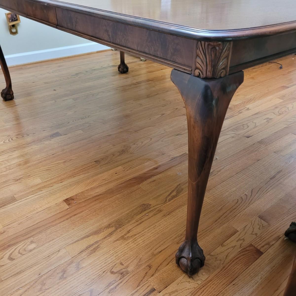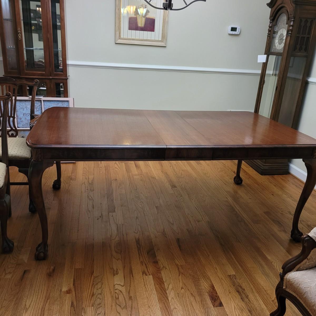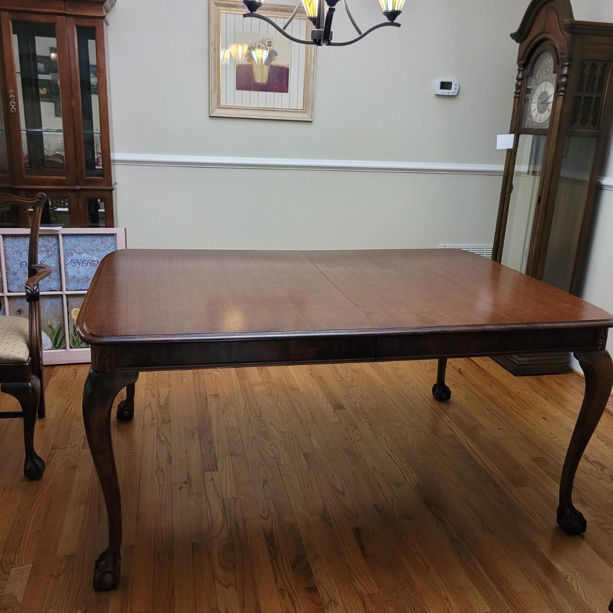 Beautiful claw foot dining table by Finch Fine Furniture comes with one middle leaf. Very few marks and scratches (see photos). Measures approximately 64" x 44" x 30"H. Leaf measures approximately 12" x 44". Local pickup only. Winning bidder must bring assistance to help move and load this item due to its weight and size.