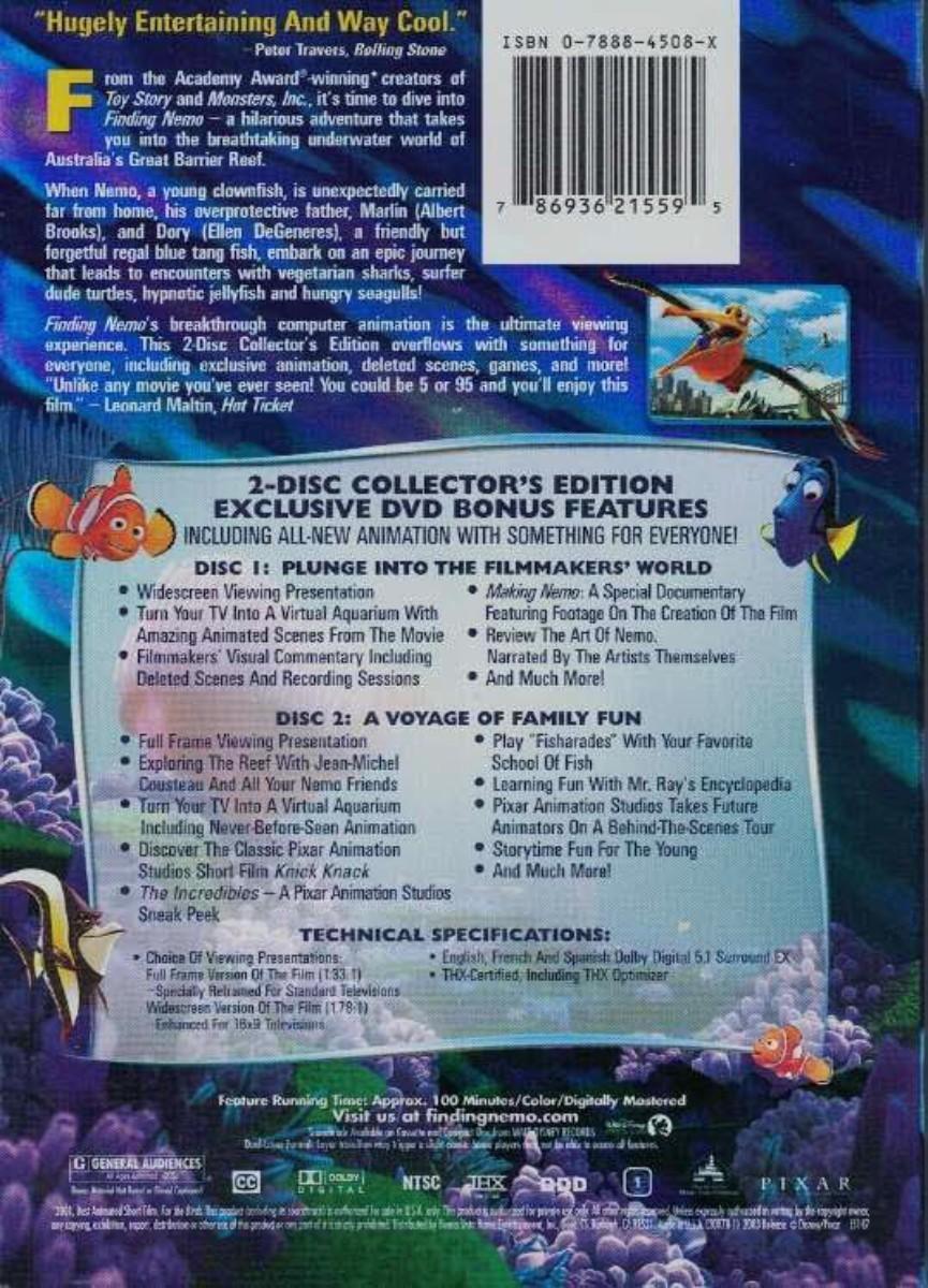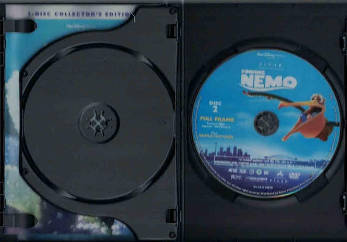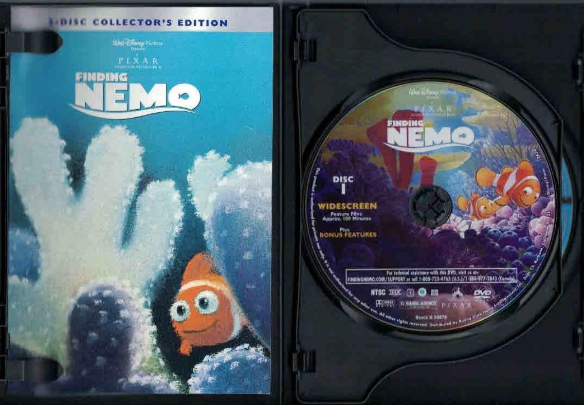 Finding Nemo, Disney movie DVD 2-Disc Collector's Edition DVD movie. Full length movie in both wide screen and full screen versions. Includes lots of Bonus Features and fun stuff. W/original cover sleeve. Complete your collection, Shiny bright discs. Near Mint condition.