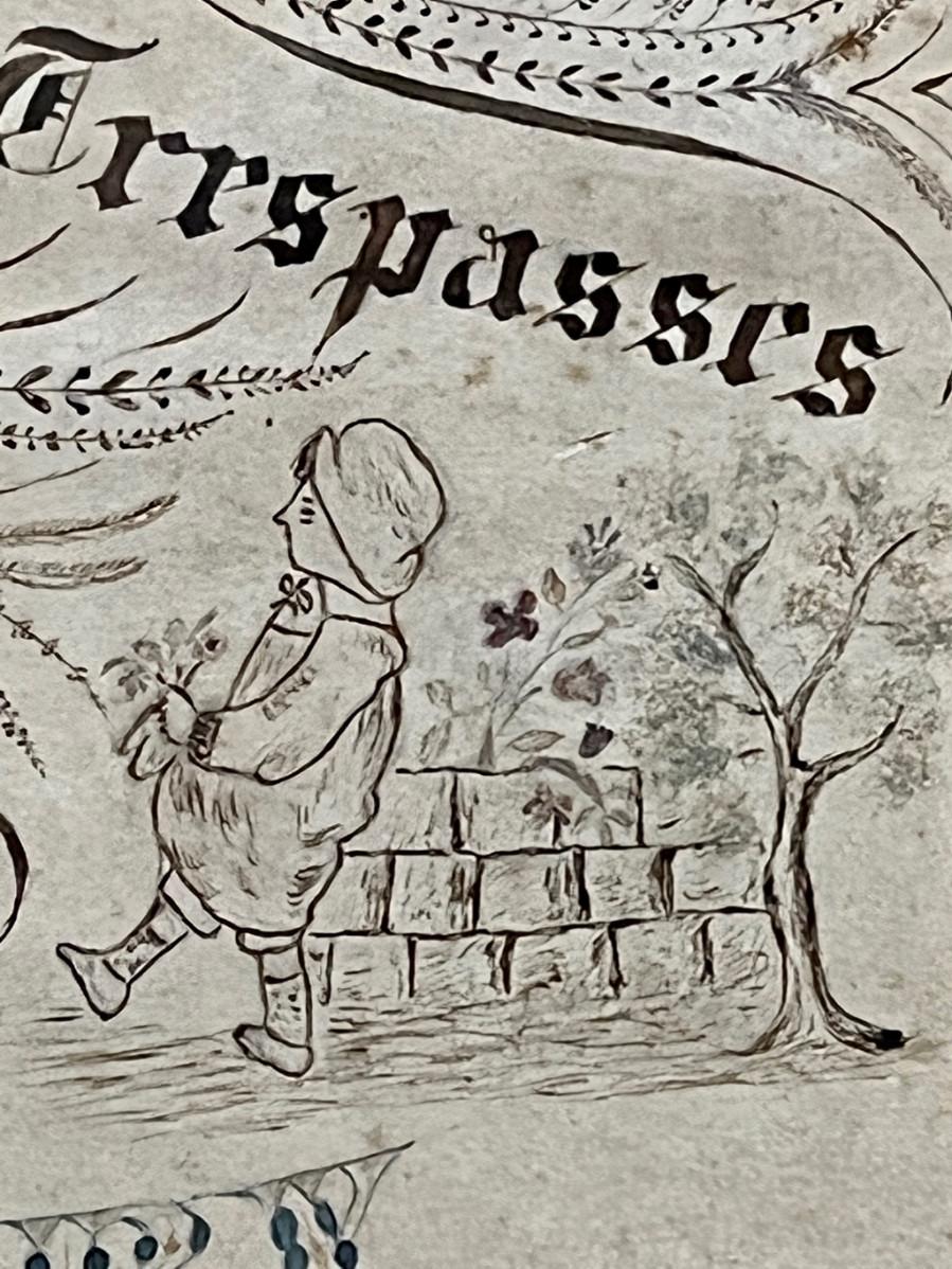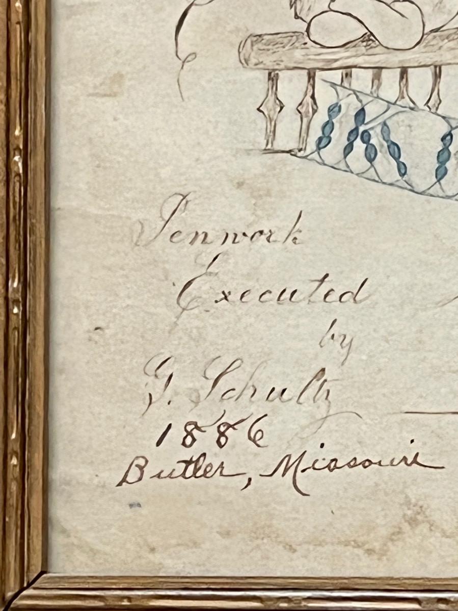 Hard to find in this fine condition, the subject item is a fine 19th C Spencerian penwork calligraphic drawing of the Lord’s Prayer laid out on a large sheet of paper embellished with charming children, birds, angels in one of THE most creative and passionate renderings we’ve seen. Hand written and drawn by G. Schutz in Butler, MO, (lower left) the piece displays the 19th C obsession with penmanship and is under glass, surrounded by a simple gilt wood antique frame. 18.5 x 22.75” framed, 15.75 x 20” image. Please note, there are some reflections in the glass that are not what is in the drawing.